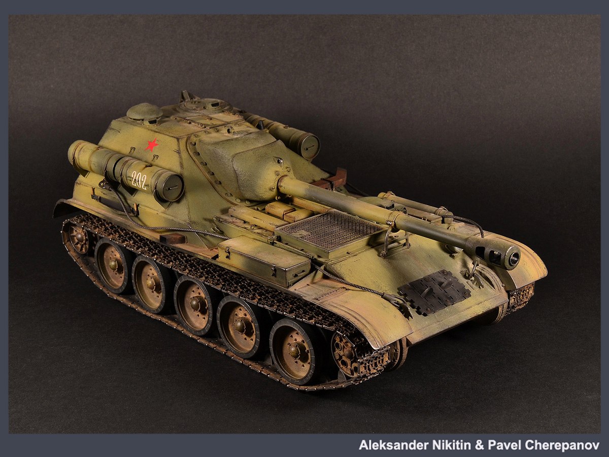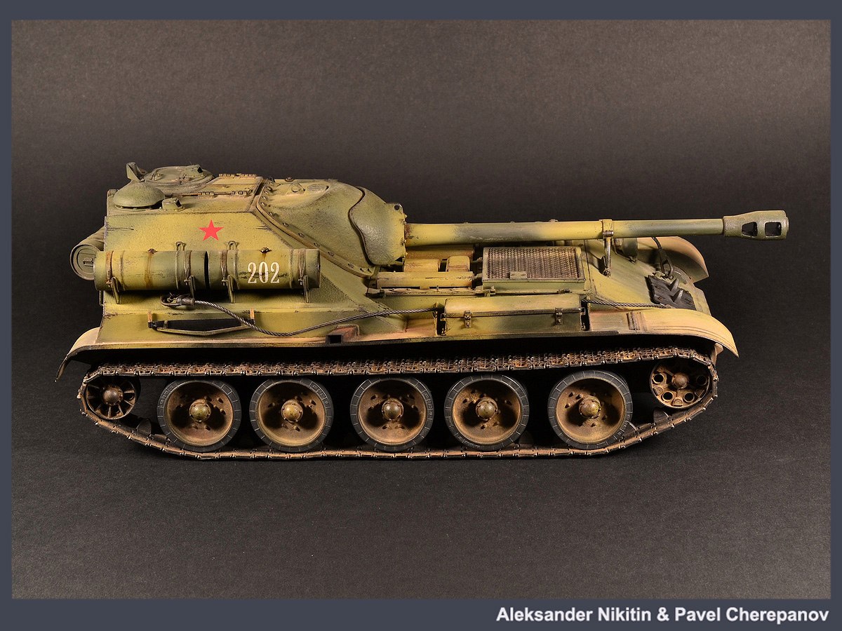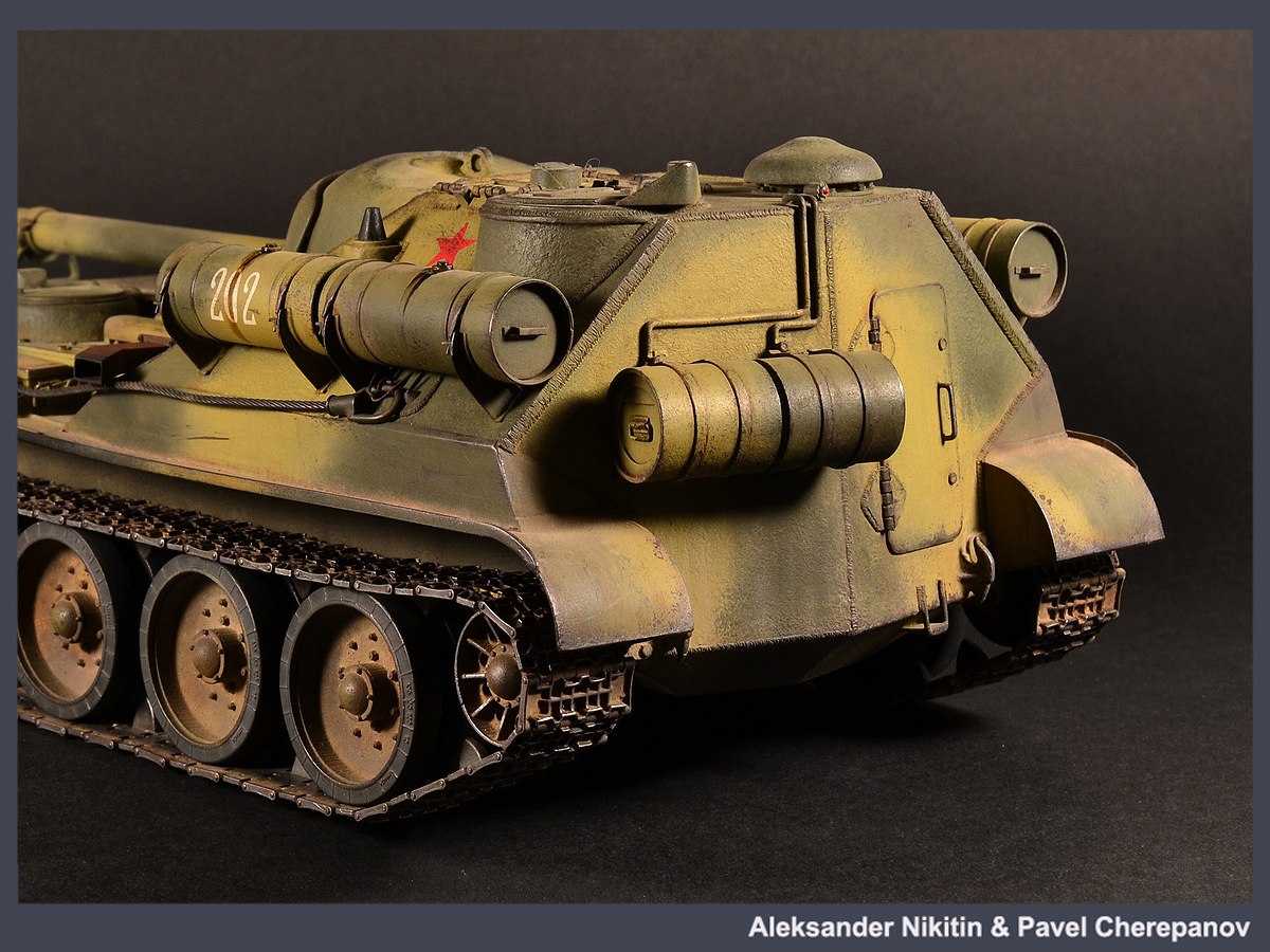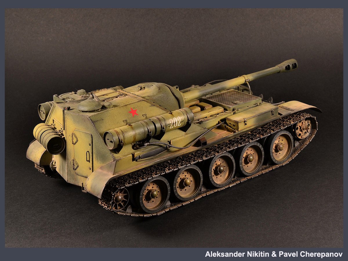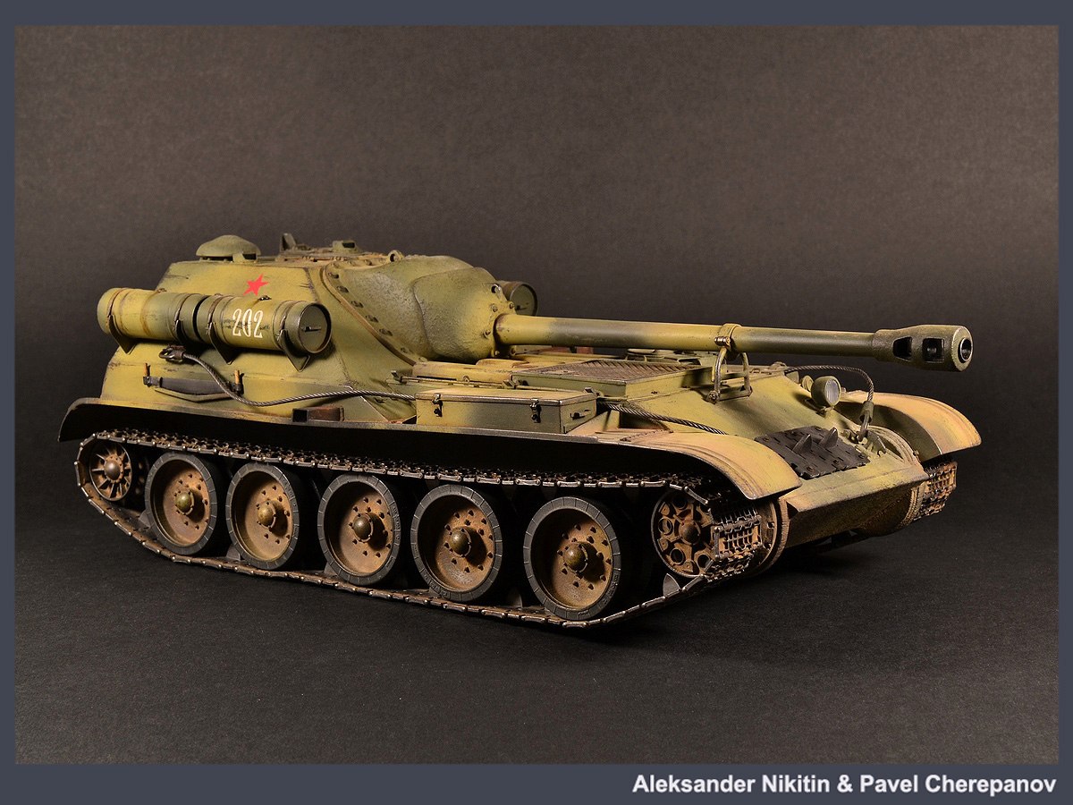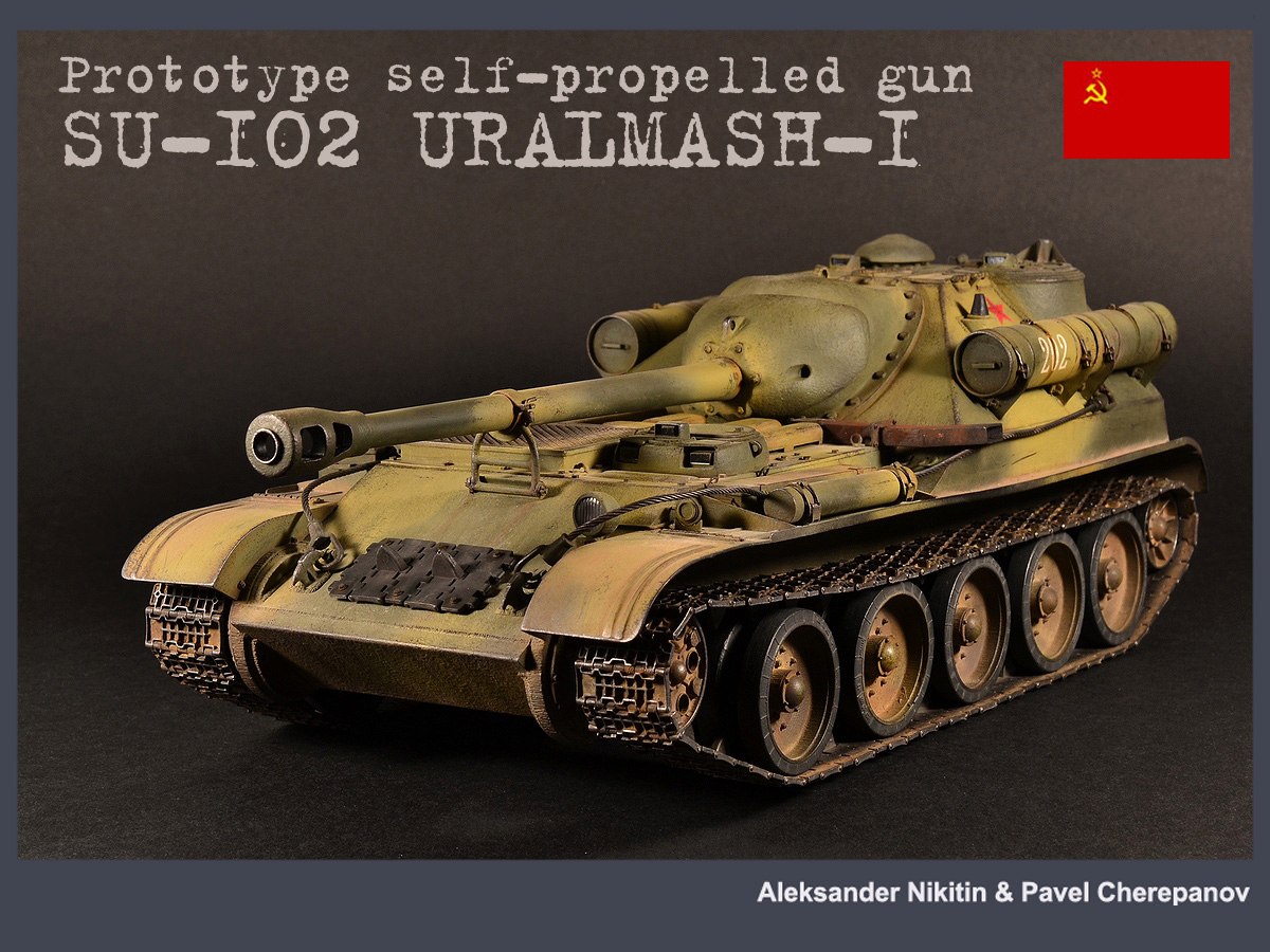 Новый совместный проект Александра Никитина и Павла Черепанова. Как обычно, Александр отвечал за сборку модели из картона, а Павел за окраску. Везеринг делали совместными усилиями. ИСТОРИЯ СУ-102 — опытная советская средняя самоходная артиллерийская установка, созданная в КБ УЗТМ осенью 1944 — весной 1945 года на основе шасси средних танков Т-44 и Т-34-85. Предназначалась для замены САУ СУ-100. Были разработаны два варианта САУ, различавшиеся лишь вооружением: СУ-101, со 100-мм пушкой Д-10С и СУ-102, со 122-мм пушкой Д-25-44С. В апреле—мае 1945 года были изготовлены один или два прототипа СУ-101 и один прототип СУ-102, в течение лета и осени того же года успешно прошедших заводские испытания. Несмотря на перспективность САУ и высокие для своего времени характеристики, с окончанием войны было принято решение о прекращении дальнейших работ по ним, в связи с нецелесообразностью развёртывания выпуска новой САУ, базировавшейся на агрегатах танков военного периода. Опыт работы над СУ-101 и СУ-102, вместе с тем, был использован в работах над послевоенными проектами САУ. СБОРКА Слово Александру: «Основой для модели послужил оригинальный PDF файл с моделью САУ СУ-101, автор и разработчик М. Рафальский. Масштаб модели 1/25. Основной используемый материал — картон различных толщин. Также использовались всевозможные допы. Ствол точеный от RB Model, смоляные допы от Panzer Hobby Art, трос от EUREKA XXL, мелочевка (головки болтов, гаек) от MasterClub. Отдельное спасибо Сергей Черевченко (SLC-лазерная резка), за изготовление отдельных, повторяющихся элементов. Сборка не вызвала ни каких затруднений. Отличная разработка! Для сборки (САУ) СУ-102, ствол был заменен на 122мм. Все детали пропитывалась цианоакрилатом, шлифовались. Далее нанесение сварочных швов, имитации брони. Затем грунтовка, подготовка к покраске.» ОКРАСКА Слово Павлу: «Мы выбрали вымышленный вариант камуфляжной окраски, на основе рендеров WoT, поскольку банально зеленой делать ее уже неинтересно. Базовый окрас был сделан тонами 4БО, с последовательными слоями высветления. Затем методом хэйр-спрей нанесен желтый камуфляж, и слегка ободран. Далее были нанесены декали, сколы и царапины, фильтр, смывка, кое-где потеки ржавчины. Глушители сделаны нарочито ржавыми для визуальной яркости модели. Затем Александр нанес грязь и пыль пигментами на ходовой, сделал потертости до голого металла, а я в финале прошелся тонким слоем пигментов пыли по всему корпусу.»