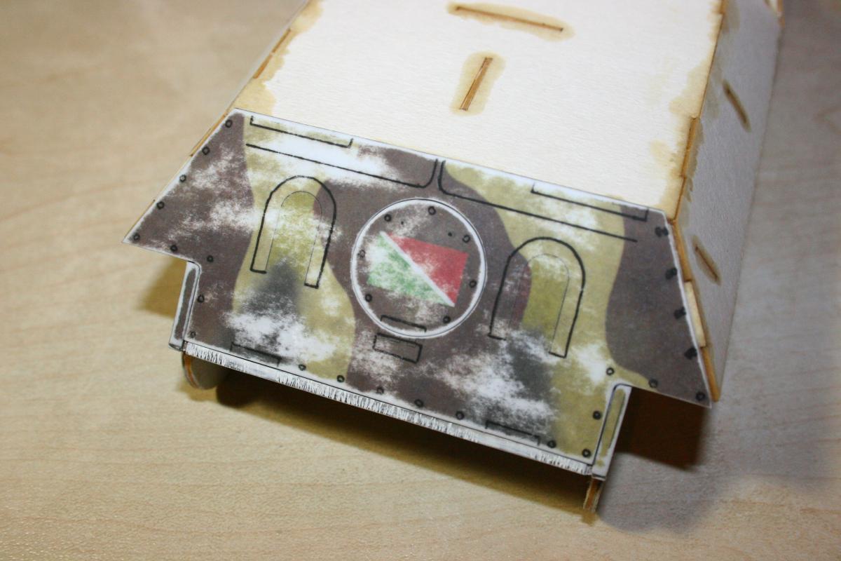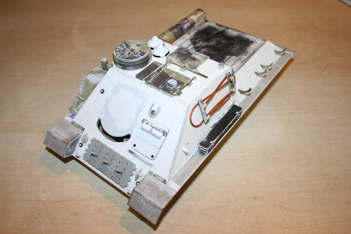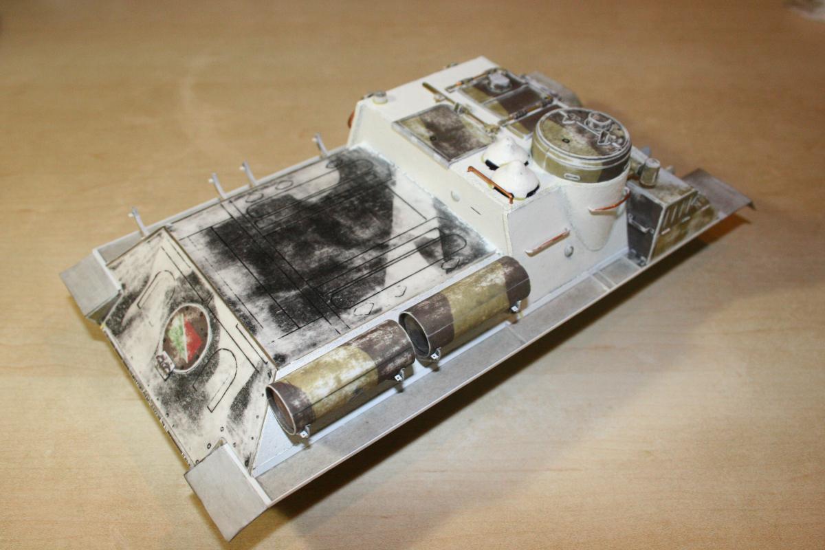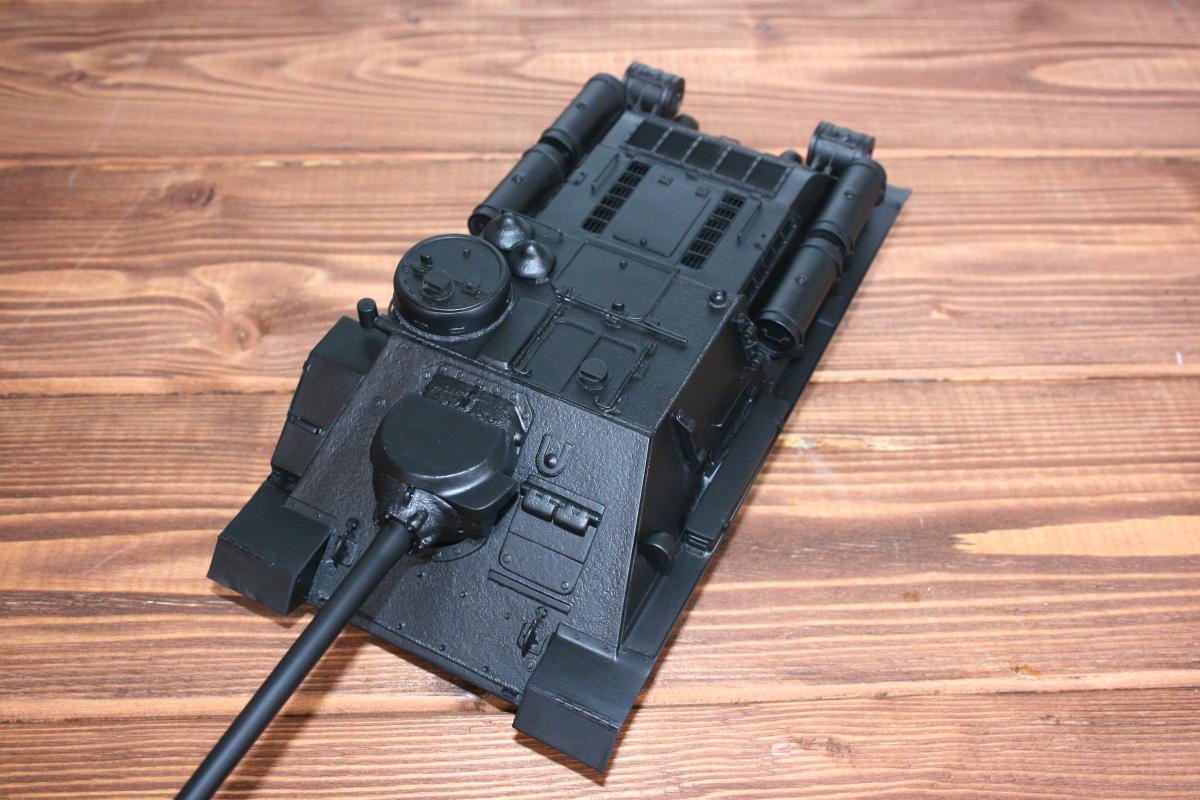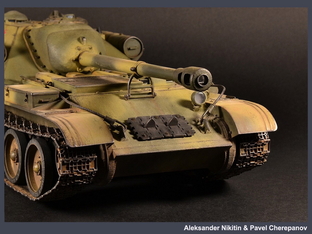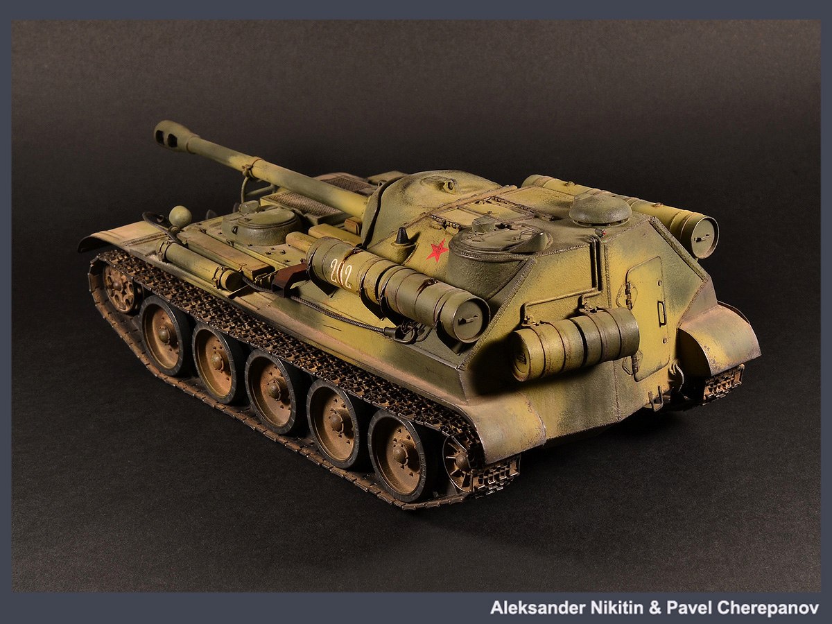 Новый совместный проект Александра Никитина и Павла Черепанова. Как обычно, Александр отвечал за сборку модели из картона, а Павел за окраску. Везеринг делали совместными усилиями. ИСТОРИЯ СУ-102 — опытная советская средняя самоходная артиллерийская установка, созданная в КБ УЗТМ осенью 1944 — весной 1945 года на основе шасси средних танков Т-44 и Т-34-85. Предназначалась для замены САУ СУ-100. Были разработаны два варианта САУ, различавшиеся лишь вооружением: СУ-101, со 100-мм пушкой Д-10С и СУ-102, со 122-мм пушкой Д-25-44С. В апреле—мае 1945 года были изготовлены один или два прототипа СУ-101 и один прототип СУ-102, в течение лета и осени того же года успешно прошедших заводские испытания. Несмотря на перспективность САУ и высокие для своего времени характеристики, с окончанием войны было принято решение о прекращении дальнейших работ по ним, в связи с нецелесообразностью развёртывания выпуска новой САУ, базировавшейся на агрегатах танков военного периода. Опыт работы над СУ-101 и СУ-102, вместе с тем, был использован в работах над послевоенными проектами САУ. СБОРКА Слово Александру: «Основой для модели послужил оригинальный PDF файл с моделью САУ СУ-101, автор и разработчик М. Рафальский. Масштаб модели 1/25. Основной используемый материал — картон различных толщин. Также использовались всевозможные допы. Ствол точеный от RB Model, смоляные допы от Panzer Hobby Art, трос от EUREKA XXL, мелочевка (головки болтов, гаек) от MasterClub. Отдельное спасибо Сергей Черевченко (SLC-лазерная резка), за изготовление отдельных, повторяющихся элементов. Сборка не вызвала ни каких затруднений. Отличная разработка! Для сборки (САУ) СУ-102, ствол был заменен на 122мм. Все детали пропитывалась цианоакрилатом, шлифовались. Далее нанесение сварочных швов, имитации брони. Затем грунтовка, подготовка к покраске.» ОКРАСКА Слово Павлу: «Мы выбрали вымышленный вариант камуфляжной окраски, на основе рендеров WoT, поскольку банально зеленой делать ее уже неинтересно. Базовый окрас был сделан тонами 4БО, с последовательными слоями высветления. Затем методом хэйр-спрей нанесен желтый камуфляж, и слегка ободран. Далее были нанесены декали, сколы и царапины, фильтр, смывка, кое-где потеки ржавчины. Глушители сделаны нарочито ржавыми для визуальной яркости модели. Затем Александр нанес грязь и пыль пигментами на ходовой, сделал потертости до голого металла, а я в финале прошелся тонким слоем пигментов пыли по всему корпусу.»