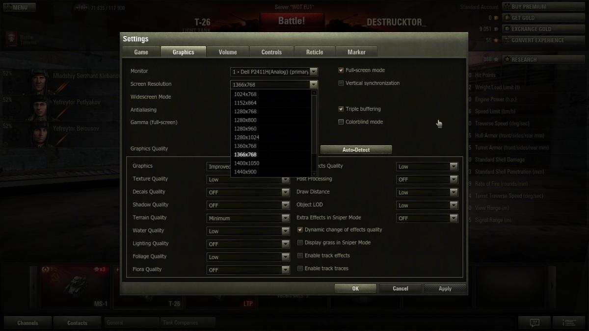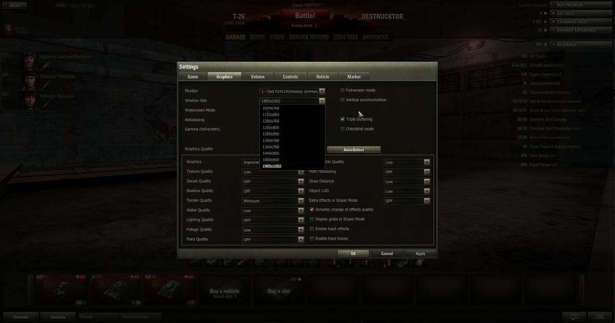 Здравствуйте. Столкнулся с такой проблемой: купил новый комп, скачал wot, но возникла проблема с разрешением игры в полноэкранном режиме. Разрешение моего монитора 1920:1080 пикселей, а максимально возможное разрешение в полноэкранном режиме в настройках 1440:1900. http://cdn-frm-eu.wargaming.net/wot/ru/uploads/monthly_08_2013/post-11272538-0-77085100-1376819786_thumb.jpg Из-за чего качество картинки в игре крайне низкого качества, однако если перейти в неполноэкранный режим, то разрешение 1920:1080 пикселей становится доступно, http://cdn-frm-eu.wargaming.net/wot/ru/uploads/monthly_08_2013/post-11272538-0-79500600-1376820128_thumb.jpg но картинка сильно лагает, даже если переставить на низкое разрешение. Вопрос: как сделать разрешение 1920:1080 пикселей в полноэкранном режиме? Компьютер HP 6GB памяти, intel core i3, видеокарта Nvidia Gforce 705A, windows 8.