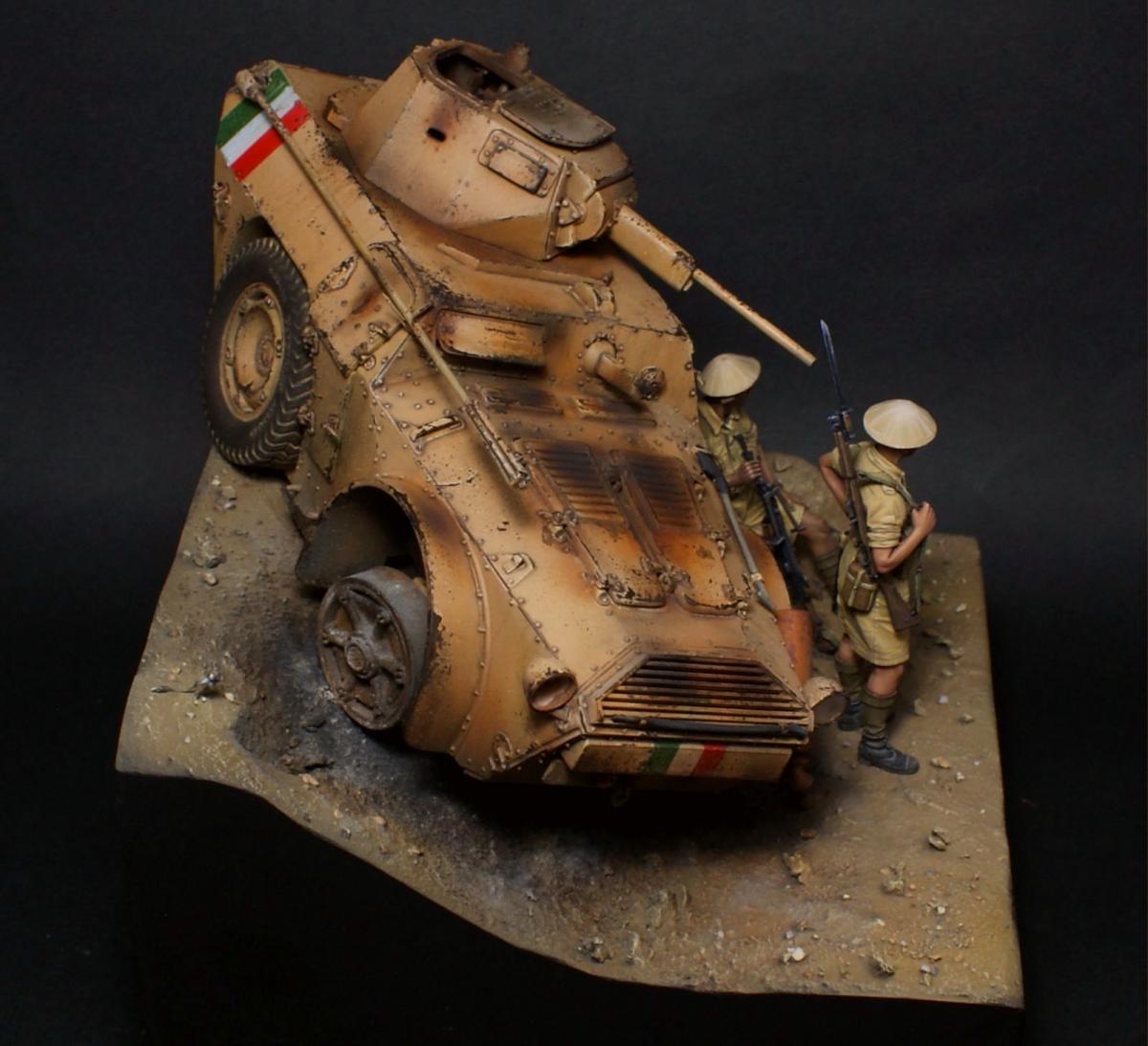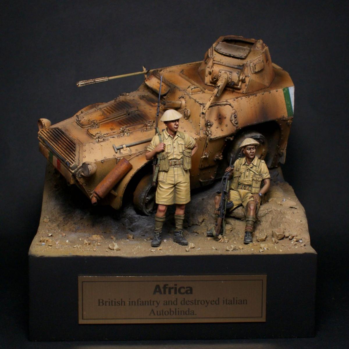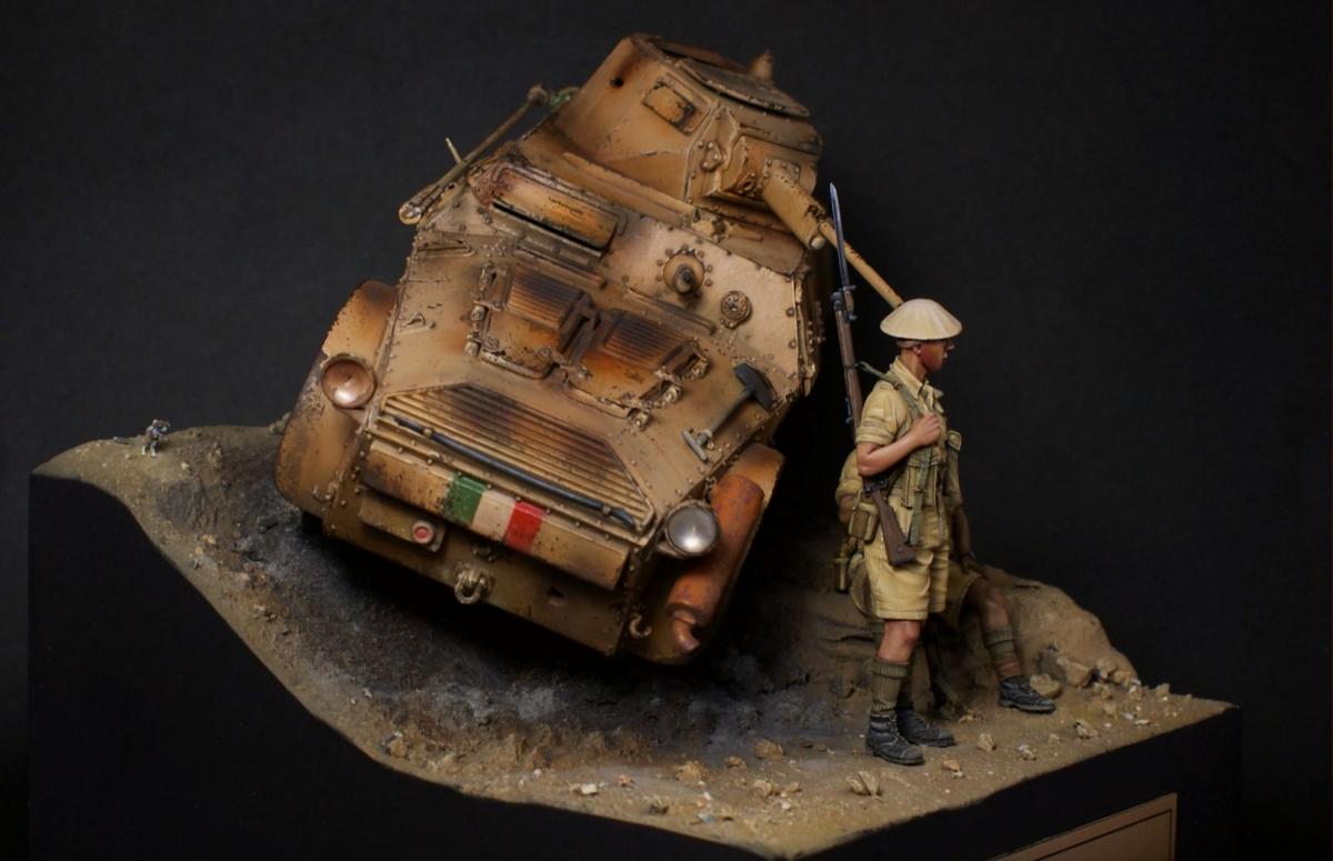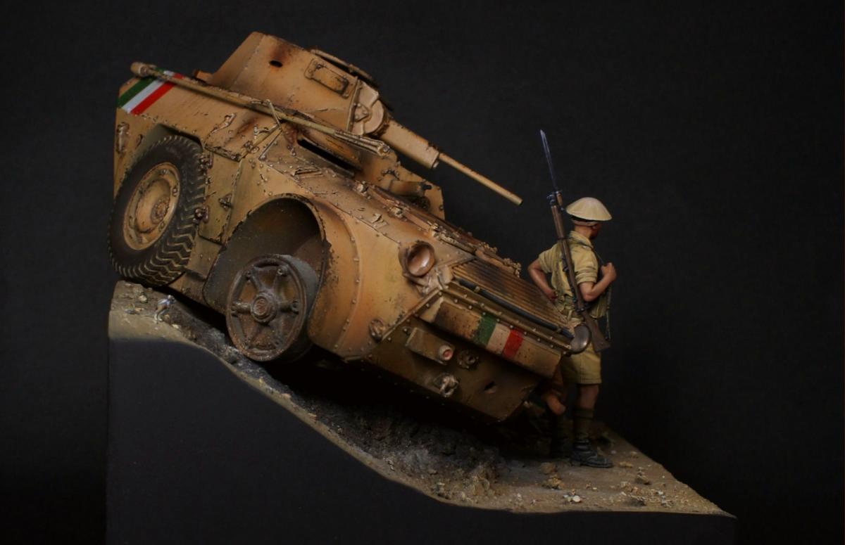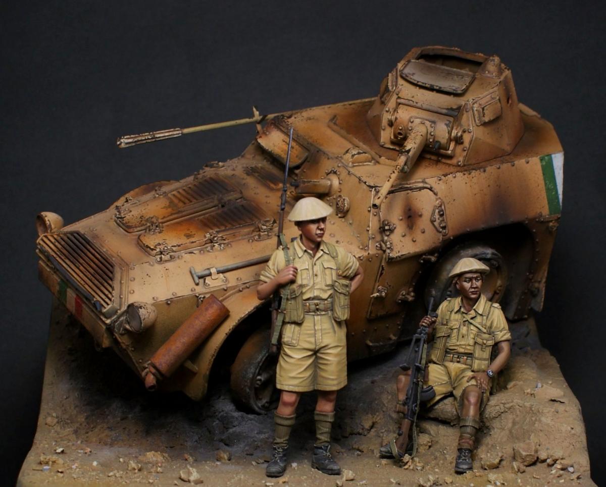 "День — ночь — день — ночь — мы идём по Африке, День — ночь — день — ночь — всё по той же Африке." Редьярд Киплинг Я давно вынашивал идею сделать виньетку с "обрезанной" техникой, привлекала компактность таких работ и именно итальянская бронетехника, ввиду её редкости в моделизме. Как раз кстати мне попалось несколько фотографий с подбитыми и сгоревшими Аутоблиндами. Этот интересный броневик с возможностью одинакового хода в обе стороны, пришёлся как нельзя кстати - повертев его в обе стороны я пришёл к наиболее удачному для композиции направлению. В работе использованы фигуры от Evolution, итальянский броневик Autoblinda AB41 от Italieri. Фигуры были немного доработаны - сделал ремни из фольги и проволоки. Пулемётчик был выполнен немного смуглее для разнообразия. Броневик собран с незначительными доработками. Кое-где добавил самодельной мелочёвки и поставил фары "Эльф". Стройка заняла почти два месяца с перерывами. Роспись и окраска техники - акрил Vallejo. Спасибо за внимание! http://cdn-frm-eu.wargaming.net/wot/ru/uploads/monthly_11_2016/post-1387362-0-22628200-1479491223_thumb.jpghttp://cdn-frm-eu.wargaming.net/wot/ru/uploads/monthly_11_2016/post-1387362-0-06540200-1479491276_thumb.jpghttp://cdn-frm-eu.wargaming.net/wot/ru/uploads/monthly_11_2016/post-1387362-0-27994200-1479491291_thumb.jpghttp://cdn-frm-eu.wargaming.net/wot/ru/uploads/monthly_11_2016/post-1387362-0-26851200-1479491296_thumb.jpghttp://cdn-frm-eu.wargaming.net/wot/ru/uploads/monthly_11_2016/post-1387362-0-22949000-1479491306_thumb.jpghttp://cdn-frm-eu.wargaming.net/wot/ru/uploads/monthly_11_2016/post-1387362-0-87043100-1479491300_thumb.jpghttp://cdn-frm-eu.wargaming.net/wot/ru/uploads/monthly_11_2016/post-1387362-0-68809500-1479491313_thumb.jpghttp://cdn-frm-eu.wargaming.net/wot/ru/uploads/monthly_11_2016/post-1387362-0-05112200-1479491327_thumb.jpghttp://cdn-frm-eu.wargaming.net/wot/ru/uploads/monthly_11_2016/post-1387362-0-12800900-1479491332_thumb.jpghttp://cdn-frm-eu.wargaming.net/wot/ru/uploads/monthly_11_2016/post-1387362-0-94441900-1479491337_thumb.jpghttp://cdn-frm-eu.wargaming.net/wot/ru/uploads/monthly_11_2016/post-1387362-0-81438400-1479491346_thumb.jpghttp://cdn-frm-eu.wargaming.net/wot/ru/uploads/monthly_11_2016/post-1387362-0-24827600-1479491352_thumb.jpghttp://cdn-frm-eu.wargaming.net/wot/ru/uploads/monthly_11_2016/post-1387362-0-80629000-1479491362_thumb.jpg