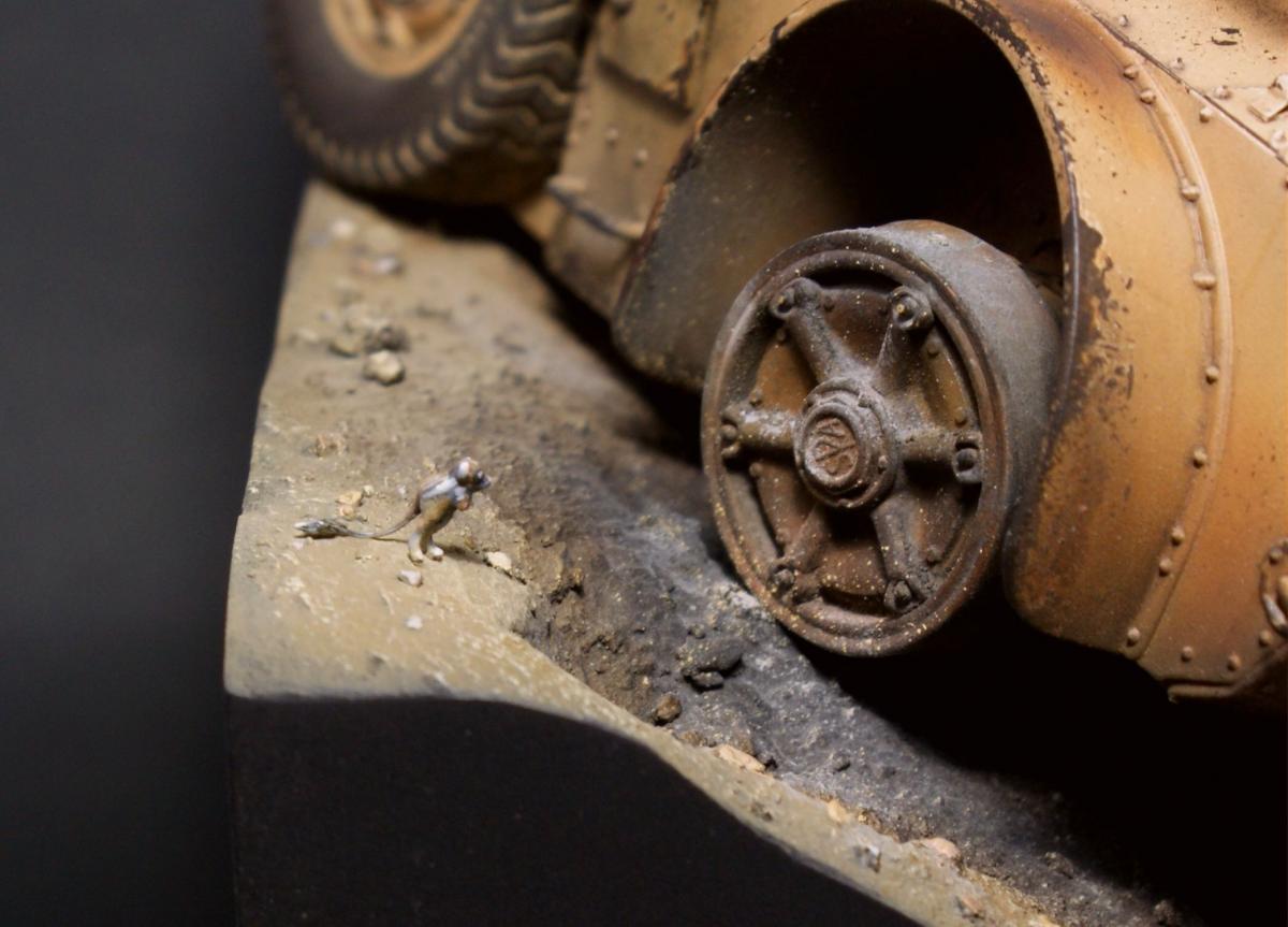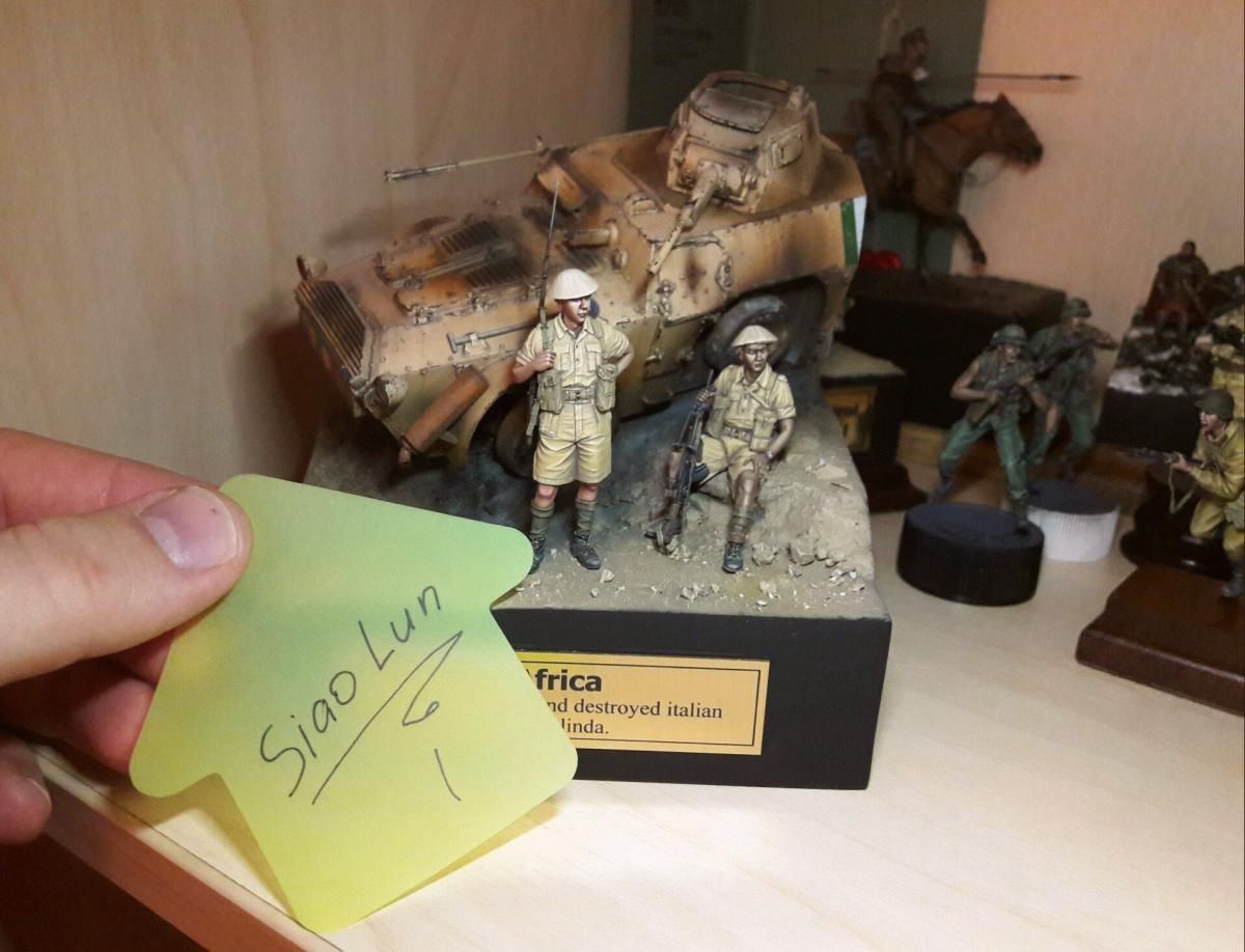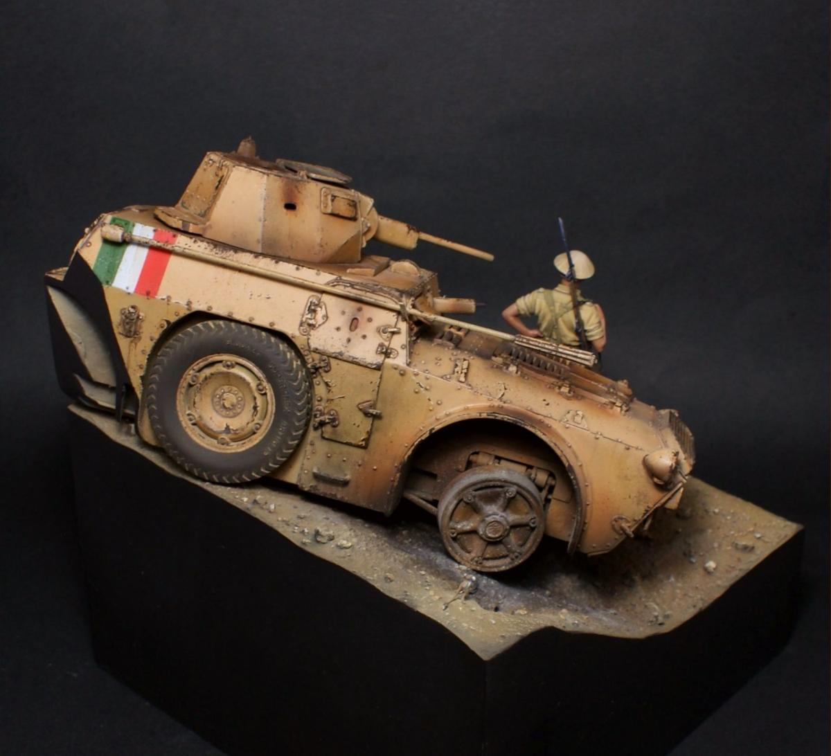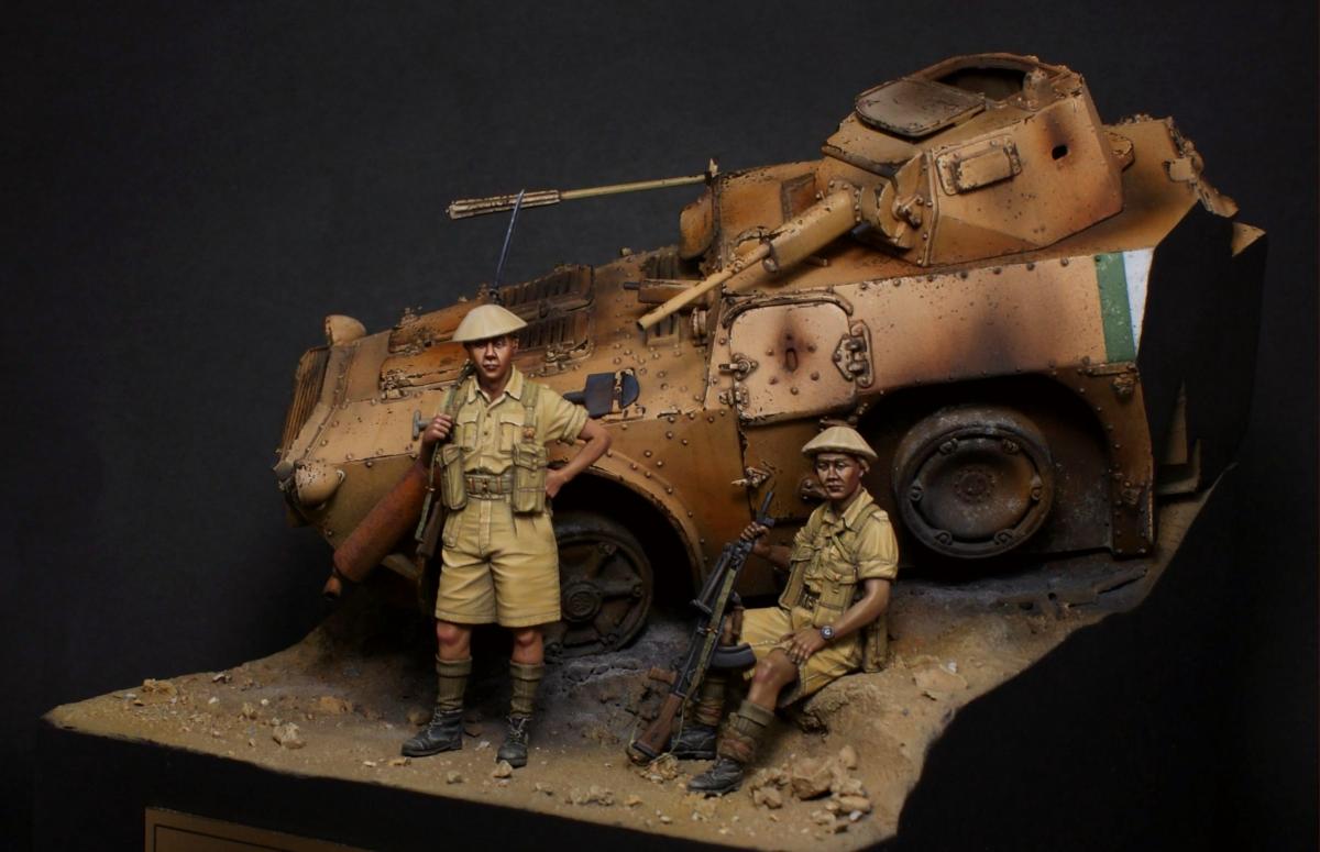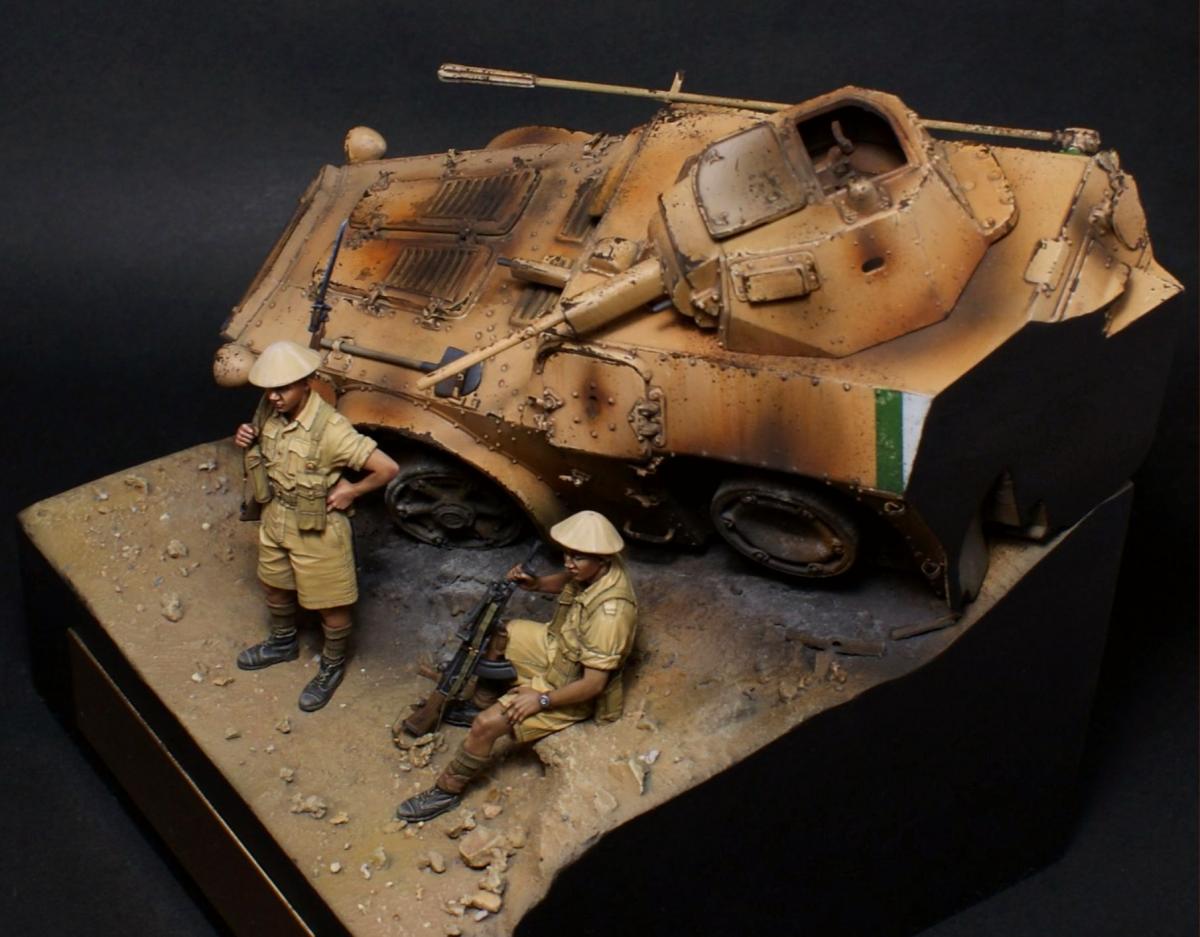 "День — ночь — день — ночь — мы идём по Африке, День — ночь — день — ночь — всё по той же Африке." Редьярд Киплинг Я давно вынашивал идею сделать виньетку с "обрезанной" техникой, привлекала компактность таких работ и именно итальянская бронетехника, ввиду её редкости в моделизме. Как раз кстати мне попалось несколько фотографий с подбитыми и сгоревшими Аутоблиндами. Этот интересный броневик с возможностью одинакового хода в обе стороны, пришёлся как нельзя кстати - повертев его в обе стороны я пришёл к наиболее удачному для композиции направлению. В работе использованы фигуры от Evolution, итальянский броневик Autoblinda AB41 от Italieri. Фигуры были немного доработаны - сделал ремни из фольги и проволоки. Пулемётчик был выполнен немного смуглее для разнообразия. Броневик собран с незначительными доработками. Кое-где добавил самодельной мелочёвки и поставил фары "Эльф". Стройка заняла почти два месяца с перерывами. Роспись и окраска техники - акрил Vallejo. Спасибо за внимание! http://cdn-frm-eu.wargaming.net/wot/ru/uploads/monthly_11_2016/post-1387362-0-22628200-1479491223_thumb.jpghttp://cdn-frm-eu.wargaming.net/wot/ru/uploads/monthly_11_2016/post-1387362-0-06540200-1479491276_thumb.jpghttp://cdn-frm-eu.wargaming.net/wot/ru/uploads/monthly_11_2016/post-1387362-0-27994200-1479491291_thumb.jpghttp://cdn-frm-eu.wargaming.net/wot/ru/uploads/monthly_11_2016/post-1387362-0-26851200-1479491296_thumb.jpghttp://cdn-frm-eu.wargaming.net/wot/ru/uploads/monthly_11_2016/post-1387362-0-22949000-1479491306_thumb.jpghttp://cdn-frm-eu.wargaming.net/wot/ru/uploads/monthly_11_2016/post-1387362-0-87043100-1479491300_thumb.jpghttp://cdn-frm-eu.wargaming.net/wot/ru/uploads/monthly_11_2016/post-1387362-0-68809500-1479491313_thumb.jpghttp://cdn-frm-eu.wargaming.net/wot/ru/uploads/monthly_11_2016/post-1387362-0-05112200-1479491327_thumb.jpghttp://cdn-frm-eu.wargaming.net/wot/ru/uploads/monthly_11_2016/post-1387362-0-12800900-1479491332_thumb.jpghttp://cdn-frm-eu.wargaming.net/wot/ru/uploads/monthly_11_2016/post-1387362-0-94441900-1479491337_thumb.jpghttp://cdn-frm-eu.wargaming.net/wot/ru/uploads/monthly_11_2016/post-1387362-0-81438400-1479491346_thumb.jpghttp://cdn-frm-eu.wargaming.net/wot/ru/uploads/monthly_11_2016/post-1387362-0-24827600-1479491352_thumb.jpghttp://cdn-frm-eu.wargaming.net/wot/ru/uploads/monthly_11_2016/post-1387362-0-80629000-1479491362_thumb.jpg