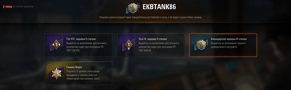 http://cdn-frm-eu.wargaming.net/4.5/style_images/wg/snapback.pngtattaki (20 май 2020 - 17:43) писал: В игре нажать аккаунт игрока (слева вверху), далее выбрать нашивку (тоже слева но пониже) и нажать на нашивку ( у меня так)нет ее