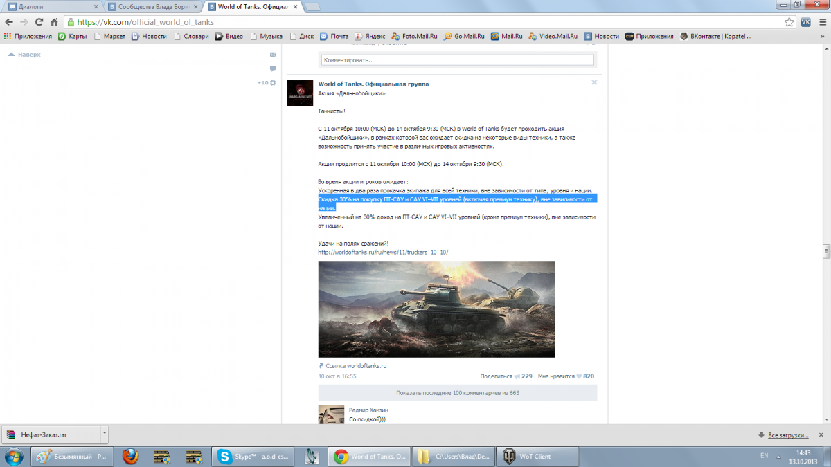 Всем доброго вечера, писал в саппорт 3 дня назад, но ответа так и не дождался, решил спросить тут. В официальной группе Вконтакте была вывешена акция, в которой указывалось что будет скидка 30% на покупку ПТ-САУ и САУ VI–VII уровней (включая премиум технику), вне зависимости от нации. Но проверив магазин, я заметил что по крайней мере у меня, снижение цен на САУ не было. http://cdn-frm-eu.wargaming.net/wot/ru/uploads/monthly_10_2013/post-1331124-0-34926700-1381846222_thumb.png http://cdn-frm-eu.wargaming.net/wot/ru/uploads/monthly_10_2013/post-1331124-0-33224400-1381846231_thumb.jpg http://cdn-frm-eu.wargaming.net/wot/ru/uploads/monthly_10_2013/post-1331124-0-23027400-1381846238_thumb.jpg http://cdn-frm-eu.wargaming.net/wot/ru/uploads/monthly_10_2013/post-1331124-0-70358200-1381846246_thumb.jpg Всем спасибо, с ценами сильно ошибся....