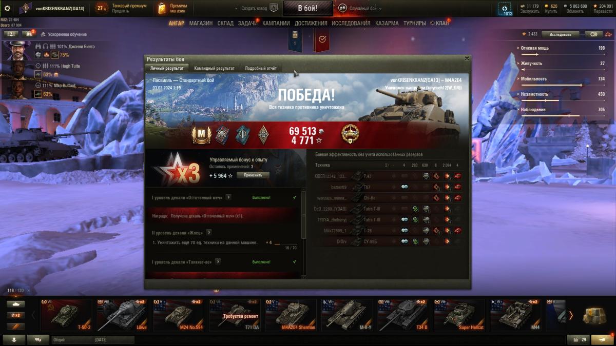 Пока получилось как-то так. Возьму две отметки и пересяду на тандерболта. Стоит досыл, умп, вент. По перкам - у всех нулевой бб и качается ремонт. Скрин случайно делал на фоне другого танка.