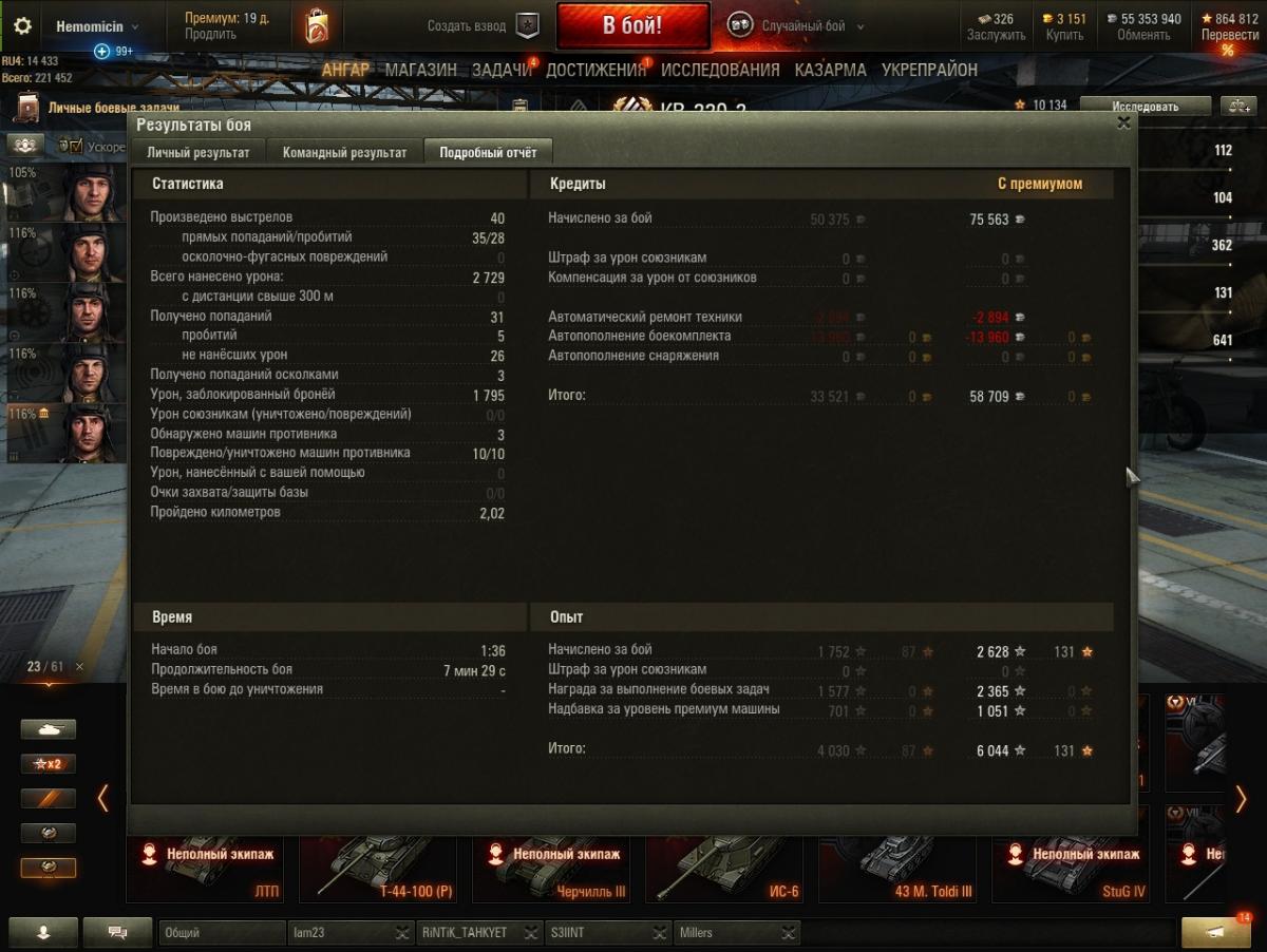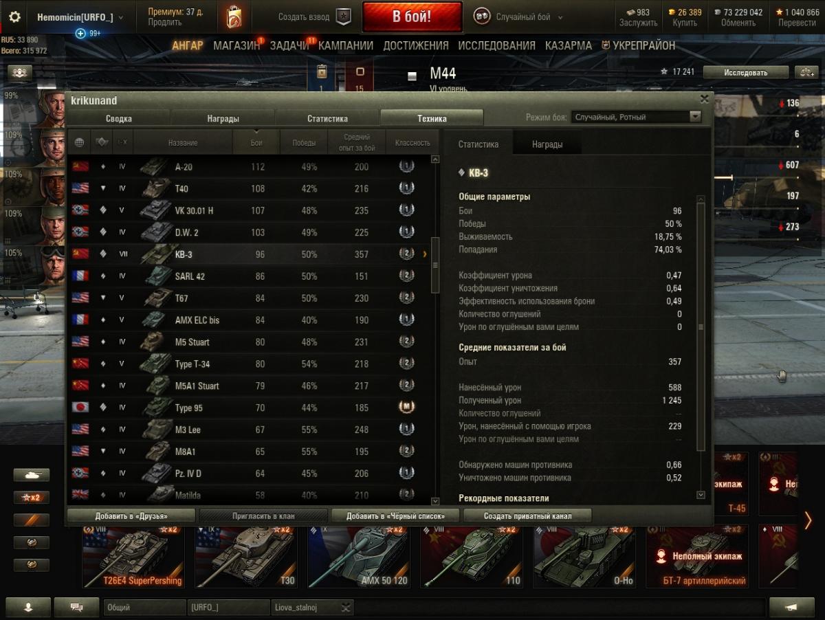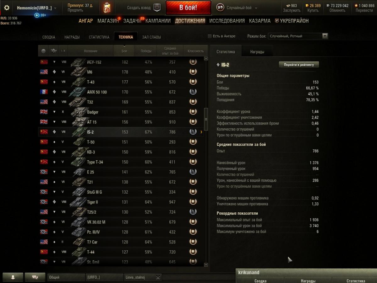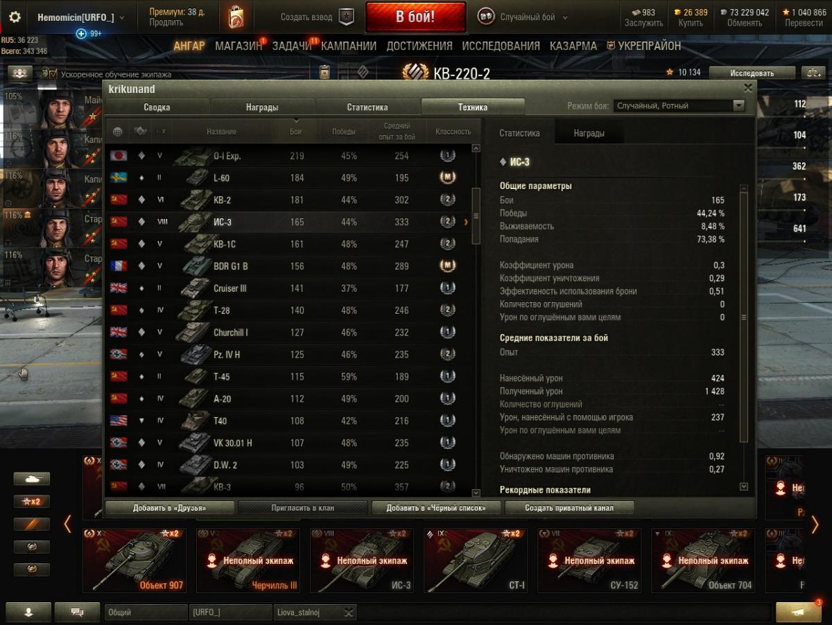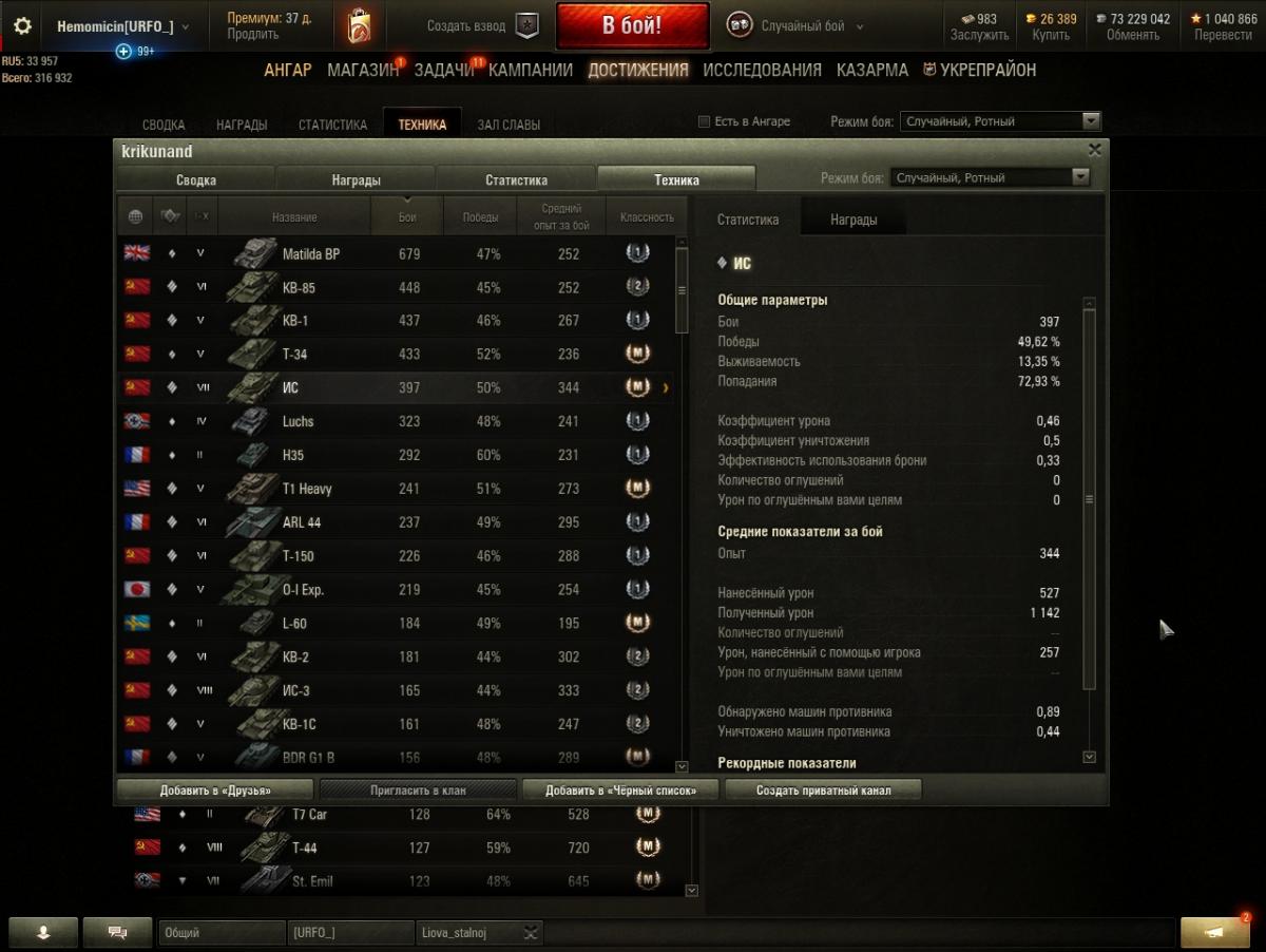 Даже если экипаж будет с 10 перками, а все оборудование будет за боны, разлет в 0.46 на 100м НЕ уменьшится. "Неожиданно", правда? Как все запущено... Был какой то "мегонерв" алкотанков?! Ах да! 9-10 добавили уязвимостей во лбу, понизили скорость поворота, 6ке срезали броню с кормы, 5ке наварили лоб с 75 до 100... Просто нерф на все времена. В 2016 были "живые", сейчас ВСЕ - неиграбельные... Нет, я так не думаю. Если интересует мое мнение, то я думаю, что ты глупо лезешь вперед, справедливо получаешь на все ХП и уходишь в ангар с минимумом урона и едешь в следующий бой не извлекая уроки из предыдущего. Но, это если спрашивать мое мнение, оно может не совпадать с мнение других людей, оно может быть бесконечно далеко от "истины", или настолько же близко к ней. Это все не важно, важно то, что характеристики на всех твоих ТТ настолько печальны, что сразу понятно - что то ты делаешь НЕ так. Я не говорил про общий средний урон, он действительно показывает на каких уровнях играет человек, я имел ввиду урон на каждом конкретном танке. Процент побед действительно сильно командно зависим, я к нему никогда не апеллирую, из сотни боев бывает несколько где все зависит от тебя и от того сколько из них ты смог вывезти, так и поднимается процент побед, но это такое, слишком эфемерное, чтоб на это серьезно ориентироваться. Но показатели на каждом танке зависят ОТ ЕГО водителя. И когда я вижу на ТТ7го уровня выживаемость 19%, коэффициент урона 0,47 (т.е. ты получаешь в два раза больше урона, чем наносишь!!) и средний урон 588. http://cdn-frm-eu.wargaming.net/wot/ru/uploads/monthly_02_2018/post-14518697-0-49706300-1517570162_thumb.jpg Мне становится очень грустно и возникает только одна мысль :"Господи, только бы не в мою команду!". А когда я вижу 8% выживаемости, коэф. урона 0,3 и средуху 424 на одном из лучших ТТ8 ИС-3, мне хочется просто обнять и плакать... http://cdn-frm-eu.wargaming.net/wot/ru/uploads/monthly_02_2018/post-14518697-0-98539700-1517570198_thumb.jpg И что? Я тоже проходил все танки со сток состояния. С экипажами я такой порнографией не занимался, но вот на китайский ИС-2 я посадил 75% экипаж за серебро. Можно сравнить результаты с твоим ИСом. Надо же! Один в один... http://cdn-frm-eu.wargaming.net/wot/ru/uploads/monthly_02_2018/post-14518697-0-87774000-1517570244_thumb.jpghttp://cdn-frm-eu.wargaming.net/wot/ru/uploads/monthly_02_2018/post-14518697-0-28404000-1517570252_thumb.jpg Я, что сказать то хочу, может надо в консерватории что то менять? не выискивать причины своих неудач в союзниках по команде, в "имбо" танках противника, не валить все на алкотанки, которых не так уж прям и много в рандоме, а попробовать изменить что-нибудь в своем поведении в бою? Ну, я даже не знаю, перестать рашить поле на малиновке. Оказавшись внизу списка не лететь первым на место бодания ТТ, а потом удивляться: " А чего это я Е 75 не смог ни единицы урона нанести?! Все разрабы виноваты!". Прекратить жаться из-за каждой серебряной монетки (они все равно ВСЕ нарисованные!!) и купить наконец оборудование и, хотя бы, пару "голдоснарядов" на танк. Возможно еще что то. Нет, ничего этого делать не надо? Во всем виноваты ракокоманды, вражеские имботанки и разрабы занерфлевшие совков и нежелающие их аппать? Ну, ладно, хозяин - барин. Каждый решает сам за себя.