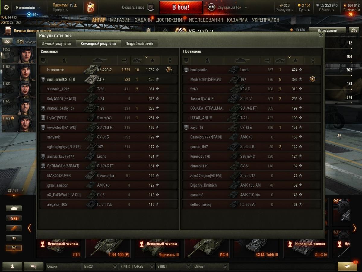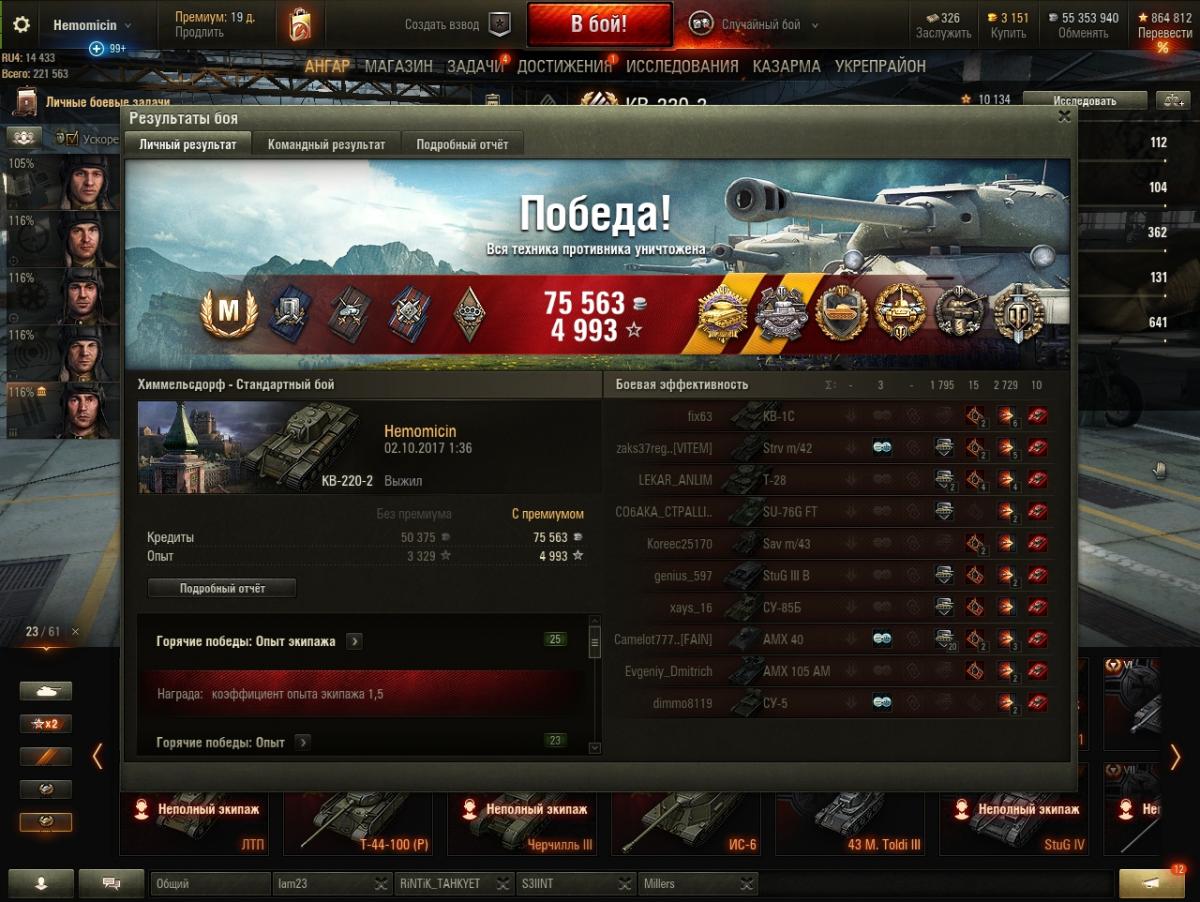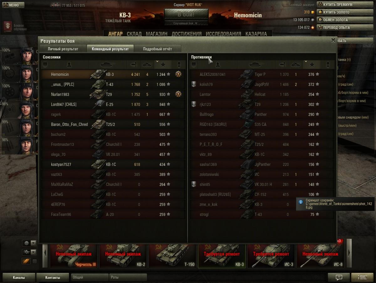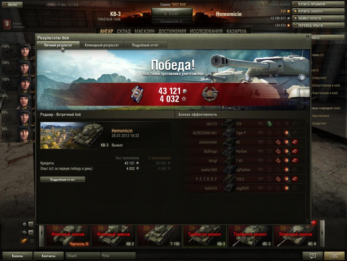 http://cdn-frm-eu.wargaming.net/4.5/style_images/wg/snapback.pngBodRyT (16 дек 2019 - 10:33) писал: О, уже и к проценту выживания претензии... На пуделе с боеукладкой порядок. Ну как, если борт подставлять то непорядок, но хоть башню высунуть можно, увн в разы лучше чем тут. А в этом ведре она самая в башне. И заряжающий тоже вроде. И никто боеукладкой вперед не ололошит. Жить подольше в условиях современного рандома (особенно в новогодний треш) с поправкой еще и на мой стиль игры малореально - если будешь усиленно ныкаться, то или разберут вражин без тебя (-уроний), или разберут тимов и приедут толпой к тебе, дав сделать 1-2 выстрела (- уроний). Потому о выживании вопрос не особо стоит, хочется забрать свое хепе (лучше больше). В принципе, средний за бой вверх полез, особенно на Т-29 (шикарный танк) и ИС. Буду пробовать найти золотую середину конечно, но приоритет на отбитие хепе. Вот из-за таких мыслий и случаются турбосливы одной из команд. Все: "Ололо! ХП! ХП!!!!" - вжууууух! И отдали свое ХП ничего не настреляв. В конце боя точно так же можно настрелять свое ХП. При этом шанс этого выше, а еще выше шанс победы. Я вот не умею играть на светляках, если я беру что-либо быстрее СТ - еду "активна свитить" - БАХ! и в ангаре. Есть у меня такое. Прокачай ветку медленных, но бронированных танков. Например путь к маусу. Танки там не позволяют поехать и слиться при всем желании). При этом прощают почти все, кроме ошибочного выбора направления: если поехал в какую-то часть карты то это до конца боя. Раньше VK 100.01P, в топе, позволял выехать в чистое поле и просто стрелять, не обращая внимания на плевки в ответ. З.Ы. Ну, а если захочется дикого н0гибы - добудь КВ-220-2 и добро пожаловать в клуб победителей 5го уровня). На нем ты просто едешь и побеждаешь...