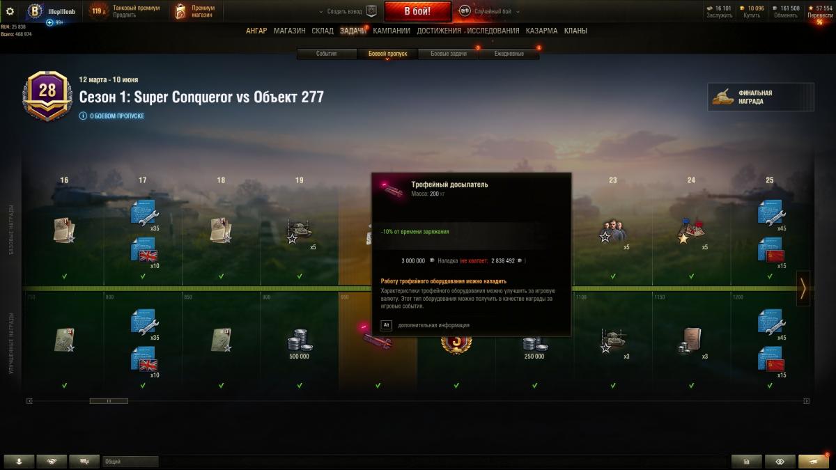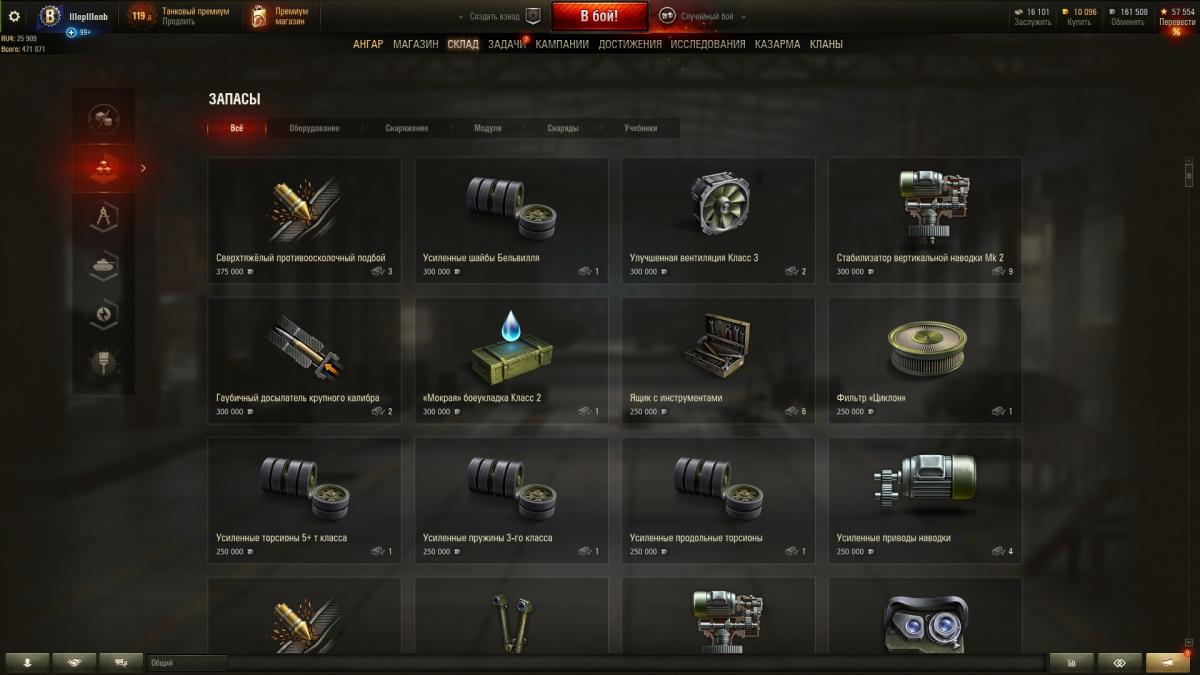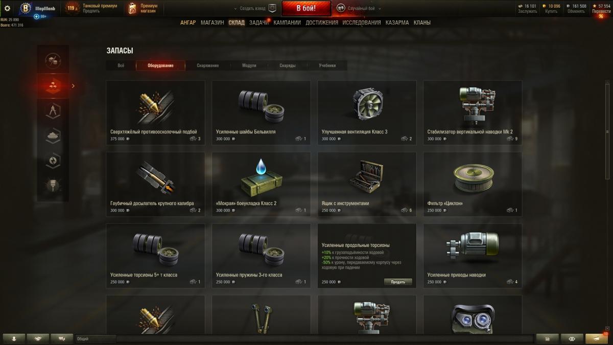 7. Возможно, у тебя на счету не хватает 3 ляма серебра, чтобы поставить улучшенное оборудование - весёлый приколист? оно было уже улучшено - каждое за 3 000 000 кр . Зайди на любом танке в оборудование и наведи мышкой на трофейное, если стоит где-то на танке, то увидешь на каком стоит - нигде ещё не устанавливал http://cdn-frm-eu.wargaming.net/wot/ru/uploads/monthly_05_2020/post-147267-0-68677400-1589107728_thumb.jpg досылаталь и усиленные приводы были и теперь вот и хнет Посмотрите в меню "Склад". http://cdn-frm-eu.wargaming.net/wot/ru/uploads/monthly_05_2020/post-147267-0-25946700-1589108347_thumb.jpghttp://cdn-frm-eu.wargaming.net/wot/ru/uploads/monthly_05_2020/post-147267-0-05636900-1589108275_thumb.jpg Если вы его никуда не устанавливали, то оно лежит на складе. - на складе их тоже нет http://cdn-frm-eu.wargaming.net/wot/ru/uploads/monthly_05_2020/post-147267-0-67644400-1589108300_thumb.jpghttp://cdn-frm-eu.wargaming.net/wot/ru/uploads/monthly_05_2020/post-147267-0-34948000-1589108368_thumb.jpg но в задачах боевого пропуска они отображаются как неулучшенные