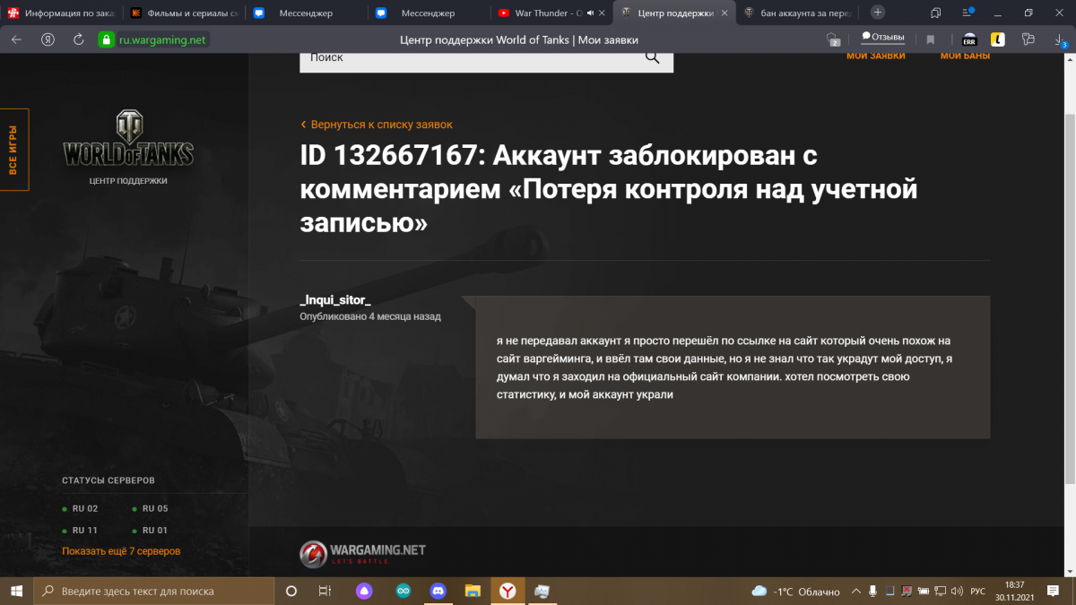 здравствуйте уважаемые пользователи получил ба за передачу аккаунта хотя я его передавал не зная этого я попал на фишинговый сайт который является копией варгейминга, на почту приходило письмо что у варгейминг началась распродажа и скидки до 30% я и перешёл по ссылке и ввёл свои данные, я не хотел продавать или передавать свой аккаунт я просто не увидел подмены, я хотел сделать честную покупку так как думал что начались реальные скидки, но мой аккаунт украли и в последствии заблокировали, в ЦПП не отвечают и просто закрывают заявку пишу сюда хочу услышать ваше мнение что и как делать, сразу скажу что аккаунт не продавал, мой личный и почти единственный, сейчас создал твинк с которого и пишу, было куплено куча премов, и вложена душа аккаунт очень дорог для меня был, ник аккаунта: _Inqui_sitor_ и ссылка: https://worldoftanks...1617029291 могу предоставить любые доказательства которые попросите. прикрепляю скрины обращения в цпп где видно что заявки закрыты без ответа, я подтверждал что аккаунт мой, все данные называл начиная от провайдера и города, заканчивая всеми картами с который покупал что либо