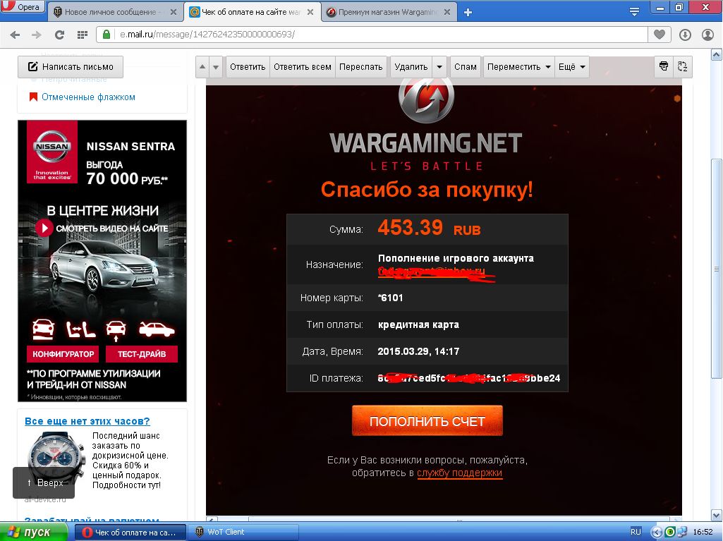 3. Здравствуйте, читал про свою проблему на форумах-ответа не нашёл, помогите.Марафон Т-34. Мне нужно докупить пакеты с нациями "Британия", "Япония", "Китай". Начал покупать-забыл какой уже купил, на почте смотрю, есть чек, но там не написано за какую покупку, (скрин прилагаю). Времени до конца акции осталось мало, какие пакеты надо докупить. не знаю. И почему то цена в магазине стоит 432р 96 коп, а сменя сняли 453руб 39коп, оплачивал картой виза, сбербанк.Кроме того второй платёж вообще не отобразился, а деньги сняты с карты http://cdn-frm-eu.wargaming.net/wot/ru/uploads/monthly_03_2015/post-3456807-0-12858100-1427632729_thumb.jpg