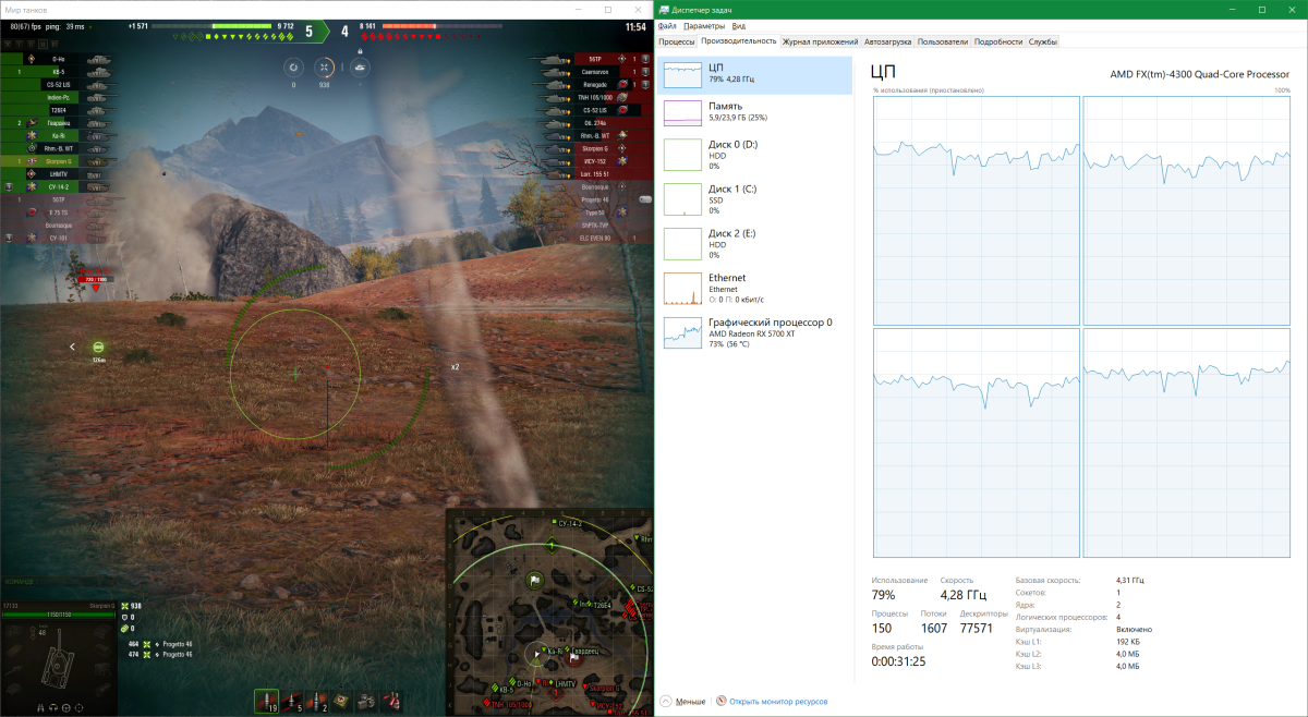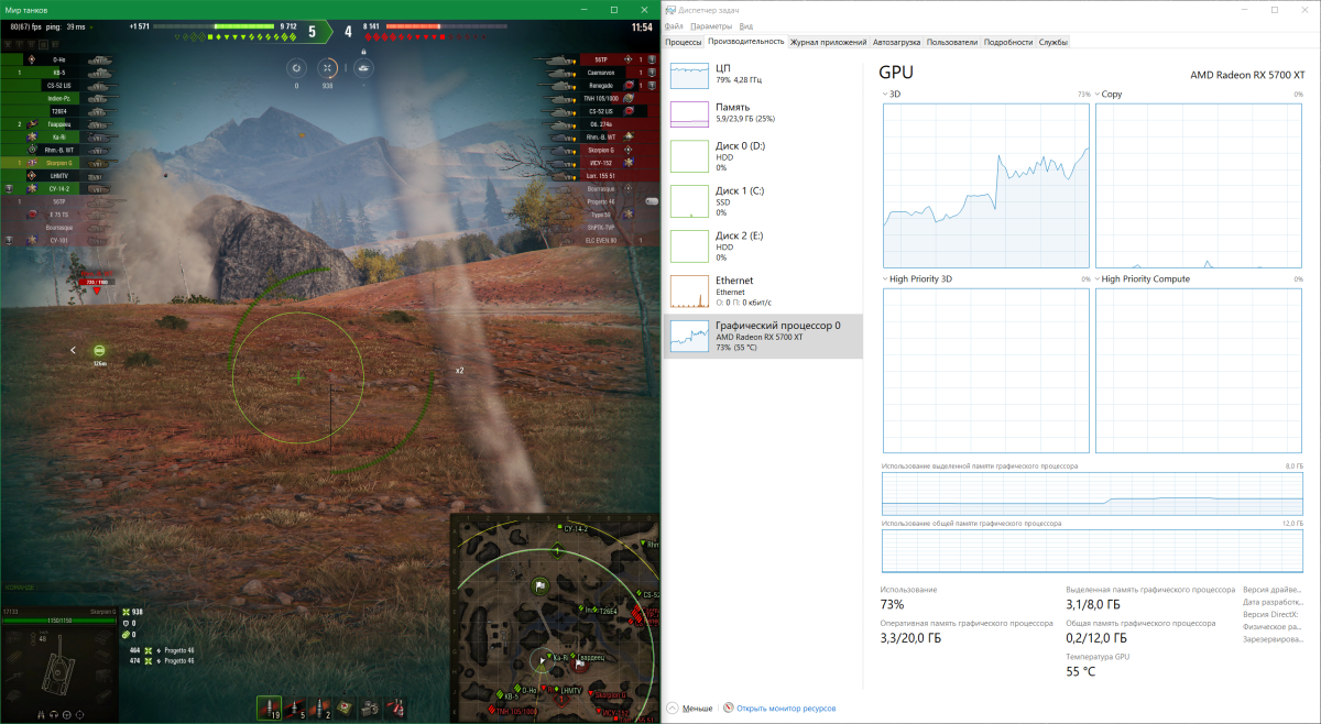Доброго времени суток! RX 5700 XT SE производительность в танках около 62-64% (почти фул. настройки), график в диспетчере задач- ровная полка. ФПС при этом скачет от 40 до 175, в среднем около 70-90, но с просадками. С включенной вертикальной синхронизацией только хуже, монитор 60 Гц, QHD, не поддерживает Free-Sync. Процессор нагружен около 70%. Понижение настроек графики, не даёт результата, ровная полка графика но на меньших значениях нагрузки, фпс точно так же скачет. Других игр нет. При этом в Superposition Benchmark нагрузка на карту 100% в любых режимах. В AMD Adrenalin кнопка Стресс-тест аналогично- нагрузка 100%. Как заставить её работать? Скрины Отчёт ГеймЧек