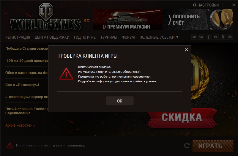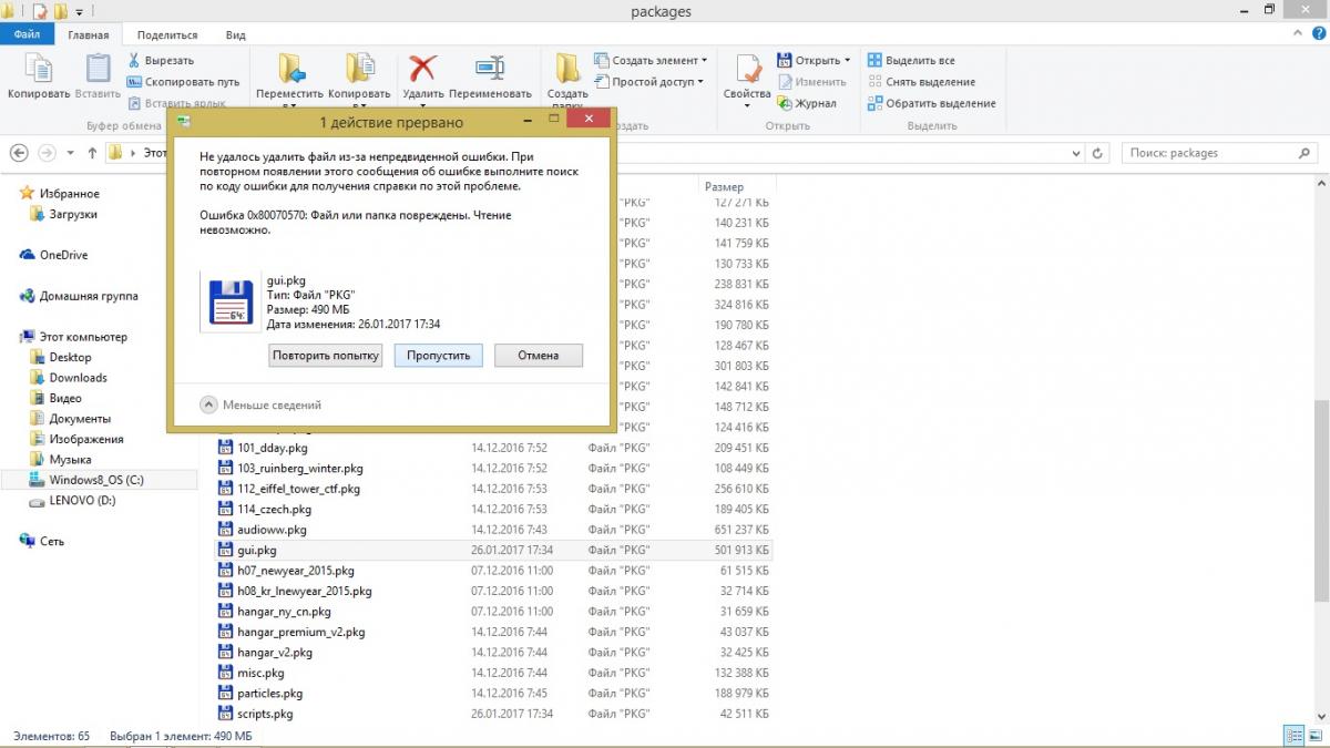 Ситуация такая, играл я в танки примерно дней 5 назад все было норм, потом захожу в игру а она мне выдает ошибку: game resource path does not exist ./res/packages/gui.pkg Погуглил, предлогают через лончер проверить целостность игры. Нажал, начинает проверять, доходит до 61% и все выскакивает вот такая ошибка (скрин). Нашел этот файл в игре, попробовал удалить, тоже не выходит, пишет ошибку (скрин2), так же нельзя копировать и переименовывать, пробовал даже через анлокер удалить тоже не получается. Если снести игру то этот файл останется и при последующей установке игры будет такая же петрушка. Может кто сталкивался с таким? Есть решение?