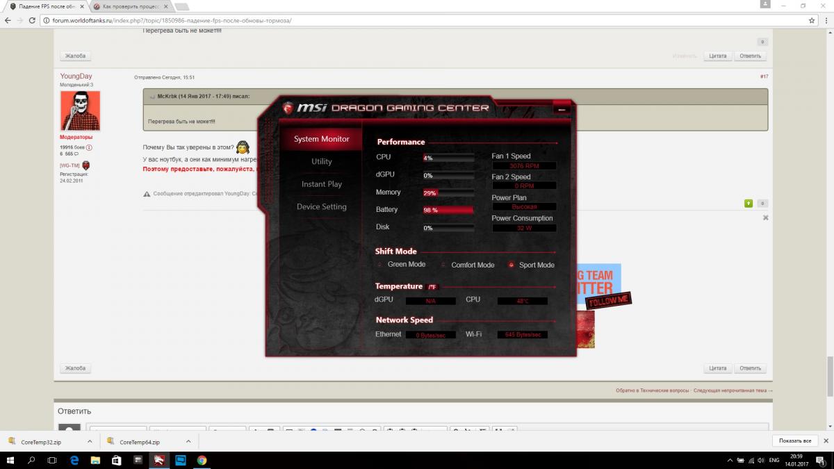 Хорошо тебе. Но это не дело, мы теперь после каждой обновы должны винду переставлять?? Разрабом ***@й что творится. Поддержки нету, ссылают все на перегрев железа и скиньте им файлы/логи. Ноут у меня новый "мощный вася", до обновы 12.01 все летало на максималках при ФПС 110-120... а после началась жесть... Реально, разрабы, вы чем там занимаетесь? органы половые дергаете??? Возьмитесь за проблемы, каждый день на форуме возникают данные темы. Сам сейчас играю на минималке, при этом идут фризы при движении прицела... дерганье, не прицелится не свестись...что в аркадном, что в снайперском прицеле. Играл и с модами и без них, и новый клиент игры установил (полностью, заново) не помогло. У самого ноут MSI GE72 6QF, i7-6700, nvidia gtx970M -3 Gb....