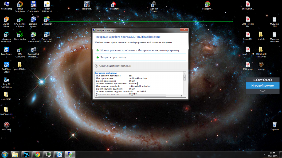 Ошибка в конце установки модов (если нужно разработчикам): Сигнатура проблемы: Имя события проблемы: BEX Имя приложения: multipackbase.tmp Версия приложения: 0.0.0.0 Отметка времени приложения: 506a75b5 Имя модуля с ошибкой: isskinexW.dll_unloaded Версия модуля с ошибкой: 0.0.0.0 Отметка времени модуля с ошибкой: 4c2b56b8 Смещение исключения: 03fd2480 Код исключения: c0000005 Данные исключения: 00000008 Версия ОС: 6.1.7601.2.1.0.256.1 Код языка: 1049 Дополнительные сведения 1: 9420 Дополнительные сведения 2: 94204a1a1315d034f345e693d8e456a0 Дополнительные сведения 3: 5b94 Дополнительные сведения 4: 5b9436e258a011be3e65d8f833cf0eba Ознакомьтесь с заявлением о конфиденциальности в Интернете: http://go.microsoft.com/fwlink/?linkid=104288&clcid=0x0419 Если заявление о конфиденциальности в Интернете недоступно, ознакомьтесь с его локальным вариантом: E:\Windows\system32\ru-RU\erofflps.txt Установил игру в раздел диска с Windows, в папку Program Files - моды так и не встают. В конце процесса установки пишется, что-то вроде: моды успешно установлены программа установки может быть закрыта. После закрытия программы установки выскакивает окно http://cdn-frm-eu.wargaming.net/wot/ru/uploads/monthly_01_2015/post-15151684-0-78037000-1420314847_thumb.png Ах да! Эта *** программа установки еще висит в задачах и закрывается только через диспетчер задач.