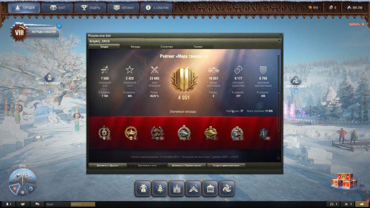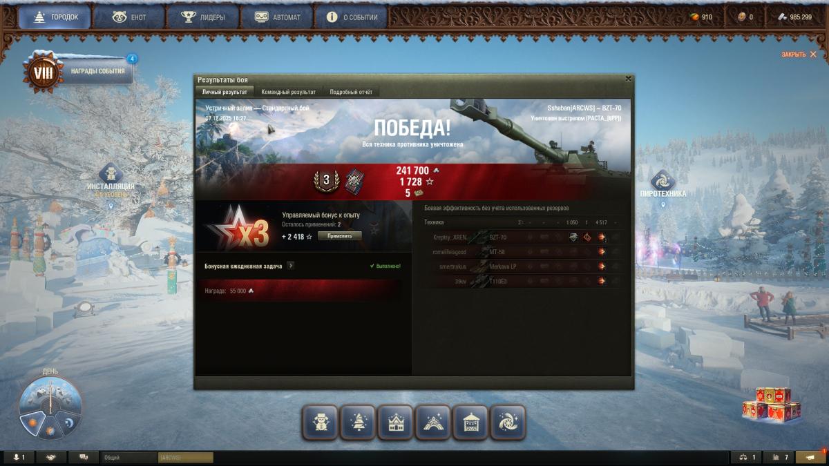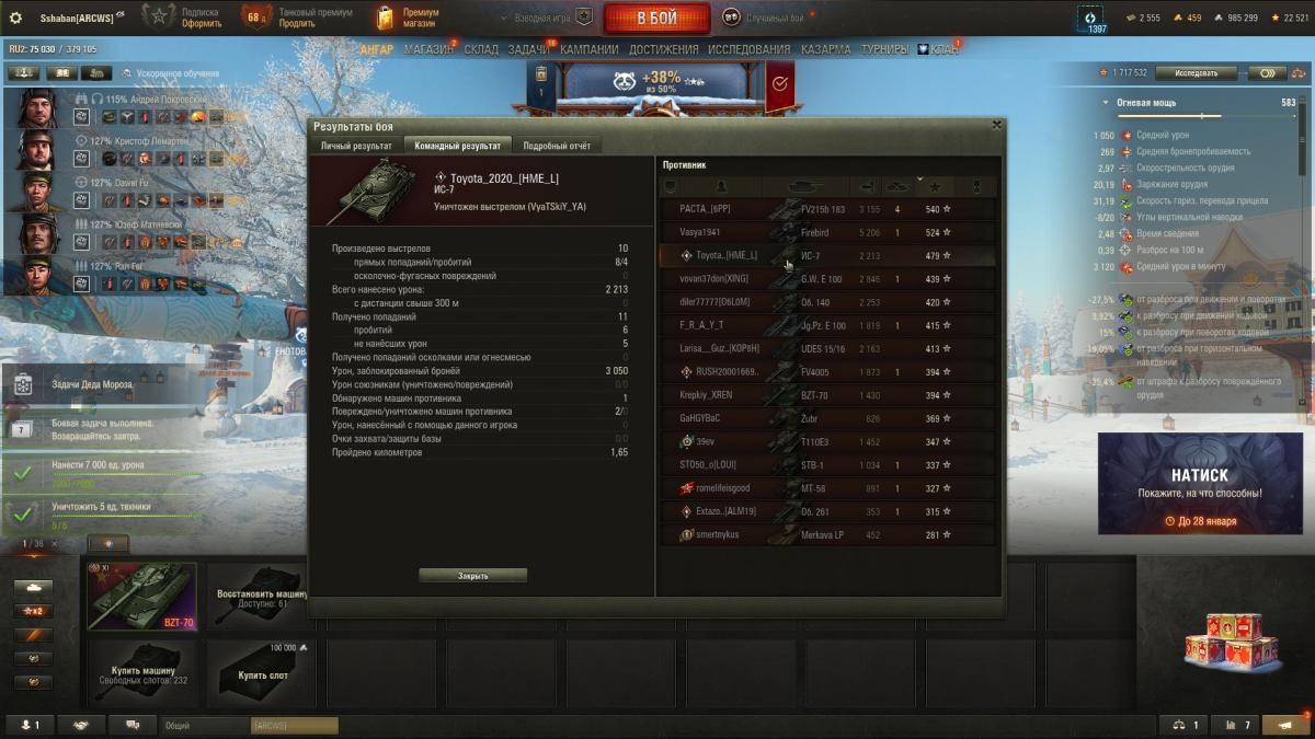 поздравьте. мне удалось выиграть в этом сраном казино. на этом откланиваюсь. в своих фантазиях занимаюсь оральным сексом с алгоритмами игры и ее разработчиками. догнал позавчера процент побед до 60, несколько боев 5к+, фан сплошной, так было в кайф. вчера алгоритм сказал - хватит. отметка с 84 упала в 80, процент побед с 60 до 57. пока я заряжаю второй барабан за бой - полкоманды уже сидит в ангаре. в рот я целовал эти алгоритмы. причем на любом сервере. сегодня все же удалось забрать вторую отметку. на этом хватит. танчик интересный, но фарм на нем так себе даже с учетом премаккаунта, новогоднего ббонуса, плюшек своих и от клана. пойду дальше фугасить на 8 лвл. по стрельбе всем кто говорит танк кривой смотрите ниже https://forum-mt-prod.lesta.ru/monthly_12_2025/post-15230370-0-67155700-1766418533_thumb.jpghttps://forum-mt-prod.lesta.ru/monthly_12_2025/post-15230370-0-69754100-1766418538_thumb.jpghttps://forum-mt-prod.lesta.ru/monthly_12_2025/post-15230370-0-78124300-1766418550_thumb.jpghttps://forum-mt-prod.lesta.ru/monthly_12_2025/post-15230370-0-54331500-1766418557_thumb.jpghttps://forum-mt-prod.lesta.ru/monthly_12_2025/post-15230370-0-57319200-1766418563_thumb.jpg стаб оптика трофейный прицел и инструкция к нему, наверное лучшая для меня сборка. пробовал с командиркой толку нет, пробовал с малошумкой - стою в кустах, лт нет, засветился умер. что к чему не ясно, никого не засветил в ответ. закончил в итоге побед 56, попадания 78% средуха 2500, асист 730, средний опыт за бой 1036( один из лучших у меня, за 1000+ их пересчитать по пальцам). с оптикой кстати насвет пошел добротный, раньше ее надо было ставить.
