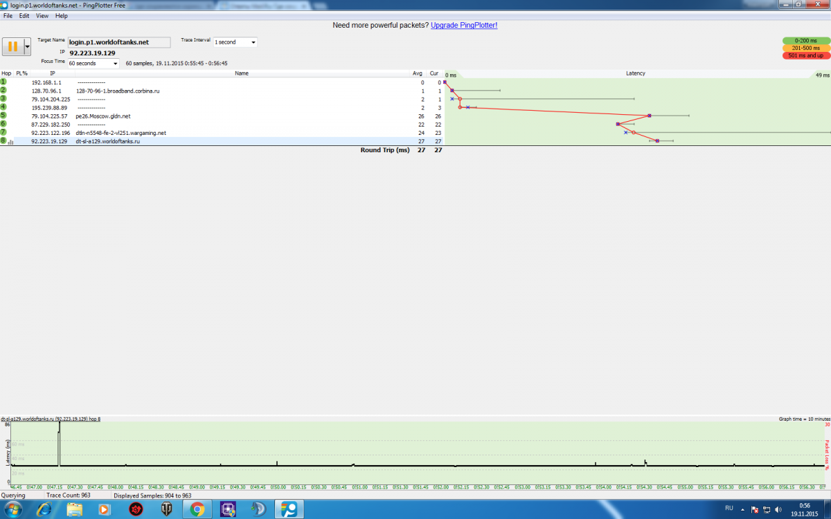 проблема появилась около месяца назад,во время 30 сек. отсчета (не каждый бой) загорается красная лампочка пинга и через несколько секунд выкидывает из боя с надписью "связь с сервером потеряна",если во время отсчета этого лага не произошло,весь бой играю нормально(каждый бой),но после того как танк уничтожили (не каждый бой) также загорается красная лампочка пинга и выкидывает с надписью "связь с сервером потеряна" .случайно нашел решение чтобы не выкидывало с сервера: если во время отсчета загорается красная лампа пинга нажимаю "Так точно" или напечатать букву и отправить,лампочка становится зеленой и играю дальше нормально. думал что с выходом патча 9.12 эта проблема пропадет,но нет,все тоже самое продолжается. г.Краснодар, домашний проводной интернет билайн,могу с 100% уверенностью сказать что такого до начала октября не было,даже припоминаю какое то микро обновление после чего эта проблема возникла. трасировку смогу сделать чуть позже и прикреплю здесь. почему то показывает только 8й хопDxDiag.txt тест.txt