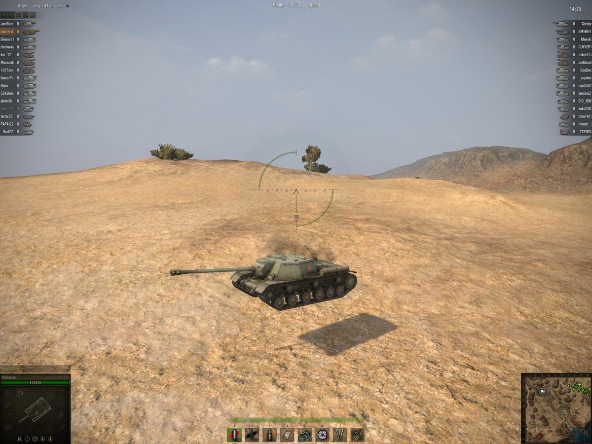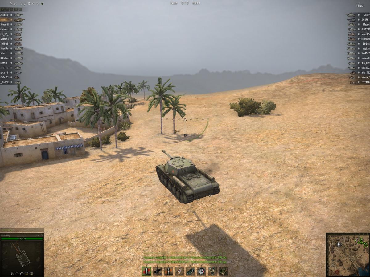 Всем привет))). Скорее всего данная тема имеет мало отношения к "Арт", но не знал где лучше разместить, поэтому остановил свой взгляд на более менее подходящем месте. Итак к чему всё это))). Все шло в обычном режиме: случайный бой, карта "Эль-Халуф", отсчет времени окончен, все прут на позиции... И тут происходит необъяснимое))), всё замирает, а моя ПТ зависает в воздухе. Конечно это были проблемы на сервере, лаги и т. д. Но мне подумалось вот бы враг удивился. Поднимает пушку, а сверху ему навешивают люлей))). Вообщем смотрите сами, судите сами, скриншоты прилагаются.