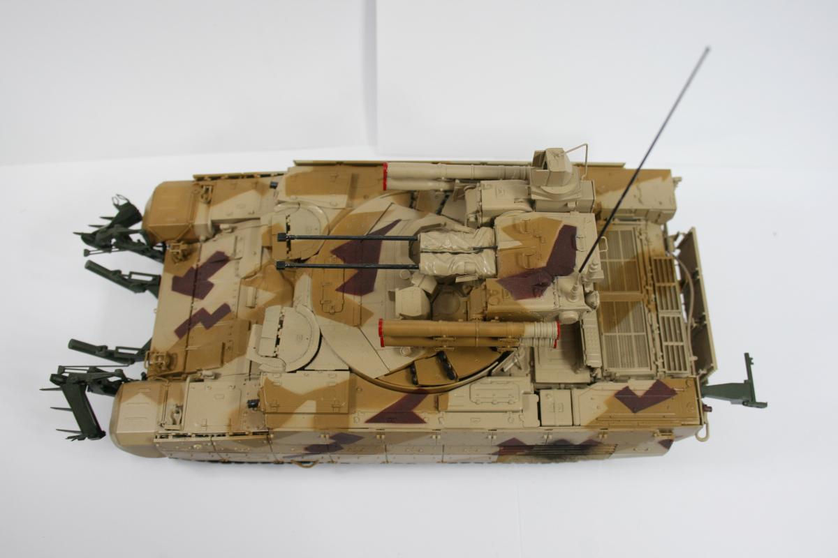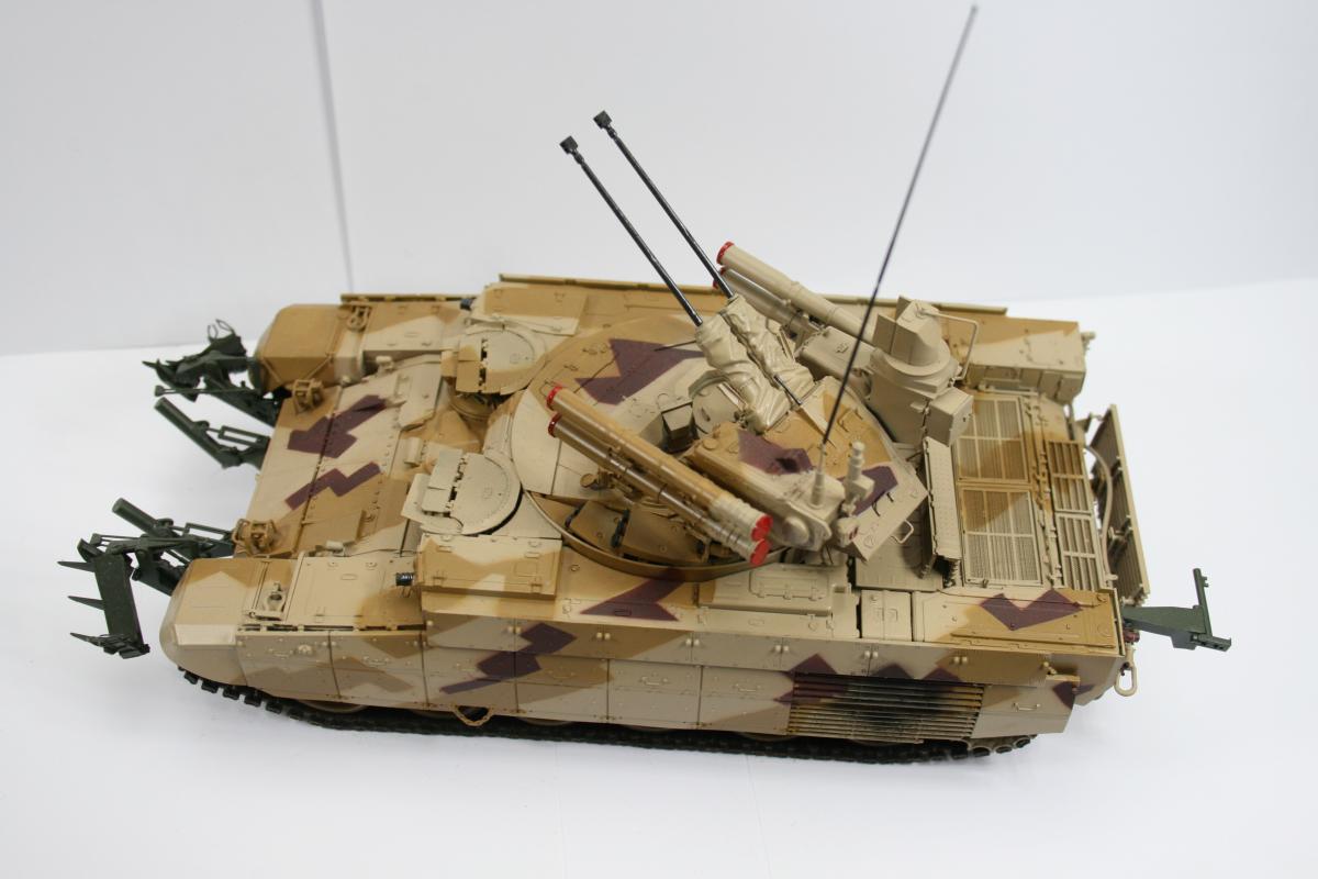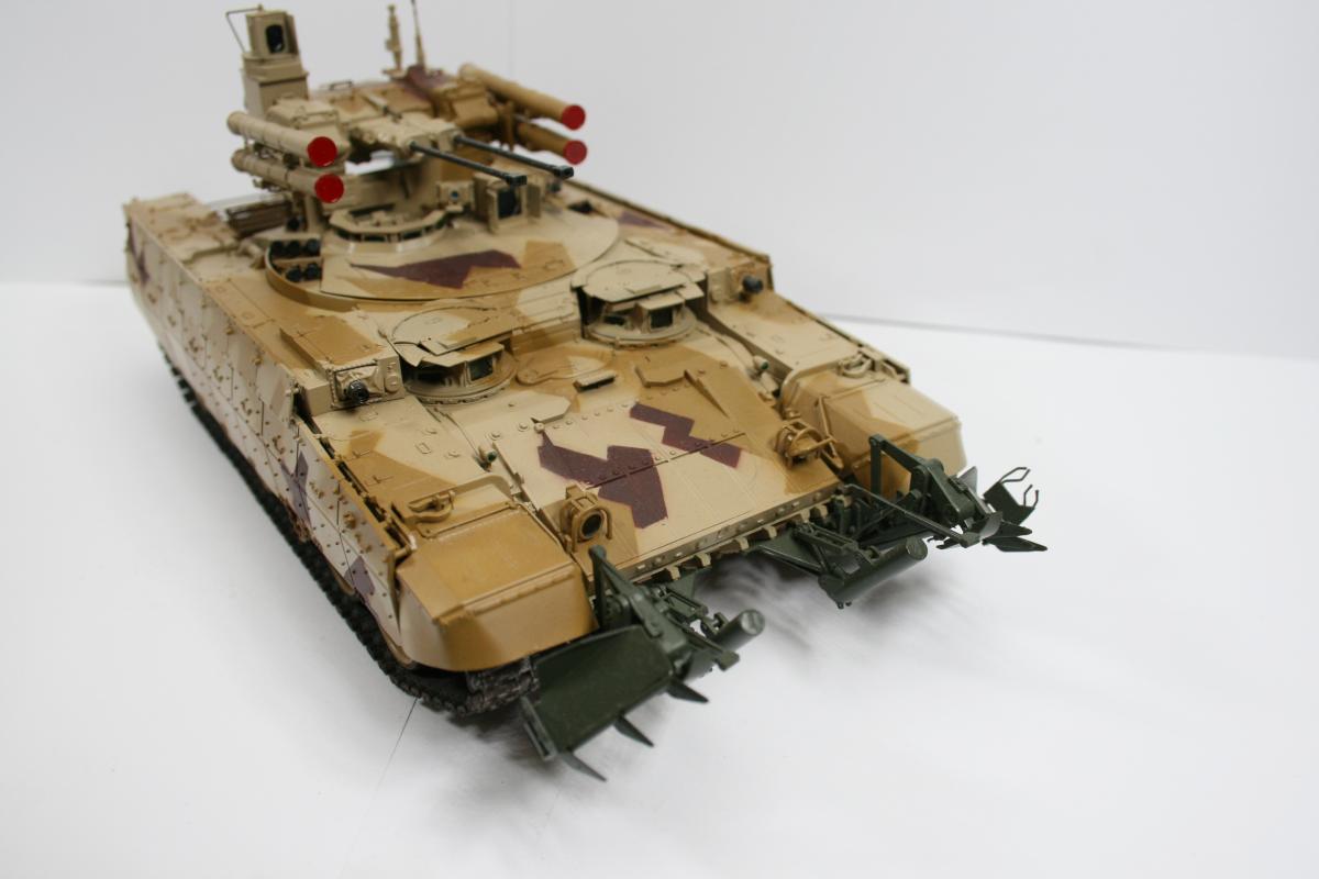 Доброго времени суток. Модель выставочной машины (поэтому такая чистая). Чуть припылена ходовая. Почему КМТ зеленый? потому что он такой в реале. Это навеcное оборудование, которое не красится в камо, обычно. Модель дополнена металлическими тросами от фирмы Eureeka XXL. Из этого же набора тросов взять точеный ствол пулемета. В остальном искоробка. Модель сложная в плане сборки, но соирается оч легко. Рабочая подвеска и траки. Модель стояла на полке около полугода, пока собирался с мыслями как покрасить камуфляж. Хотелось именно этот. В итоге была распечатан скан инструкции со схемой окраски, отмасштабирован. далее вырезались маски и по ним накрашивались пятна по основному песочному цвету. Краски Tamiya и mr.hobby. http://cdn-frm-eu.wargaming.net/wot/ru/uploads/monthly_05_2015/post-15761-0-28454100-1432538149_thumb.jpghttp://cdn-frm-eu.wargaming.net/wot/ru/uploads/monthly_05_2015/post-15761-0-03627800-1432538167_thumb.jpghttp://cdn-frm-eu.wargaming.net/wot/ru/uploads/monthly_05_2015/post-15761-0-32420400-1432538182_thumb.jpghttp://cdn-frm-eu.wargaming.net/wot/ru/uploads/monthly_05_2015/post-15761-0-11692600-1432538226_thumb.jpghttp://cdn-frm-eu.wargaming.net/wot/ru/uploads/monthly_05_2015/post-15761-0-05292900-1432538236_thumb.jpghttp://cdn-frm-eu.wargaming.net/wot/ru/uploads/monthly_05_2015/post-15761-0-66204800-1432538218_thumb.jpghttp://cdn-frm-eu.wargaming.net/wot/ru/uploads/monthly_05_2015/post-15761-0-98362600-1432538246_thumb.jpghttp://cdn-frm-eu.wargaming.net/wot/ru/uploads/monthly_05_2015/post-15761-0-78360300-1432538436_thumb.jpghttp://cdn-frm-eu.wargaming.net/wot/ru/uploads/monthly_05_2015/post-15761-0-54843300-1432538377_thumb.jpghttp://cdn-frm-eu.wargaming.net/wot/ru/uploads/monthly_05_2015/post-15761-0-57944100-1432538261_thumb.jpghttp://cdn-frm-eu.wargaming.net/wot/ru/uploads/monthly_05_2015/post-15761-0-41425300-1432538298_thumb.jpghttp://cdn-frm-eu.wargaming.net/wot/ru/uploads/monthly_05_2015/post-15761-0-51415700-1432538457_thumb.jpg