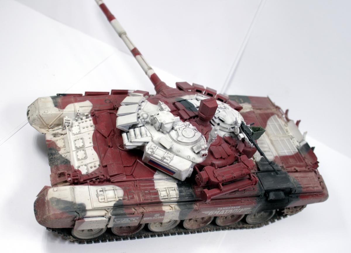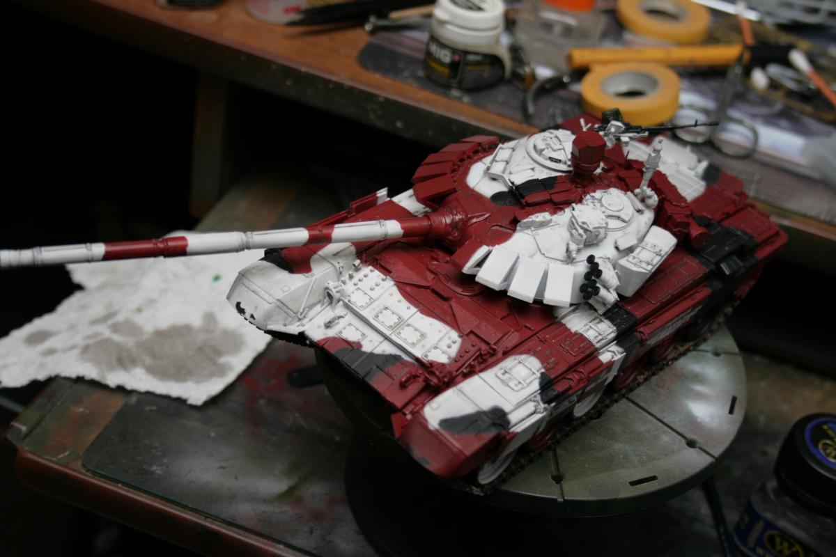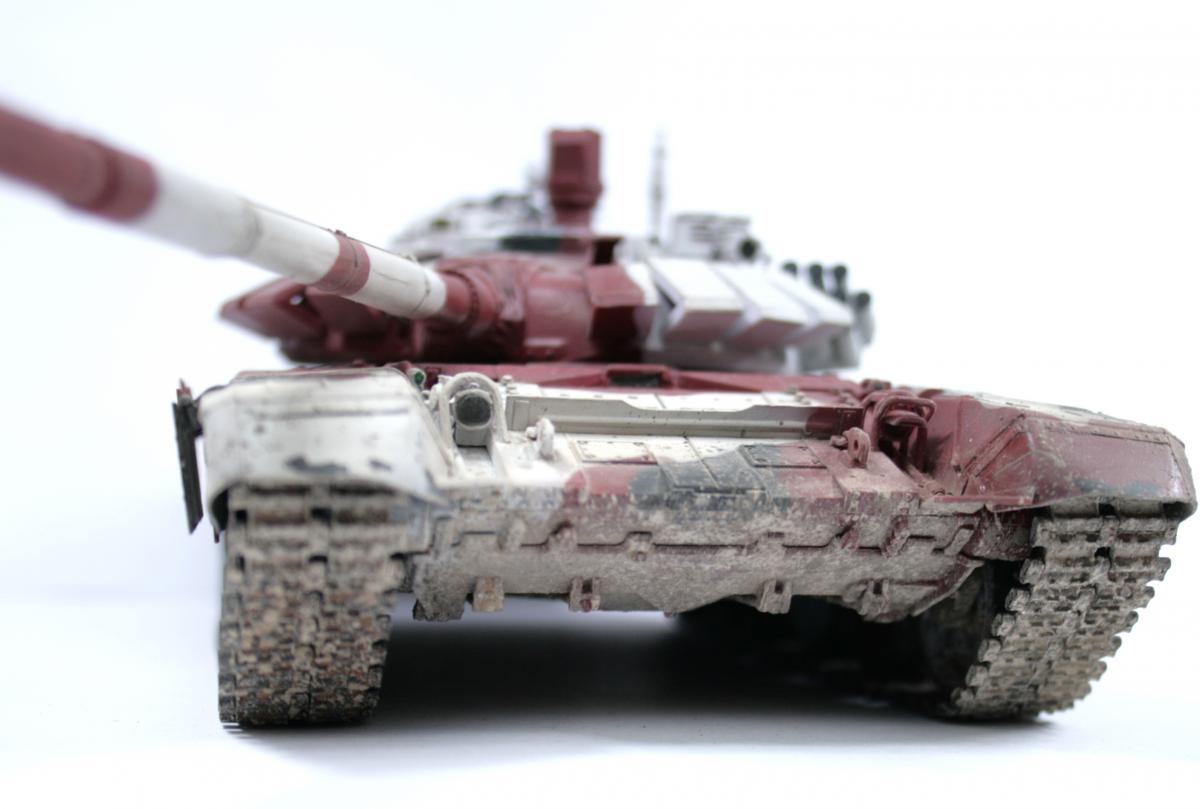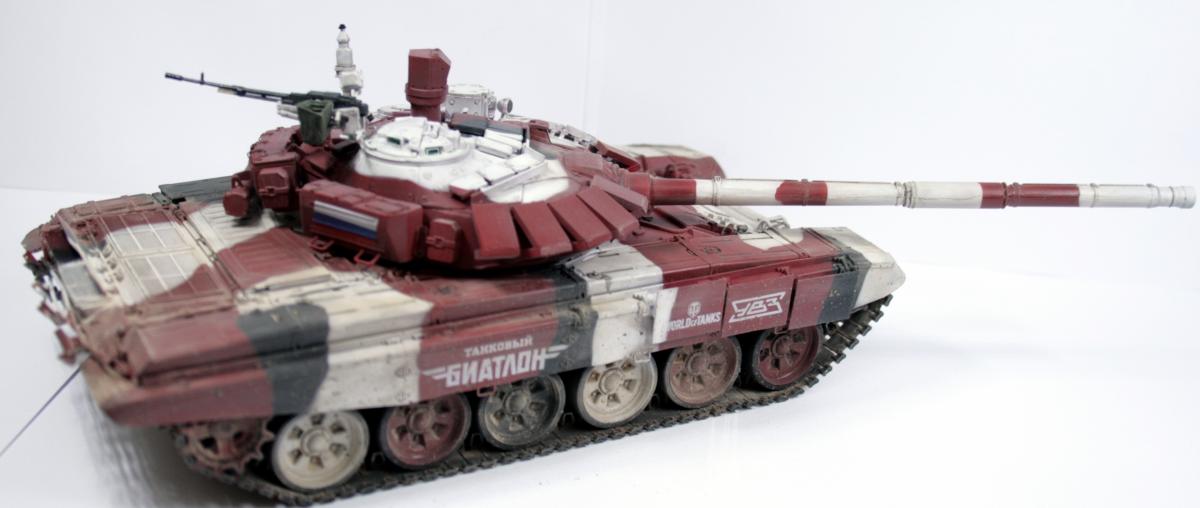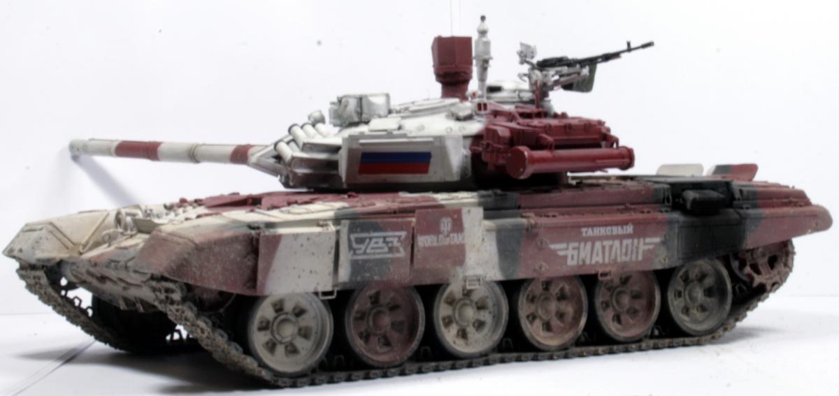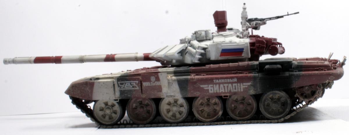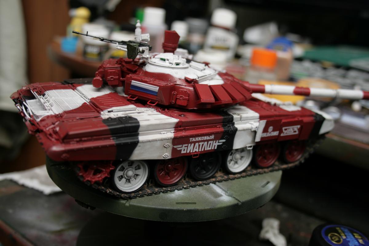 Доброго времени суток! Представляю вашему вниманию биатлонный танк команды РФ сезона 2014 г. Модель построена в подарок человеку имеющему отношение к организации биатлона. Спецзаказ так сказать) Почему эрзац? - потому что на настоящем биатлонном танке нет надбоя на броне. Здесь же он присутствует. Так же не совсем верен прицел наводчика. Самое главное, на мой взгляд, отличие это катки раннего типа, так сказать. На оригинале стоят облегченные новые. О самой модели и ее постройке Использованы материалы: - Trumpeter 05564 Russian T-72B Mod 1990 MBT - Прицел и дымовые гранатометы из набора MiniArm "Башня Т-72Б4" - Траки Мастерклуб - 9й блок ДЗ на лбу башни вместо ИК-осветителя от трумповского Т-90. - Пулемет КОРД от фирмы MiniArm - краски, химия из того что было в наличии Постройка прошла легко, траки собраны моментально) Окраска красками Tamiya и Mr.hobby. Черный: X-18 (semigloss black), Белый XF-2 с несколькими каплями серого, Красный же намешан на глаз. Окраска камуфляжа производил по снимкам в интернетах. Где то не совсем точно попал в границы, но вполне правдоподобно на мой взгляд вышло. В качестве масок использовал аналог блю такка фирмы UHU. Тут ничего нового и интересного. Поверх всего этого сделан фильтр Wilder NL-19 Grey-brown Filter. Затем им же сделана заливка. на фото видно не отфильтрованные катки - можно сравнить результат. Пыль - пигменты Фирмы Mig productions разные. Грязь: смесь на спирту миговский пигмент (для цвета) и немного алебастра (для фактуры). Далее полученая смесь бралась на старую кисть и сдувалась с нее аэрографом. Надо сказать в процессе нанесения грязи было намешано 5-6 оттенков. На этом танке для себя первый раз применил фильтр и смывку, а так же оттачивал опыт по нанесению грязи. Конструктивная критика приветствуется! Модель планируется на мини подставку с имитацией покрытия танкотрассы в районе танковой директрисы полигона "Алабино". Модель построена за 3 недели по вечерам, с перерывами и отвлекающими факторами других проектов. PS За матчасть прошу сильно не пинать. PSS следующий биатлонный танк будет "правильным". Но это уже совсем другая история.