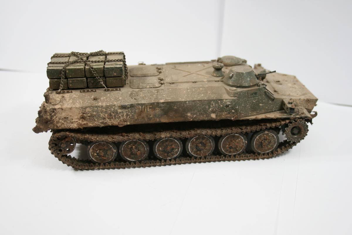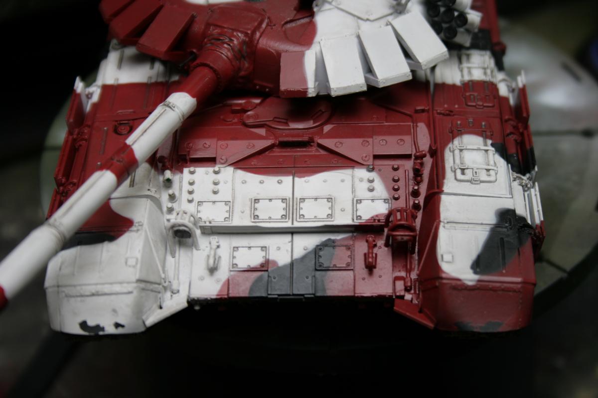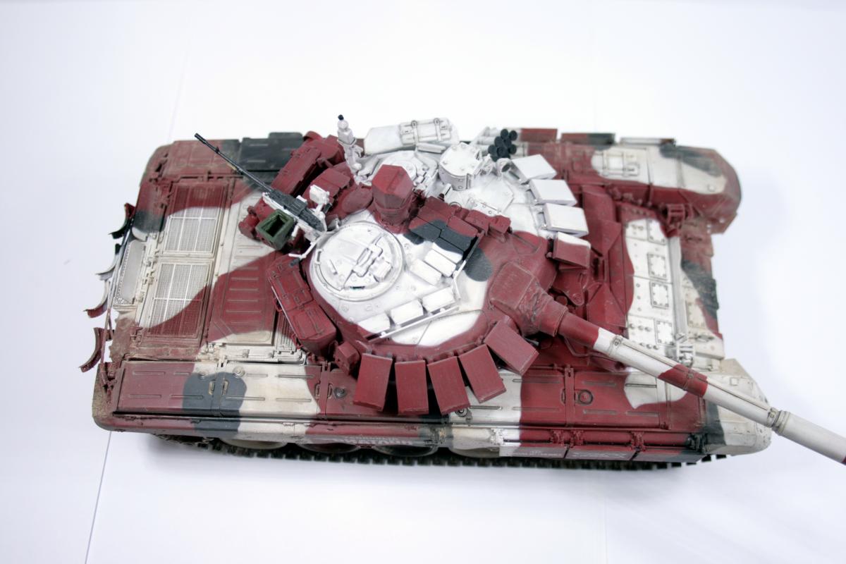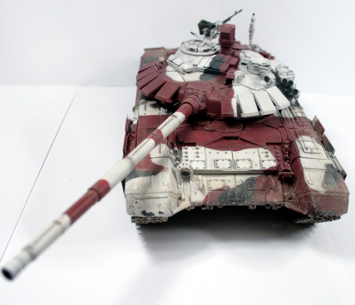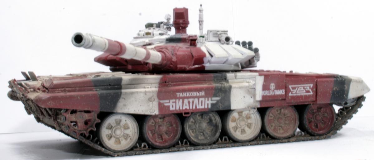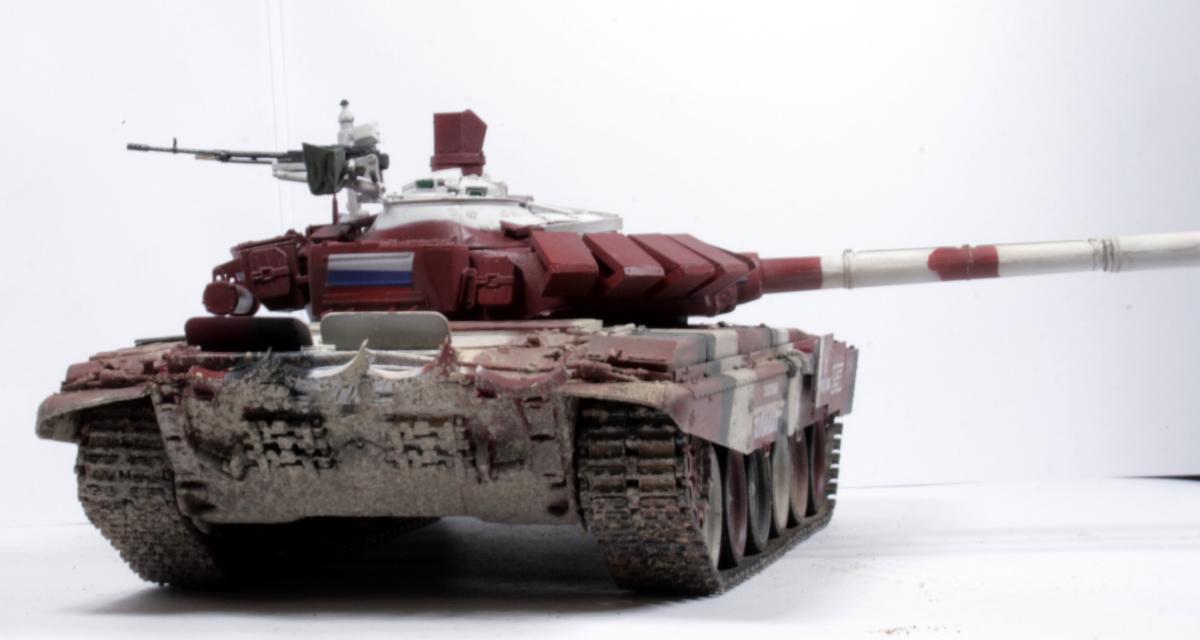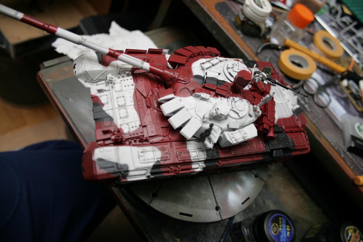 Доброго времени суток! Представляю вашему вниманию биатлонный танк команды РФ сезона 2014 г. Модель построена в подарок человеку имеющему отношение к организации биатлона. Спецзаказ так сказать) Почему эрзац? - потому что на настоящем биатлонном танке нет надбоя на броне. Здесь же он присутствует. Так же не совсем верен прицел наводчика. Самое главное, на мой взгляд, отличие это катки раннего типа, так сказать. На оригинале стоят облегченные новые. О самой модели и ее постройке Использованы материалы: - Trumpeter 05564 Russian T-72B Mod 1990 MBT - Прицел и дымовые гранатометы из набора MiniArm "Башня Т-72Б4" - Траки Мастерклуб - 9й блок ДЗ на лбу башни вместо ИК-осветителя от трумповского Т-90. - Пулемет КОРД от фирмы MiniArm - краски, химия из того что было в наличии Постройка прошла легко, траки собраны моментально) Окраска красками Tamiya и Mr.hobby. Черный: X-18 (semigloss black), Белый XF-2 с несколькими каплями серого, Красный же намешан на глаз. Окраска камуфляжа производил по снимкам в интернетах. Где то не совсем точно попал в границы, но вполне правдоподобно на мой взгляд вышло. В качестве масок использовал аналог блю такка фирмы UHU. Тут ничего нового и интересного. Поверх всего этого сделан фильтр Wilder NL-19 Grey-brown Filter. Затем им же сделана заливка. на фото видно не отфильтрованные катки - можно сравнить результат. Пыль - пигменты Фирмы Mig productions разные. Грязь: смесь на спирту миговский пигмент (для цвета) и немного алебастра (для фактуры). Далее полученая смесь бралась на старую кисть и сдувалась с нее аэрографом. Надо сказать в процессе нанесения грязи было намешано 5-6 оттенков. На этом танке для себя первый раз применил фильтр и смывку, а так же оттачивал опыт по нанесению грязи. Конструктивная критика приветствуется! Модель планируется на мини подставку с имитацией покрытия танкотрассы в районе танковой директрисы полигона "Алабино". Модель построена за 3 недели по вечерам, с перерывами и отвлекающими факторами других проектов. PS За матчасть прошу сильно не пинать. PSS следующий биатлонный танк будет "правильным". Но это уже совсем другая история.