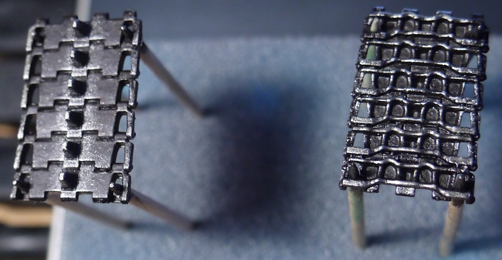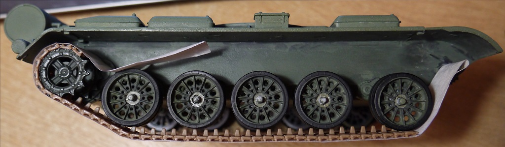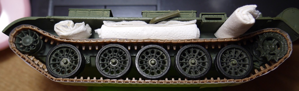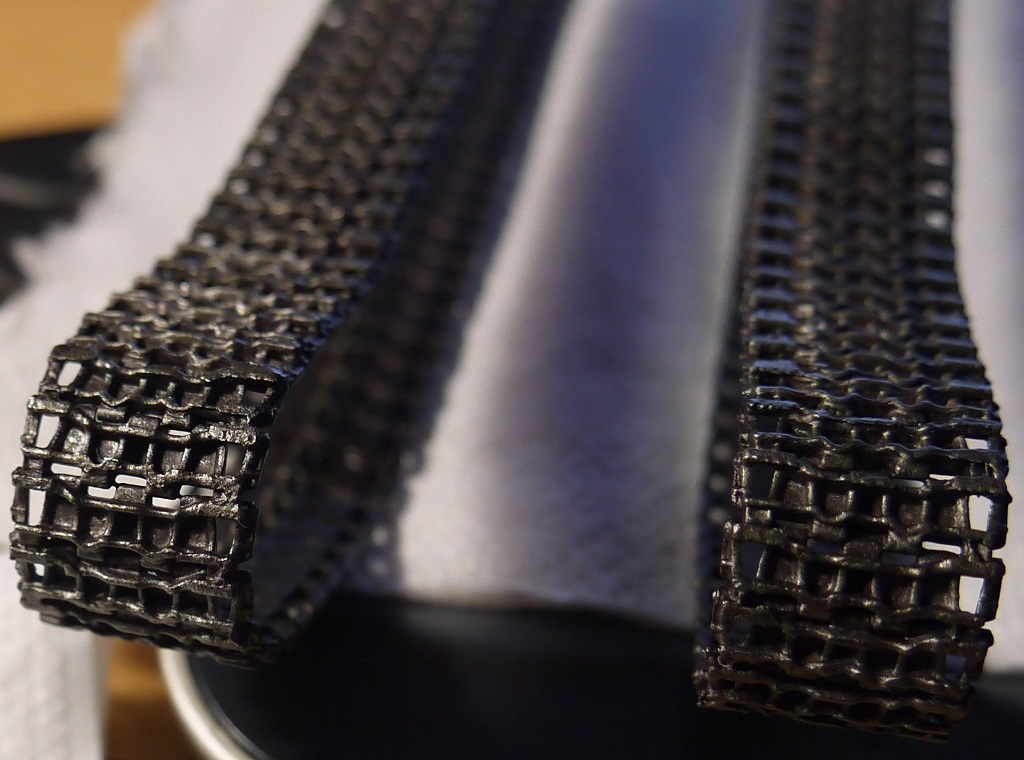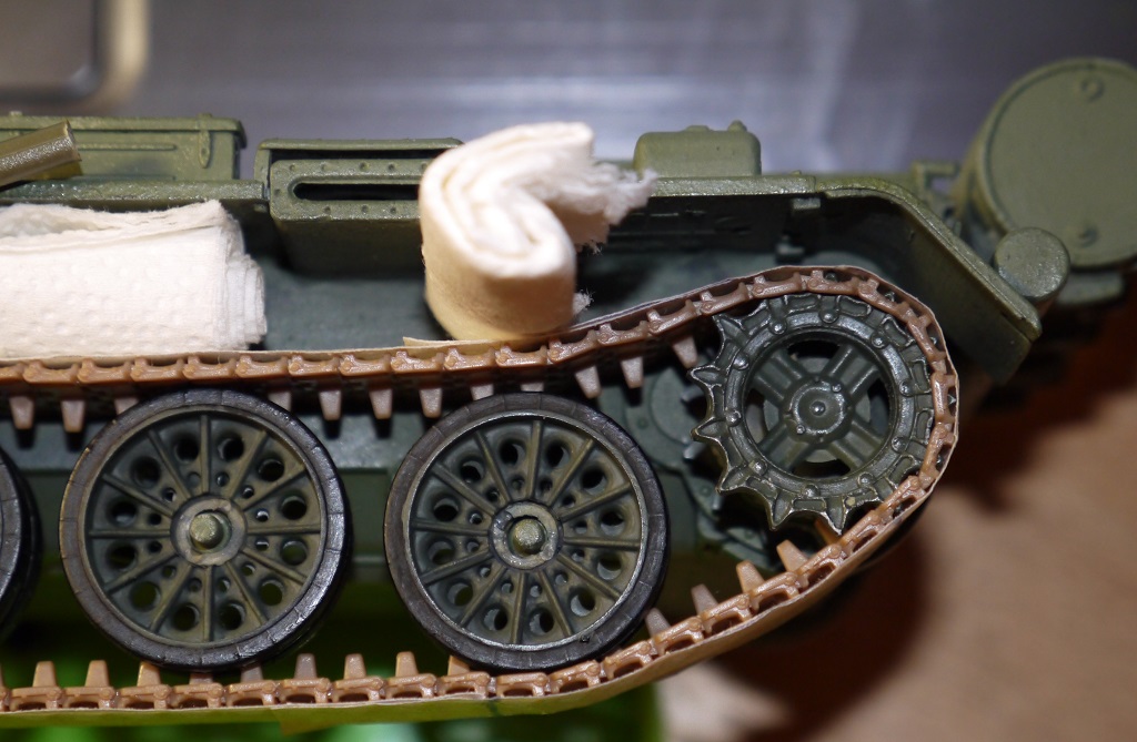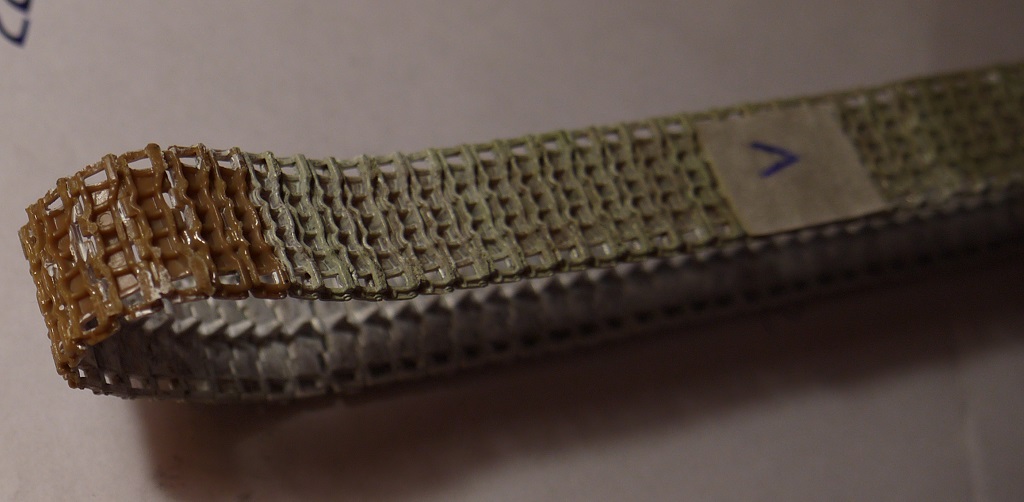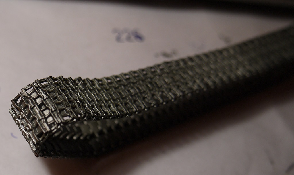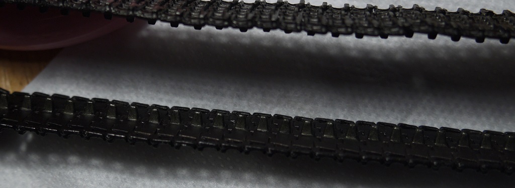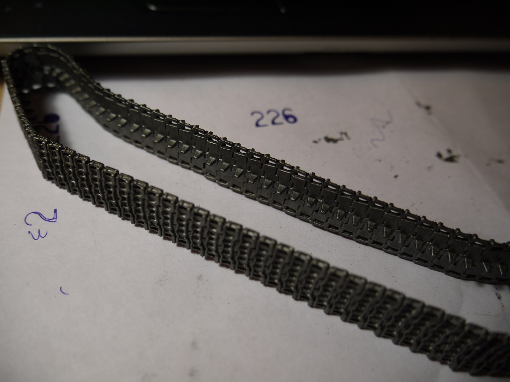 Доброго понедельничного утра всем, ну или у кого там что сейчас!) Давно что-то я не обновлял инфу тут. В общем гусли собраны. Как и предполагал, в месте, где они надеваются на звезду, траки расцепились, пришлось подклеивать. И ещё звезда одна развалилась)) Ну это мелочи) При сборке на скотче, опять же, как я и предполагал, есть один нюанс - когда промазываешь жидким клеем Tamiya, он, затекая под траки, т.е. между траком и скотчем, подплавляет там пластик и в этом месте остаются плоские участки плавленой пластмассы (фото с недогрунтованной гусеницей). Но таких дефектов оказалось не так много, так что я забил и после покраски их должно быть не так видно. Загрунтовал, покрыл слоем серого металлика Tamiya. Далее думаю смешать чёрный с Hull Red Tamiya и покрыть сверху.