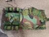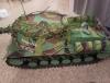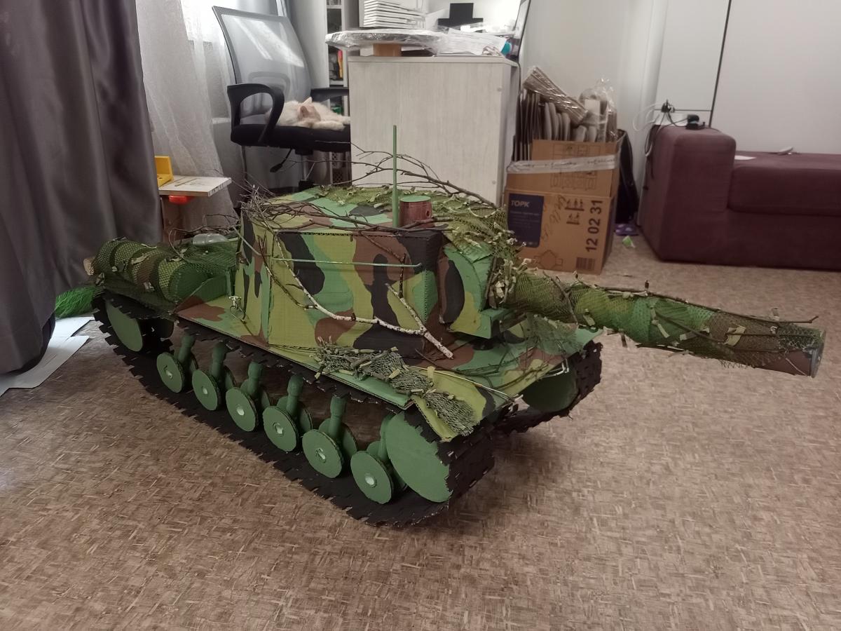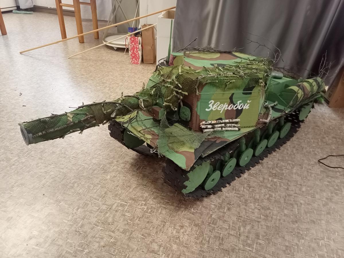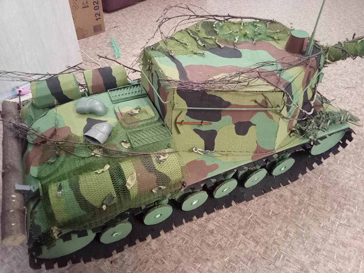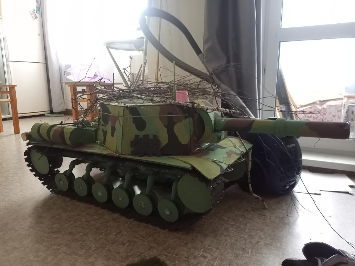 И так товарищи, категорически приветствую Вас! В детском саду была поставлена задача - сделать технику времен ВОВ для выставки, приуроченную к 9 мая. "Сказано - сделано" - подумал я, потирая руки Предсталяю Вашему вниманию, проект танка СУ-152 в примерном масштабе 1/9 Габариты : Длина корпуса 1000мм ( без учета длины ствола) ширина 520мм высота 420мм Используемые материалы : Корпус - картоний 999 пробы от тещиного шкафа Гусеницы - картоний 999 пробы, наборные , 65 элементов = 1 трак Поручневая антенна - перекладины от раскладной сушилки, которую унесли на мусор Смотровой прибор - пластиковый стакан Штыревая антенна - Кусок деревянного круглого погонажа в который вклеян кусок палочки от суши Маск.сеть - старая мочалка Камуфлирующие элементы - обрезки старой камуфляжной футболки тестя Выхлопные трубы - 90град уголок канализационной трубы на 50,нагретый и сплющенный Решетка МТО - фрагмент пластикового ящика для фруктов Лом - гвоздь на 200, нагретый в печке, с одной стороны раскованый, доработанный болгарским CD-плеером ( надеюсь все поняли) Кирка - гвоздь на 200, нагретый в печи, раскованный до состояния пластины, вырезанный болгарским CD-плеером по форме, загнутый на газовой горелке. Рукоять - палочка от суши, пропитанная морилкой Буксировочные петли - из перекладин сушилки для белья (из тех же , что и поручневые антенны) Буксировочные тросы - остатки струнного карниза Фиксаторы буксировочного тросса - электрическая клеммная колодка Торсионная часть подвески - ПП труба на 20 Ветки - из веток Бревно - из бревна Пушка - 2 куска канализационной трубы на 50, в которую вклеян на силиконовый клей кусок алюминиевой трубы на 40 с толщиной стенки 2мм. PS : А еще он стреляет