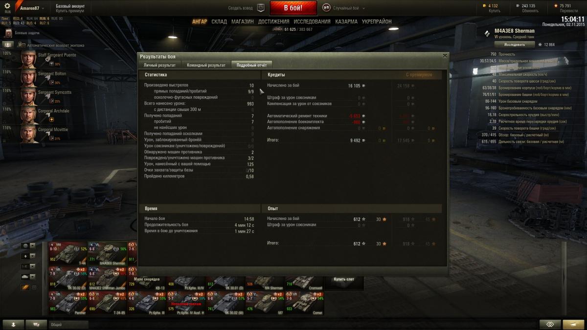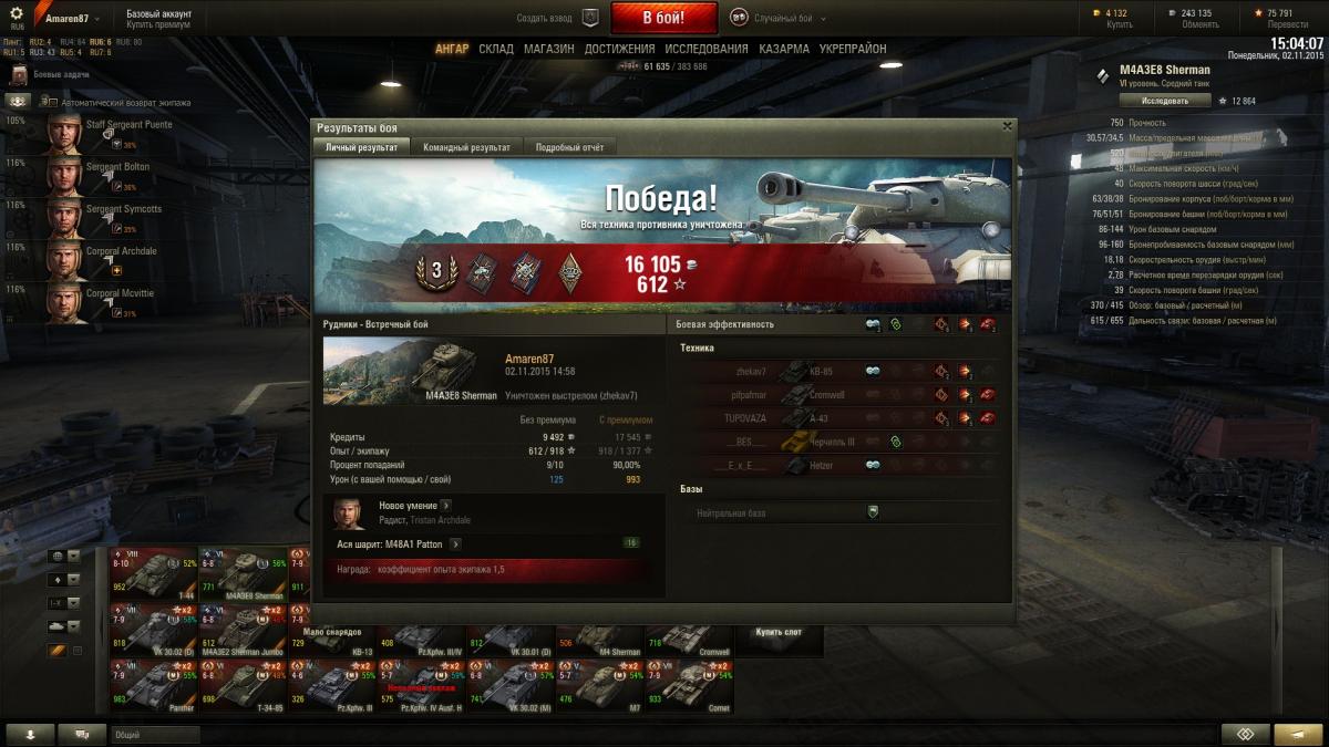 150 боев, 59% побед, 435 средний опыт. Как по мне - это ПТ с башней, так что модули поставил соответствующие - сеть, рога, приводы наводки. Броня позволяет танковать 3 уровни и некоторые 4, но против 5 и выше уже не помогает из-за того что она веде под прямыми углами. Пушка пробивная, точная, скорострельная, но низкая альфа и отвратительные углы вертикальной наводки, так что качели, да вообще ближний бой, танку противопоказан. Зато на дальних дистанциях мы можем свободно реализовать свой дпм, плюс к тому, обзор у черчилля лучше чем у того же кв-1(310м) и кв-1с (330м), так что порой можно нашпиговать вражину снарядами до того как он вообще тебя заметит. На средних дистанциях по нам уже будут стрелять в ответ, но зато мы в свою очередь уже можем выцеливать слабые точки. Также черчиллю противопоказаны покатушки по холмам да и вообще на любом неровном рельефе - пушка вниз совсем не опускается.