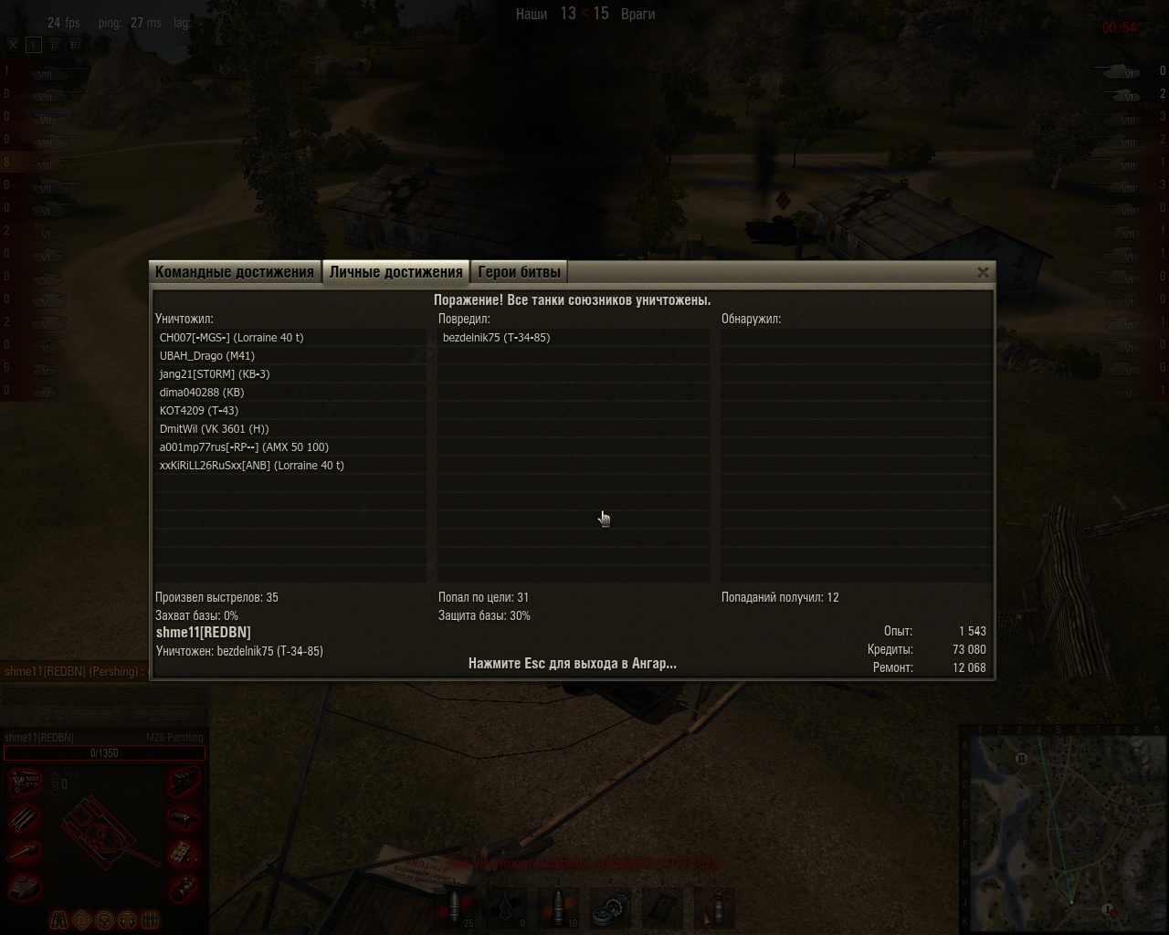К сожалению, есть только один скриншот, но есть реплей, все честно. Итого: Результат: Поражение "Честного" опыта: 1543 Опыта всего: 1543 Кредитов: 73080 Карта: Рудники Танк: M26 Pershing Реплей: http://wotreplays.ru...11-m26_pershing