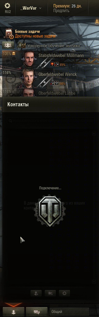 Здравствуйте. Уже ровно сутки, как сломался интерфейс контактов в игре. Вчера при попытке добавить контакт из общего списка в созданную группу, получил сообщение об ошибке (что-то типа "команда не доступна, попробуйте позже" ). После чего, все контакты в списке исчезли и вместо них отображается вращающаяся шестерёнка. Со списком приглашения во взвод - та же история, список пуст. Собственно вопрос: как лечить? P.S Моды удалил, не помогло. http://cdn-frm-eu.wargaming.net/wot/ru/uploads/monthly_03_2015/post-16496807-0-50300100-1426947491_thumb.jpghttp://cdn-frm-eu.wargaming.net/wot/ru/uploads/monthly_03_2015/post-16496807-0-48438000-1426947505_thumb.jpg
