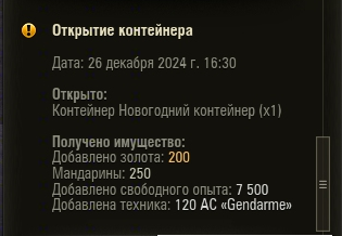 Открыл 20 коробок,выпало 2 танка,самые нежеланные на 2 этапе,совкопэтэ и жандарм.https://forum-mt-prod.lesta.ru/monthly_12_2024/post-1657842-0-67804500-1735195628_thumb.pngХотел Н-3 и Немезиса.Но всё равно спс.Коробки блогерские.Хорошо что теперь уж точно будет падать то ,что надо.https://forum-mt-prod.lesta.ru/monthly_12_2024/post-1657842-0-27737900-1735195796_thumb.jpg