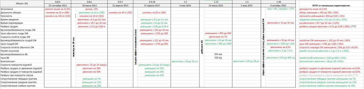 Я сделал похожее, но в таблице по Объекту 261, начиная с ввода в 2011 году - смотрите изображение Вот итог по всем характеристикам, которые изменялись с момента ввода. Указана разница значений. доходность ниже на 0,5% обзор уменьшен с 400 до 300 (-25%) прочность уменьшена с 650 до 510 (-21%) сведение уменьшено с 6,5 до 4,5 сек (-31%) кд увеличено с 29,7 до 34 сек (+12%) разброс орудия увеличен с 0,42 до 0,59 (+28%) (???) пробитие ОФ уменьшено с 102 до 45 мм (-56%) урон ОФ уменьшен с 1700 до 1100 (-35%) скорость снаряда ОФ уменьшена с 546 до 510 (+6,5%) разлёт осколков увеличен с 5 до 7,5 м (+50%) пробитие ББ увеличено с 520 до 600 (+15%) боекомплект увеличен с 18 до 28 (+55%) разброс орудия от движения ходовой увеличен на 8,9% разброс орудия от поворота ходовой увеличен на 8,9% разброс при повороте ствола уменьшен на 43% (???) сопротивление твёрдым грунтам уменьшено на 7% сопротивление средним грунтам уменьшено на 12% сопротивление слабым грунтам уменьшено на 19% У других арт всё гораздо печальнее, тот же Т92 или Конь Сюда отдельно добавлю что ещё есть отдельный перк для всех танков, который определяет что по тебе стреляет арта. Ещё маркер попадания снаряда и видны её трассеры. Покажите ещё хоть один класс техники в игре, который сопоставим с нерфом ТТХ за всё время? Таких нет ---- Я от себя добавлю что я не такой уж артавод: качал ветки, потом Полевую. После попробовал ЛБЗ, бросил и перешёл на редкое выполнение ЕБЗ на ней по кол-ву критов или кол-ву попаданий. Сейчас я так понимаю что на ней играть вообще бессмысленно. ЛБЗ я давно бросил, не понимаю кто будет выполнять эти задания на 45 сбития гусениц за 279 объект (р), если за сброс Орбиты можно получить 279, который гораздо лучше. Остальное даже не хочу обсуждать, там сплошное количественное упоранство --- На всякий случай: да, я умею жать не только ЛКМ, но и WSAD находясь не только на третьей линии или у респа базы. Учитывая что 261 на голову лучше (в затылок дышит 155 58 из-за башни и барабана) всех остальных арт благодаря точности, то даже на 261 стрелять ББ вообще не вижу смысла, в большинстве случаев ты если и попадёшь - то будет непробитие, т.е. бесполезная трата снаряда и времени, который потециально мог дать хоть какой-то урон (= заработать серебро/опыт). Для других арт это вообще пытка, учитывая разброс, кд и ВБР На заключительных этапах боя от неё нет никакого толка, она медленная, неповоротливая, дырявая, слепая (у 261 ещё могут и кончиться снаряды). Имеет смысл только идти в размен хп, если нужно другому шотному сокоманднику добрать опасного соперника, а тот заряжен. Ну или на крайний случай брать базу, если соперник светился на другом конце карты и это какой-нибудь Т95 или БЗТ-70