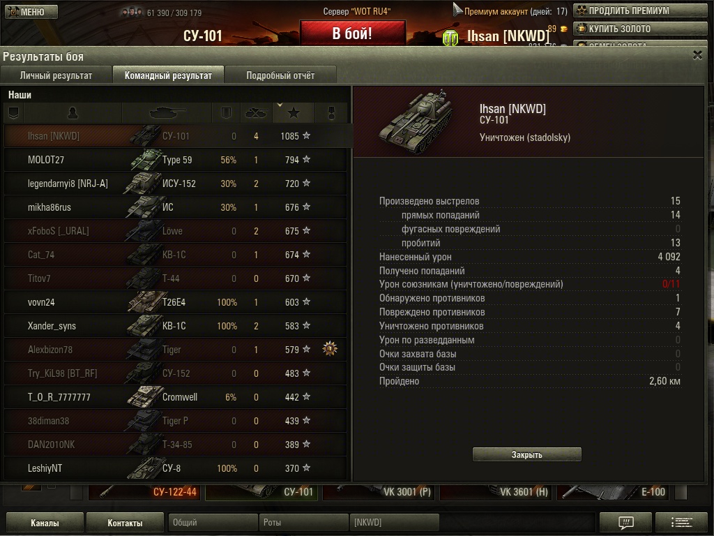 За этот бой в Химмельсдорфе на су-101 произвел 15 выстрелов, 14 попаданий, 4 фрага, 7 повредил, нанес урона на 4092. Под конец боя разился об су152. Но по итогам боя медаль "Снайпер" почему-то дали не мне, а игроку на Тигре. Хотя у него всего 10 выстрелов, 9 попаданий и нанесено урона всего 773. Мне не обидно, по любому медаль не последняя. Просто интересно: "Почему". Правила выдачи медали я знаю.