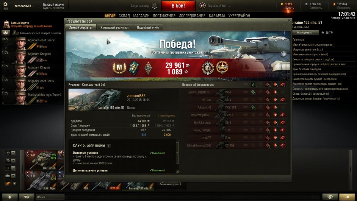Наконец выполнил лбз-15. Катал на амх-30 (проходил) и в итоге когда осталось 5т. опыта чтобы его пройти,сошлись звёзды и смог подсосать вафлю и 268,настрелял 2к. урона и смылся в дальний угол (для того чтобы не убили и не выполнять лт15). Поджёг кстати выполнил пока проходил вз-120 (поджёг 1390 и 140 с первых же двух выстрелов) на 120 одного за бой обычно шарой да поджигаешь. Посмотрел задачи на 260 их я не осилю ))) Всем удачи в выполнении!