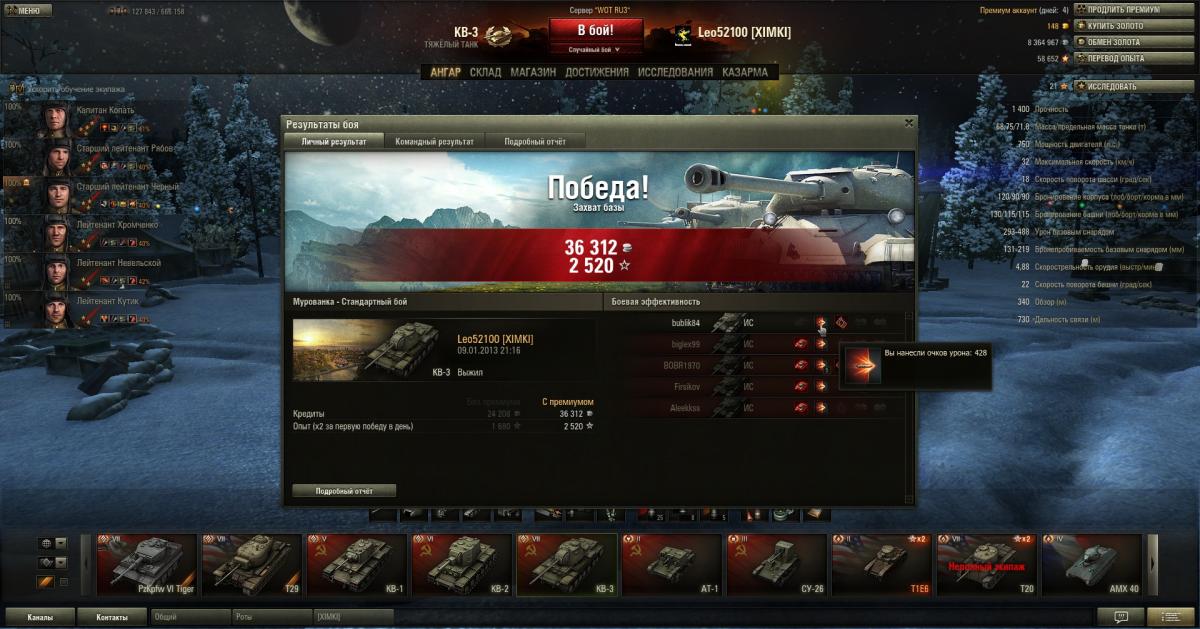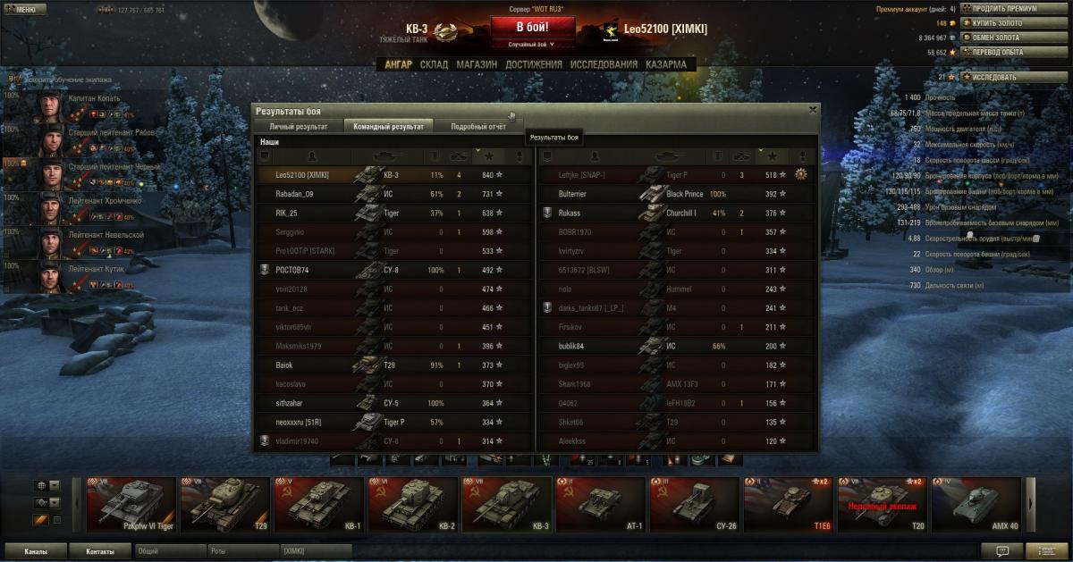 На 7-ом уровне я - поклонник Т29 и КВ-3. Т29 - я называю его комфортным убийцей. Сражаться на нём легко: движется быстро и плавно, башня вращается прекрасно, обзор отличный, точность, пробитие и урон достаточные. КВ-3 - боец, мощь, крепкость. К тому же он олицетворяет СССР, который я уважаю. Играть на нём трудно, но в этом-то и вся прелесть игры на нём. Последнее время нравится на обоих валить ТТ-8 (ИСов-3, Т32 и Т34), а также наносить урон в ком.башни амеров (Т29, Т34). Ну, а лупить ИСов, Тигров, КВАСов в ком.башни - это уже банально. Вчера бой был, он интересен тем, что в нём сошлись только ТТ-7 различных моделей, причем: - у нас были 7 ИС, Тигр, Тигр-П, Т29, и я на КВ-3; - у противника 6 ИС, Тигр, Тигр-П, Т29, Чёрный Принц. Пришлось показать, кто "папка" среди ТТ-7... правильно, как вы догадались, в столкновении брони и мощи оружия на сравнительно равнинной местности с лесом, холмами и домами, при небольших дистанциях противостояния им оказался КВ-3. Скриншоты см.ниже. Признаюсь, атаку не возглавлял, двух первых ИСов валили дружно, но выстрелы КВ-3 были убийственными, ставя точку в перестрелке. А вот 2 последних ИСа были повержены в прямом бою с обоими: все мы были пораненными, они нападали одновременно вдвоем в секторе 45 градусов, приходилось вертеться для рикошетности, ХП таяли. Но броня советского солдата КВ-3 выдержала, а мощь и точность орудия позволила уничтожить обоих вовремя. Как видно из скриншотов, со стороны противника наиболее упорным был Тигр-П, наиболее живучим - Чёрный Принц. А вот наш и ихний Т29, к моему удивлению, себя почему-то не проявили. Странно, что наш Т29 выжил, но его вклад в победу совсем невысок (низ списка по опыту). P.S. (это моя поздняя правка) в эту фразу "в столкновении брони и мощи оружия на сравнительно равнинной местности с лесом, холмами и домами им оказался КВ-3" я добавлю-ка еще эти слова "при небольших дистанциях противостояния".