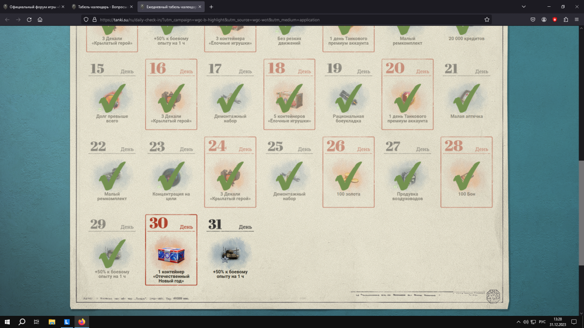 Получается если бы не заглючил календарь, то я должен был остановиться на 30 включительно, забрав награду. Вы пытаетесь настаивать на том, что я не понял как все работает. Но было самому удивительно, что я пришел с работы, поужинал, запустил лаунчер игры, перешел в табель-календарь, авторизовался, а очередная награда просто не прожималась, даже через другой браузер.
