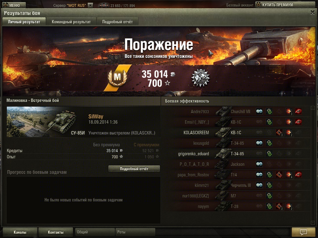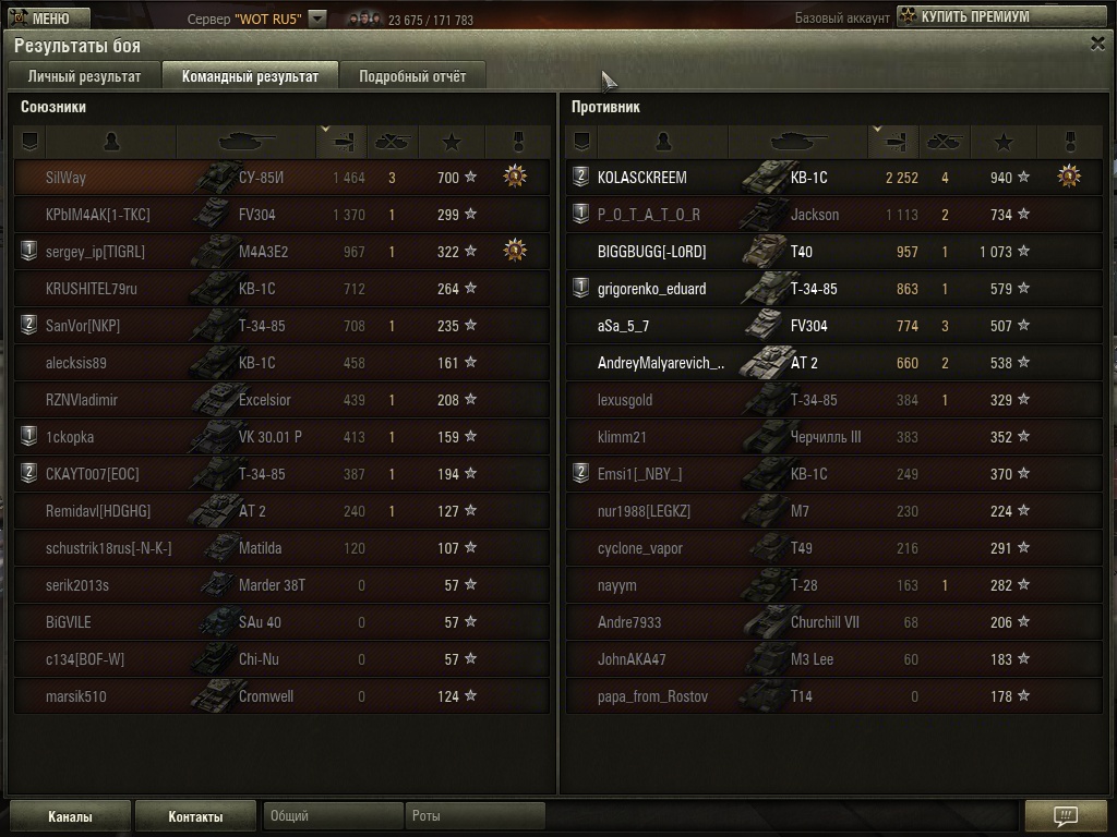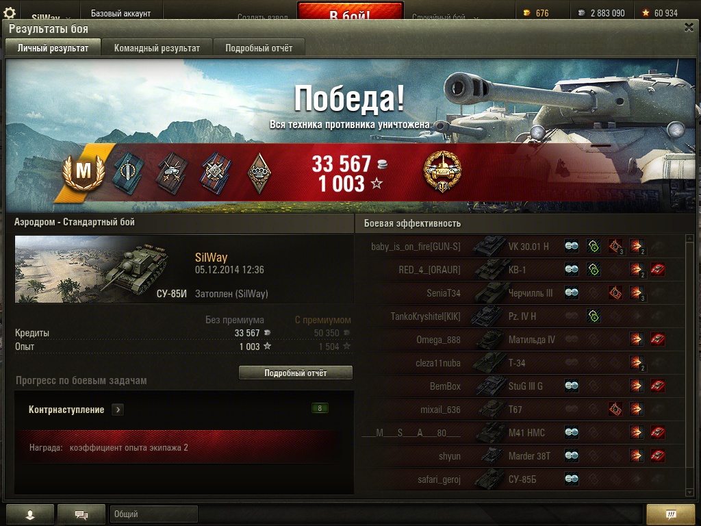 Сразу извиняюсь за многабукф. Ну не умею я коротко. Болтливый.http://cdn-frm-eu.wargaming.net/4.2/style_emoticons/wot/Smile-tongue.gif Решил купить себе первый прем-танк. Много денег тратить было жалко. Решился именно на СУ-85И. Ну у меня пока что только советская техника. Экипаж заодно качать хотел да и фармить надо было. По сравнению с черчелем она мне показалась проще и интересней. При покупке остерегало то, что танк нравился только папкам и часто от них можно было услышать "машина требовательна к рукам". Опыт на советских ПТ есть. В принципе нравиться. Купил и не пожалел! Мне машина очень понравилась несмотря на мои http://cdn-frm-eu.wargaming.net/4.2/style_emoticons/wot/Smile_crab.gifhttp://cdn-frm-eu.wargaming.net/4.2/style_emoticons/wot/Smile_deer.gif. Дело то нехитрое. Находишь кустики и шмаляй в красных. С 300 метров меня практически ни кто не видит (маскировочная сеть+ перки у всего экипажа маскировка 94%) Играю без модов ибо комп-калькулятор. Так вот 300 метров это 3 квадратика на миникарте. Многие и ПРИ СТРЕЛЬБЕ с 200 метров только замечать начинают! Голдой не пользуюсь ибо уйду в минус, а с моими 48% уж лучше серебра побольше привезти, нежели победу. Да и не нужны они! У нас есть замечательные фугасы. По 30-50 урона прекрасно наносят вставшему ромбом КВ-1. Брони нету, да. Хотя как нету. За 21 бой 2 медальки невозмутимого! ЛТ с барабанами не всегда пробьют. Кстати она очень неплохо светит! Вы замечали, что урон по засвету всегда как-то криво начисляется? Иногда стоишь дальше всех, а поитогам оказывается ты светил. Или с точностью наоборот. Так вот я со стереотрубой практически всегда удивляюсь сколько дамага я насветил, хотя другие танки были куда ближе. Фантастика! Про фарм. Он есть. По ощущениям как с премиум аккаунтом. То есть где-то на 30- 50% больше, чем на обычном танке 5-го уровня. В общем пока только положительные отношение. Меня так не каждая обычная техника радует. Ну и главное. МАСТЕРА ВЗЯЛ! http://cdn-frm-eu.wargaming.net/wot/ru/uploads/monthly_09_2014/post-17174815-0-79062500-1410992436_thumb.jpg http://cdn-frm-eu.wargaming.net/wot/ru/uploads/monthly_09_2014/post-17174815-0-34433800-1410992438_thumb.jpg http://cdn-frm-eu.wargaming.net/wot/ru/uploads/monthly_09_2014/post-17174815-0-46220300-1410992439_thumb.jpg Малиновка-встречный бой. Занял кусты между квадратами D7-E7 и весь бой там простоял. Стрелял только ББхами. Сам в шоке! http://cdn-frm-eu.wargaming.net/4.2/style_emoticons/wot/Smile_ohmy.gif Совет покупателям. Если вам понравились такие машины, как Су-85, су-100 и не сильно выбесила Су-100М1 то покупайте её и не пожалеете. Главное помните про тактику http://cdn-frm-eu.wargaming.net/4.2/style_emoticons/wot/Smile_bush.gif
