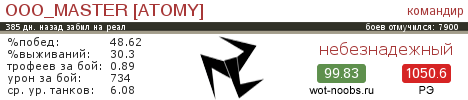 Доброго времени суток уважаемые друзья! Вот решил пополнить свой начинающий клан хорошими игроками) требование не большие) - возраст от 18 лет - кпд не менее 1050 РЭ - от 7т. боев - наличие связи ( желательно по скайпу) - процент побед в принципе не важен если у вас выше 1000 кпд) - прайм тайм свободный ссылка на клан http://worldoftanks.ru/community/clans/96961-ATOMY/ от себя: Могу предложить взводные и командные бои, люблю играть во взводе со связью (скайпом), если есть желание воевать в ГК могу поддержать) мне 18 лет! свой нубо-рейтинг прикрепил картинкой. у меня 7900 боев, кпд 1050! И еще кому эта тема не интересна прошу молча пройти мимо)