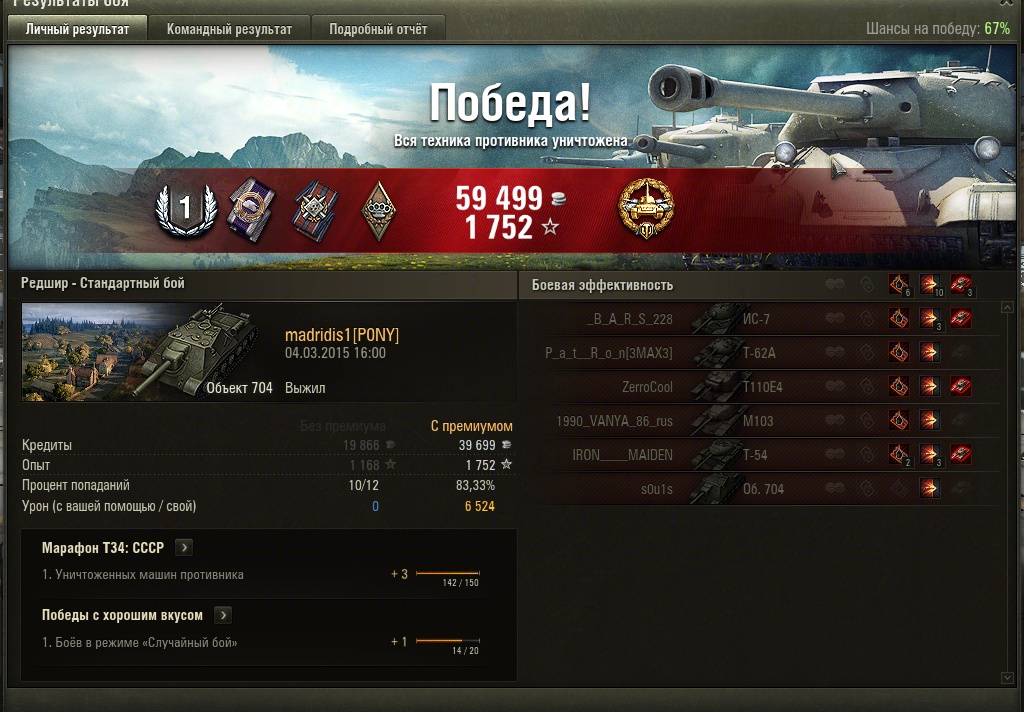 Короче я тут с горя решил написать на форум короче мне осталась 1 задача до 55 а,у меня только есть обьект 704,и нужно было нанести 6к дамага и убить 3 танка выполнял боев 60 никака не ишло чуть не хватало и вообще трудное задание для 704 и тут в первом бою игровой сессии днем я выполнил задачу и что вы думаете после боя мне ничего не написали меня обманули если бы это была задача легкая или с неправильными условиями ладно но тут же все просто нанес дамаг убил танки,но причина я думаю в баганутости у меня почти всегда в первых боях после открытия клиента не отображались задачи окошко было пусто и тут нате я в первом бою выполняют а мне говорят давай досвидания вот так ребята не буду вообще выполнять эти задачи пойду марафон на т 34 делать надеюсь там хоть не обманут на пикселя
