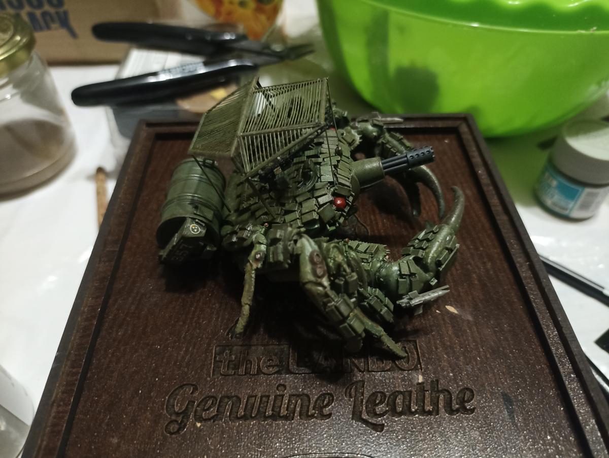 2. Волею случая попал мне в руки высушенный черноморский краб - популярный сувенир. Усеивавшие его панцирь ракушки балянусов напомнили мне точки крепления. И понеслось... У нас был 1 краб, 3 листа остатков травла, 75 донорских деталей, 5 пакетов дополнений в 72 и 48, полбанки пигментов и гора шпатлёвки, акрила, напильников, запчастей и всего такого, всех цветов и масштабов, а ещё литр суперклея, литр грунта, коробок кошачьих усов, пол-килограмма "Контакта" и две дюжины иголок от шприцов. Не то чтобы это всё было нужно для сборки, но раз начал делать фантастику, то иди в своём увлечении до конца. Единственное, что меня беспокоило — это "Контакт". В мире нет никого более беспомощного, безответственного и безнравственного, чем человек, ищущий, что бы ещё обвесить динамической защитой. И я знал, что довольно скоро мы в это окунёмся. В качестве "главного калибра" было выбрано орудие GAU-8 в 1/48 от "Э.В.М" (как и многие другие, смотревшие в детстве хоть один фильм со Шварценеггером, питаю особое отношение к оружию с вращающимся блоком стволов. Никто не сделал для фетишизации схемы Гатлинга столько, сколько добрый дедушка Кэмерон). Пересчëт из 1/48 в 1/72 дал калибр 45 мм, хорошо знакомый отечественной артиллерии.Донорами деталей также стали звездовские Т-72Б3 и Ми-24 в 1/72, Е-100 в том же 72 от Modelcollect и звездовский Т-90 в 1/35.А дальше в дело пошли продукты SG modelling. Были добавлены:— блоки ДЗ "Контакт-1" 1/72 - 2 набора,— габаритные огни ГСТ-64 1/72 - 1 набор,— "Тучи" 1/72 - 1 набор,— Решëтка на башню 1/72 - 1 шт.,— ПТУР "Малютка" 1/72 - 1 набор, — Декаль флага - 1 шт., — Кошачий ус в качестве флагштока. Окраска - акрилы Mr.Hobby и различные жидкости от AK и MIG.Благодарю за внимание!