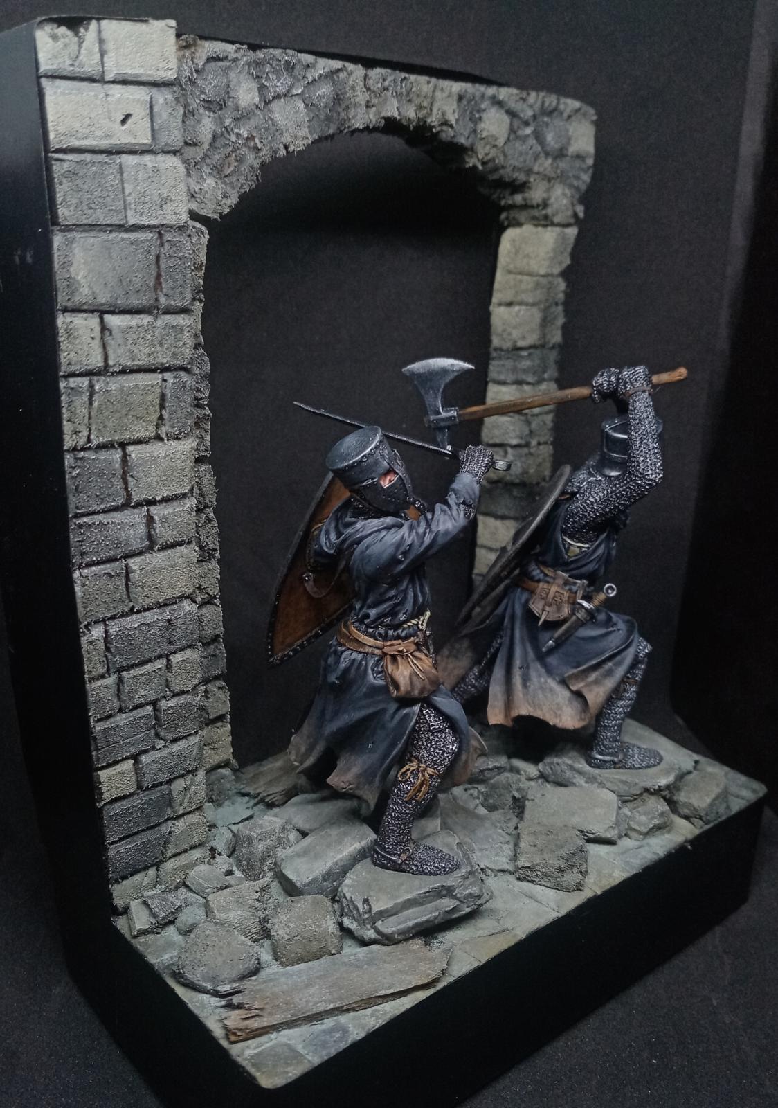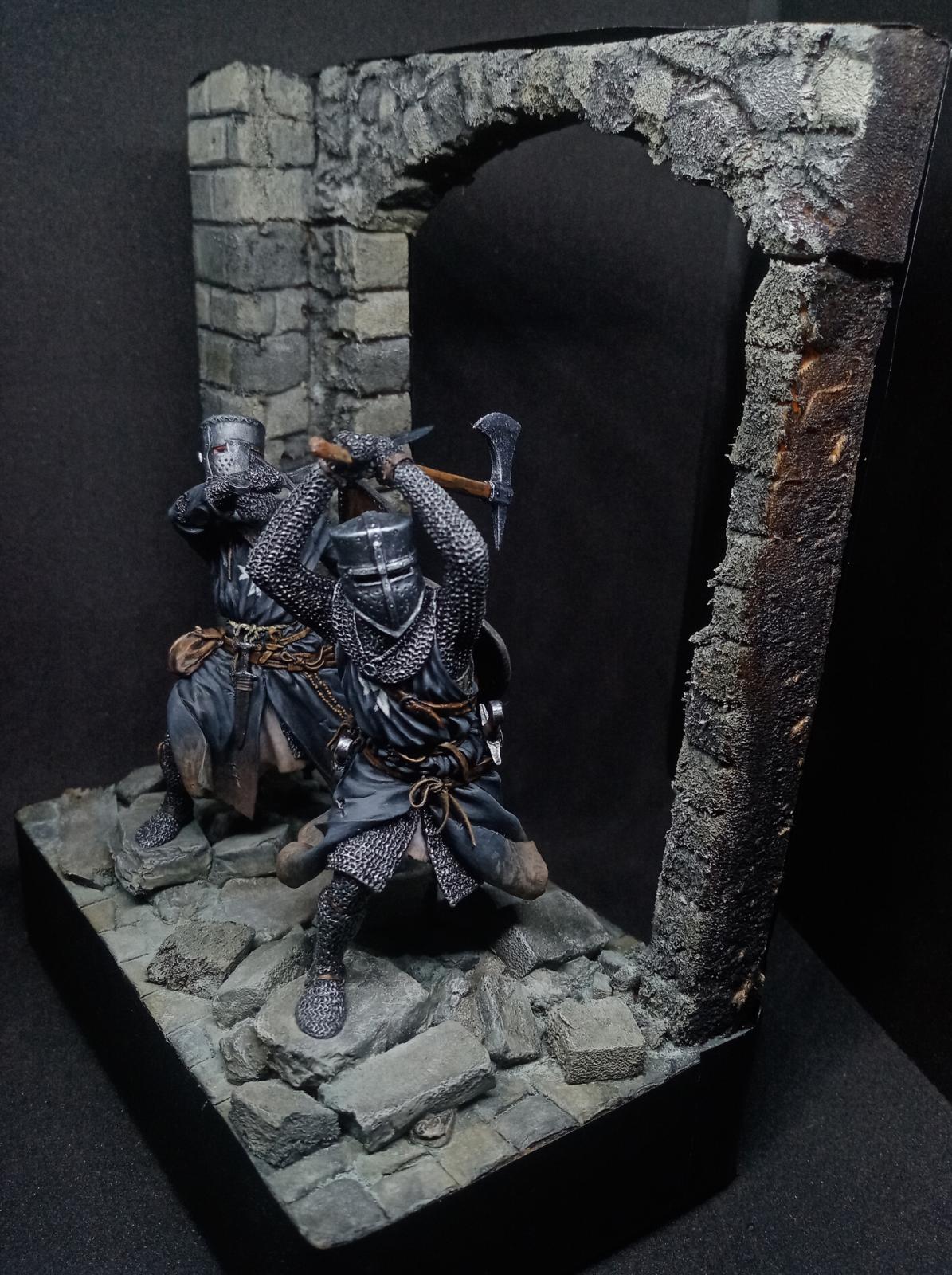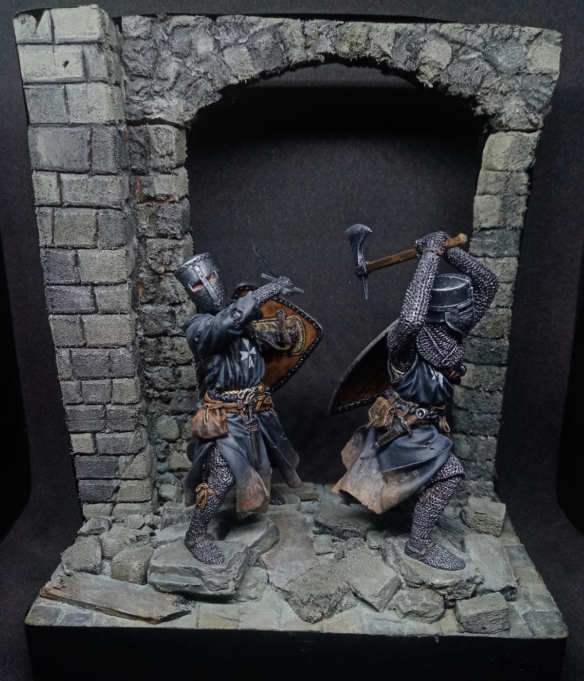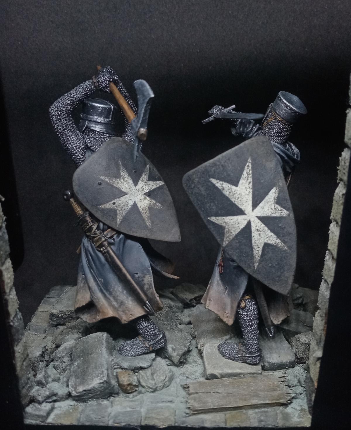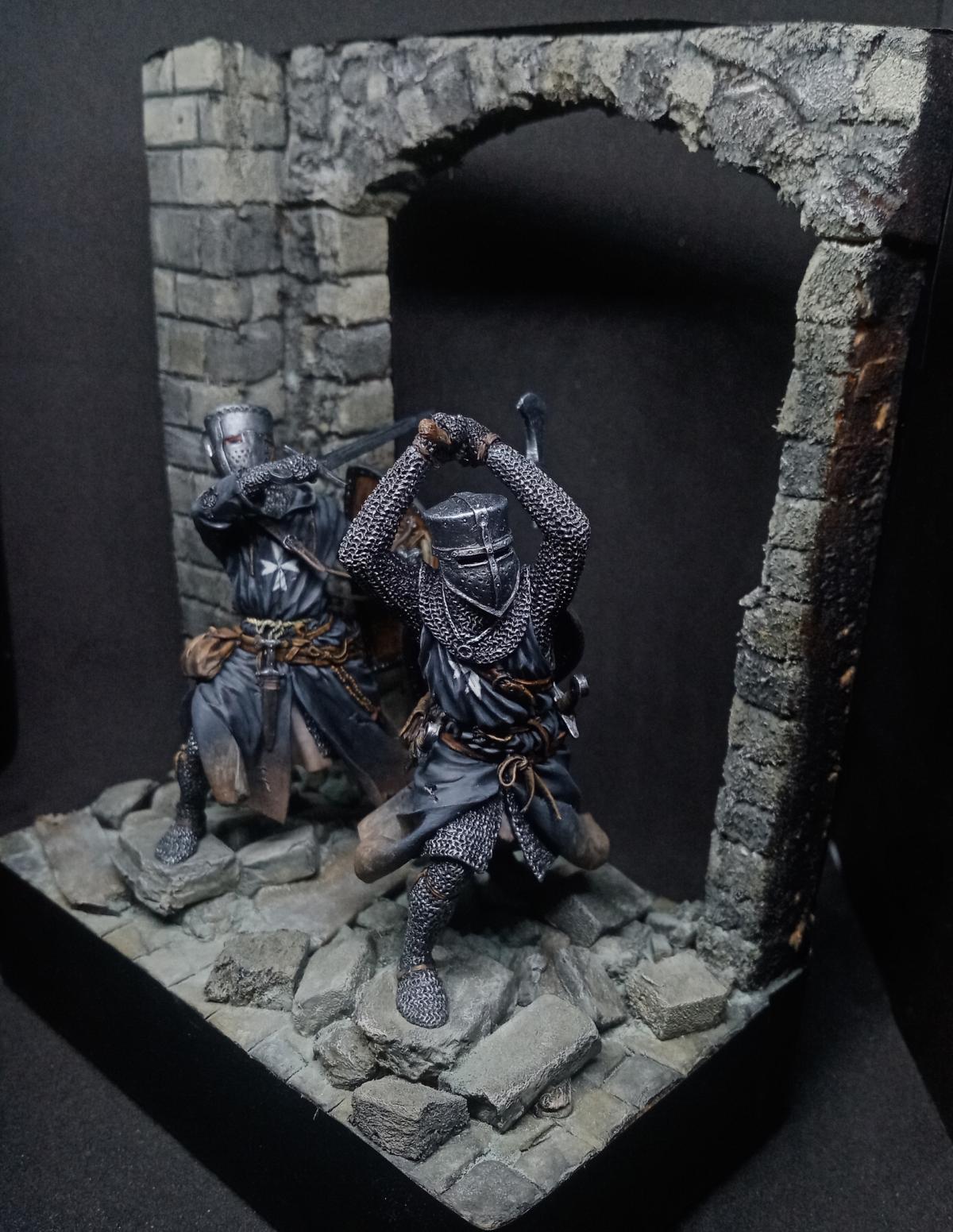 Два брата госпитальера от "Мedieval Forge" и "Altores studio". 75мм. Подставка самодельная, изготовлена из пеноплекса и кусков линейки.)) Сначала задумывались как фрагмент диорамы, но из-за отсутствия на то время подходящих противников в виде арабов, они удостоились чести стоять отдельно. сейчас уже есть подходящих фигур, так что возможно будет продолжение.