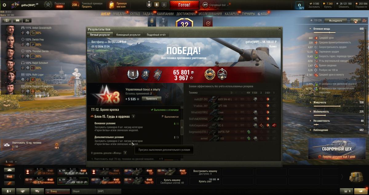 получилось таки сделать на вк100.01р, буквально на крапалях последнее оттанковал и добил противника и далее уже по засвету работа- 9 121 ответ