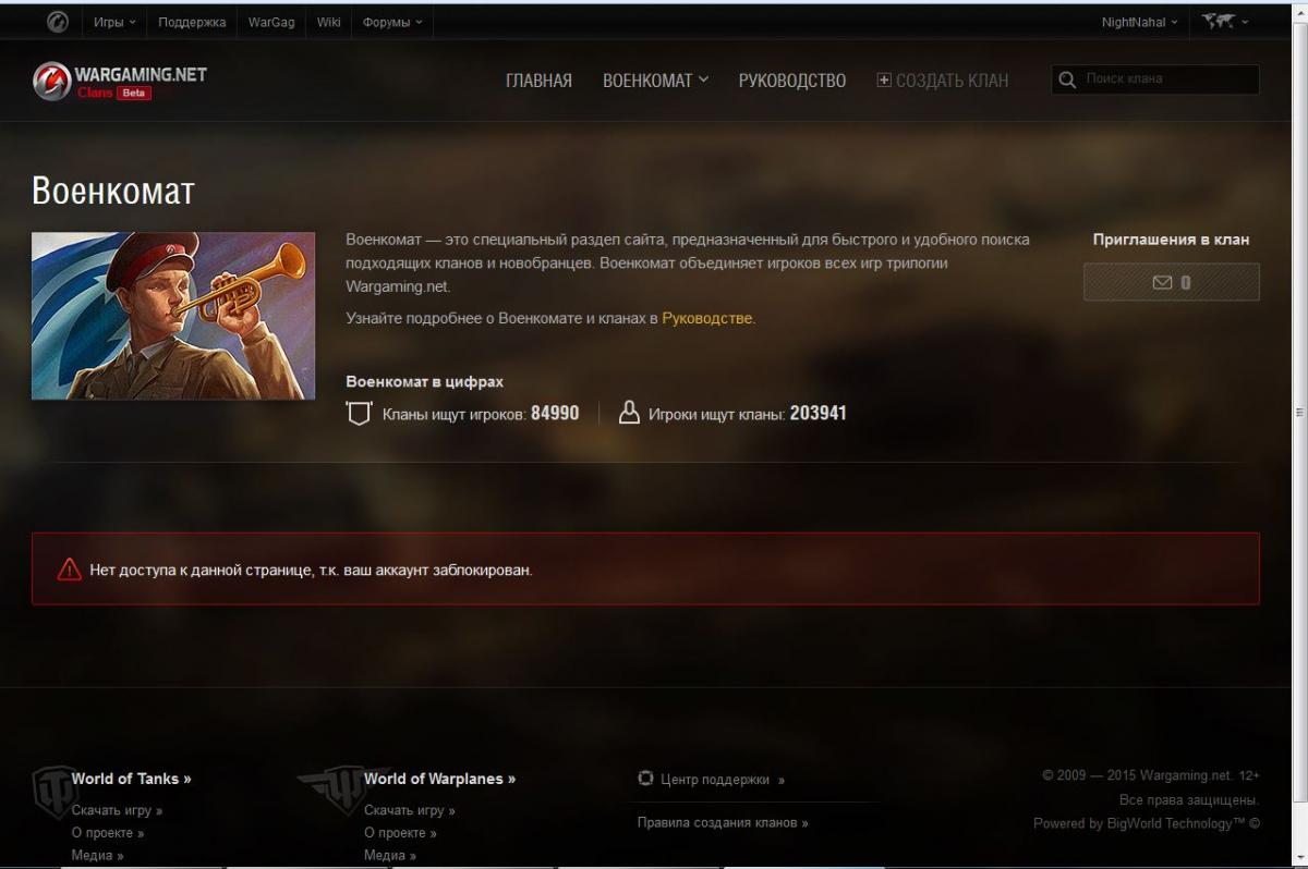 Здравствуйте. Столкнулся с проблемой, решил найти клан на http://ru.wargaming.net/clans/ , ну и заодно глянуть моё личное дело, нажимаю "Редактировать моё личное дело" а мне выскакивает надпись "Нет доступа к данной странице, т.к. ваш аккаунт заблокирован." Но вроде бы ничего не заблокировано, играю свободно, да и не за что меня было блокировать, ничего не нарушал... Так же жму "Перейти в военкомат" пишет тоже самое "Нет доступа к данной странице, т.к. ваш аккаунт заблокирован." Помогите разобраться с данной проблемой.