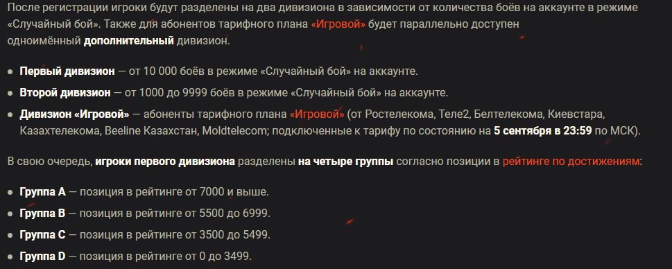 Ребята для тех кто в танке поясните на изображении говорится о дополнительном дивизионе для абонентов "Игровой".У меня тариф Игровой,но что-то я дивизиона у себя этого не вижу.В боевой задаче говорится что я нахожусь в 1-м Дивизионе группа В.Или он этот "дополнительный"дивизион виртуальный.Задача откатать 30 боёв и результаты этих боёв будут применятся для Игрового дивизиона?Я запутался.Кто,что знает. п.с ЦПП по старой заявке пока молчит,позже дополню п.п.с Глаза раззул и сам разобрался)))Виртуальный дивизион