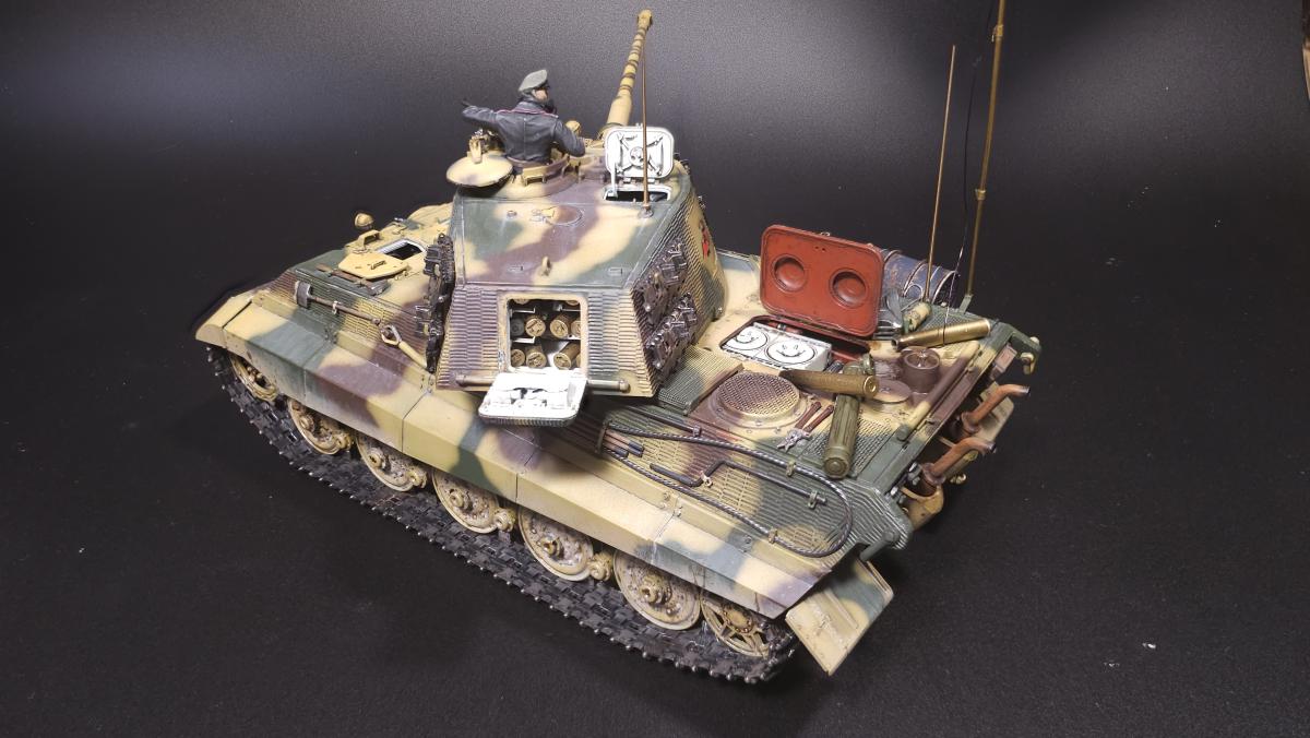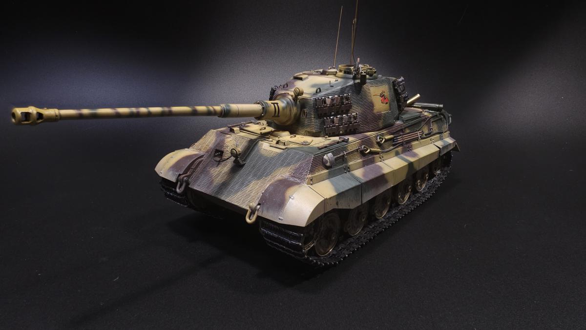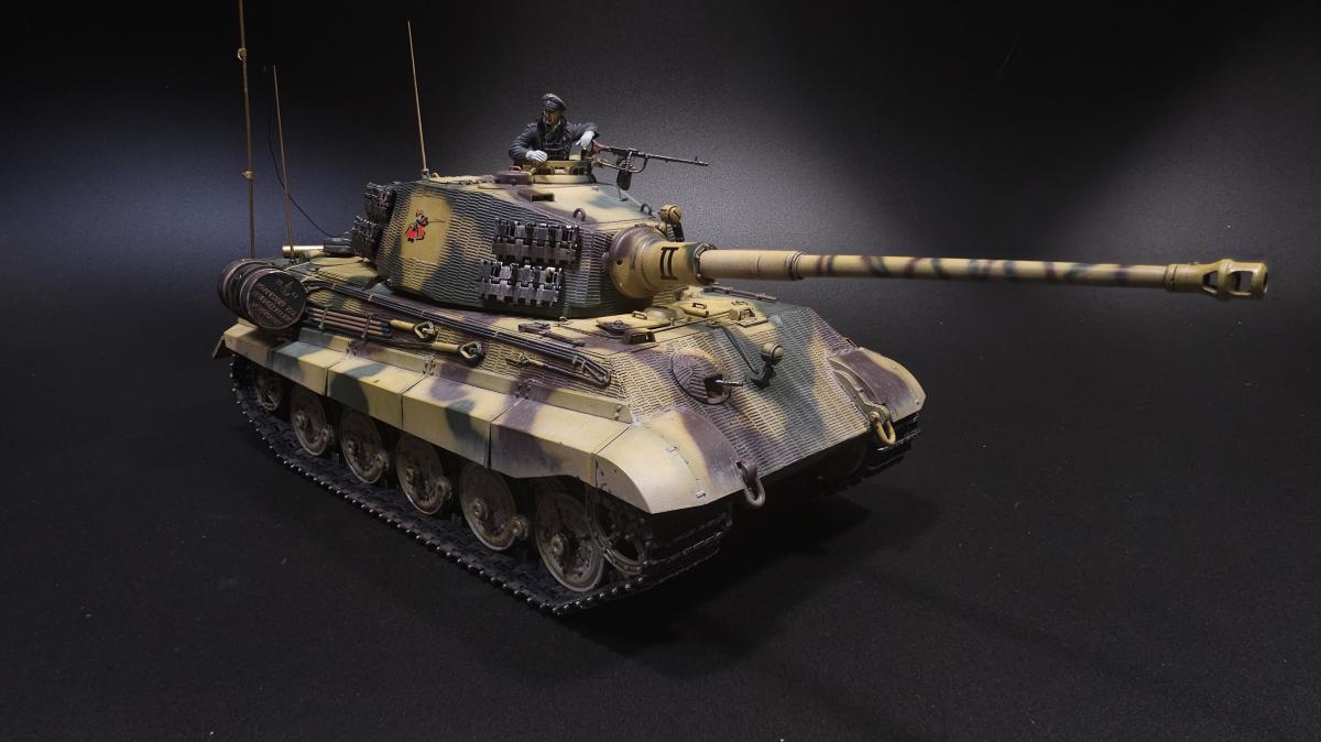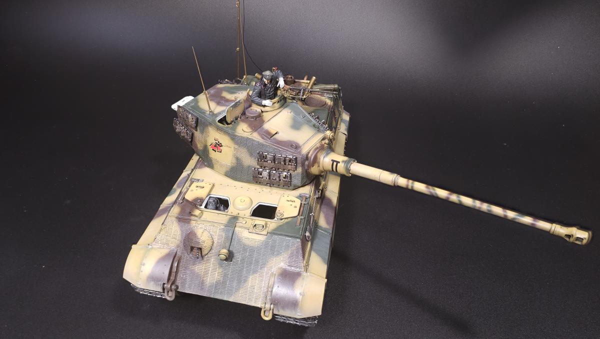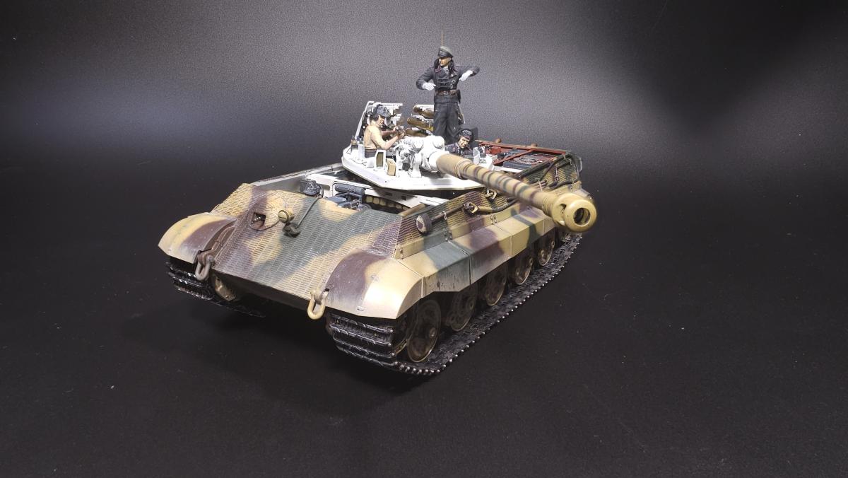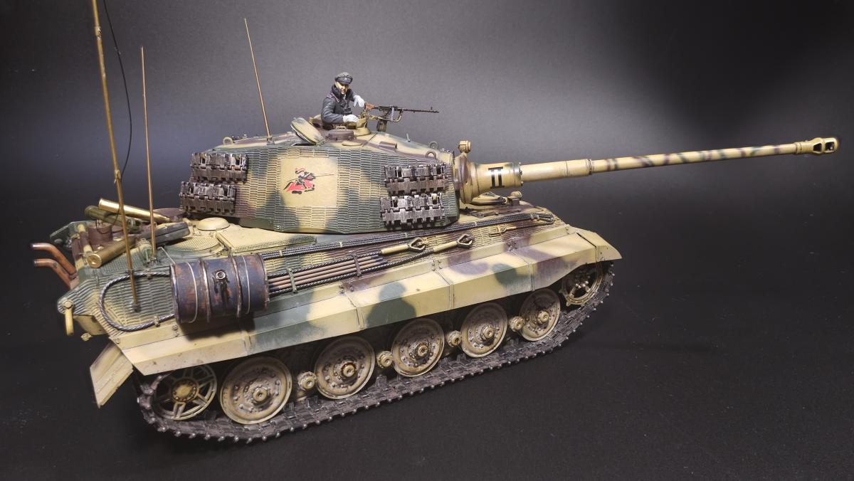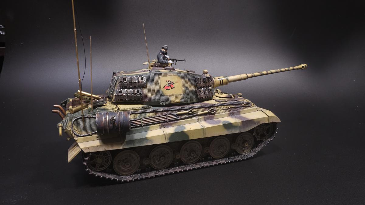 Sd.kfz. 267 Panzerkampfwagen VI Ausf. BМасштаб: 1/35Производитель: Meng (и куча допов) Модель представляет собой коммандирскую версию Королевского тигра в варианте для взаимодействия с наземными войсками(Sd.kfz. 267 по сквозной нумерации вермахта).От обычной машины отличается наличием дополнительного комплекта радиооборудования, наличием автономного генератора и уменьшенным боекомплектом.Соответственно, базовая модель дополнена необходимым антенным оборудованием, комплектом Fu.8 и генератором. Набор антенн взял от Lanmo, генератор от Riich, приемники, передатчики и умформеры взять из наборов Takom и Amusing.Также использовался набор интерьера, рабочие траки и подвеска от Meng, фототравленные юбки от Микродизайн.Члены экипажа взяты из набора Masterbox, туловище командира взято из набора Tamiya, ноги от изкоробочного танкиста Meng.В целом набор оказался приятным, трудности в основном были вызваны перепилом внутреннего оборудования. Очень разочаровали рабочие торсионы, большая часть из них у меня просто обломалась по непонятным причинам, ещё на этапе покраски, когда машина на подвеску даже не опиралась. При этом торсионы именно обломало, а не скрутило, слом выглядит как на аналогично обломанном куске метала. Возможно, торсионы из набора рабочей подвески были бы лучше, но на этапе сборки визуально и тактично между ними отличий не нашел, а потом менять уже было поздно по причине собранного интерьера.Также стоит отметить, что экипаж от Мастербокс не сильно подходит к этой модели, и если наводчика и мехвода удалось впихнуть, то радист полноценно не влез и люк за ним полностью не закрывается.При постройке использовались краски и химия от Ганзы, Тамии и Джима, Микроскейл, АК, Аммо.