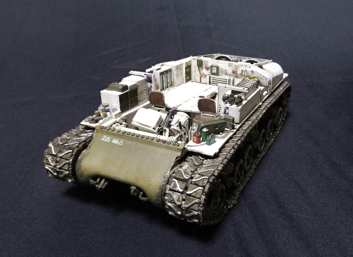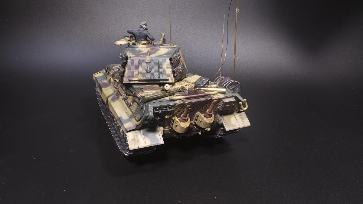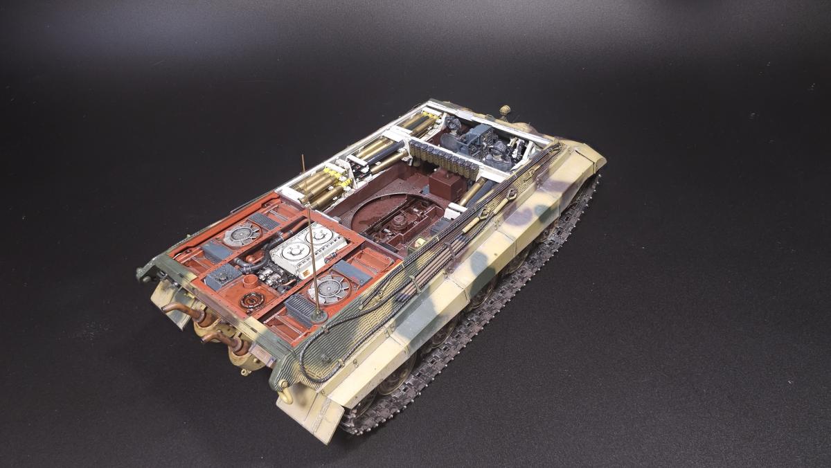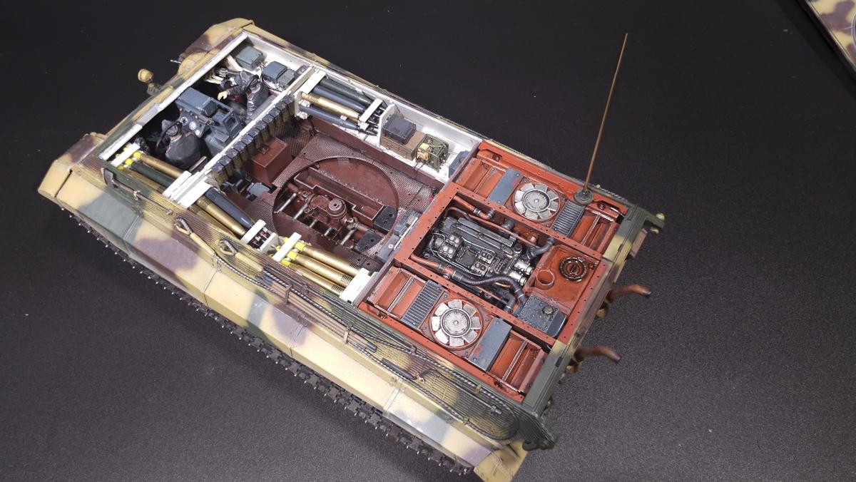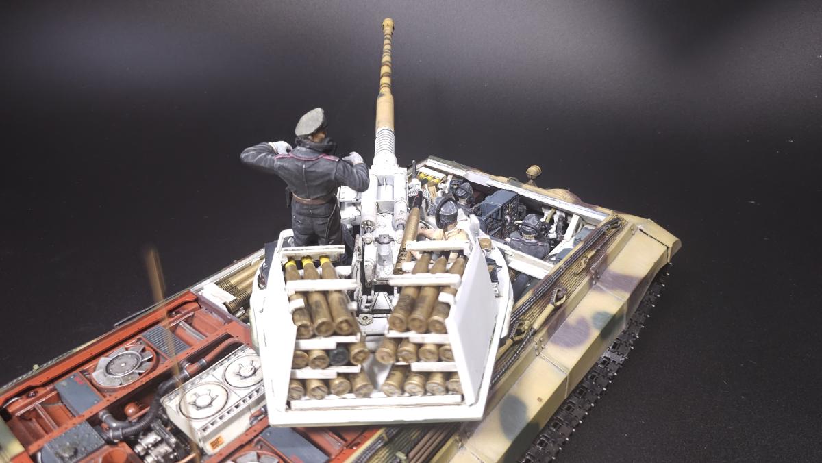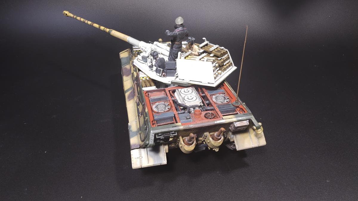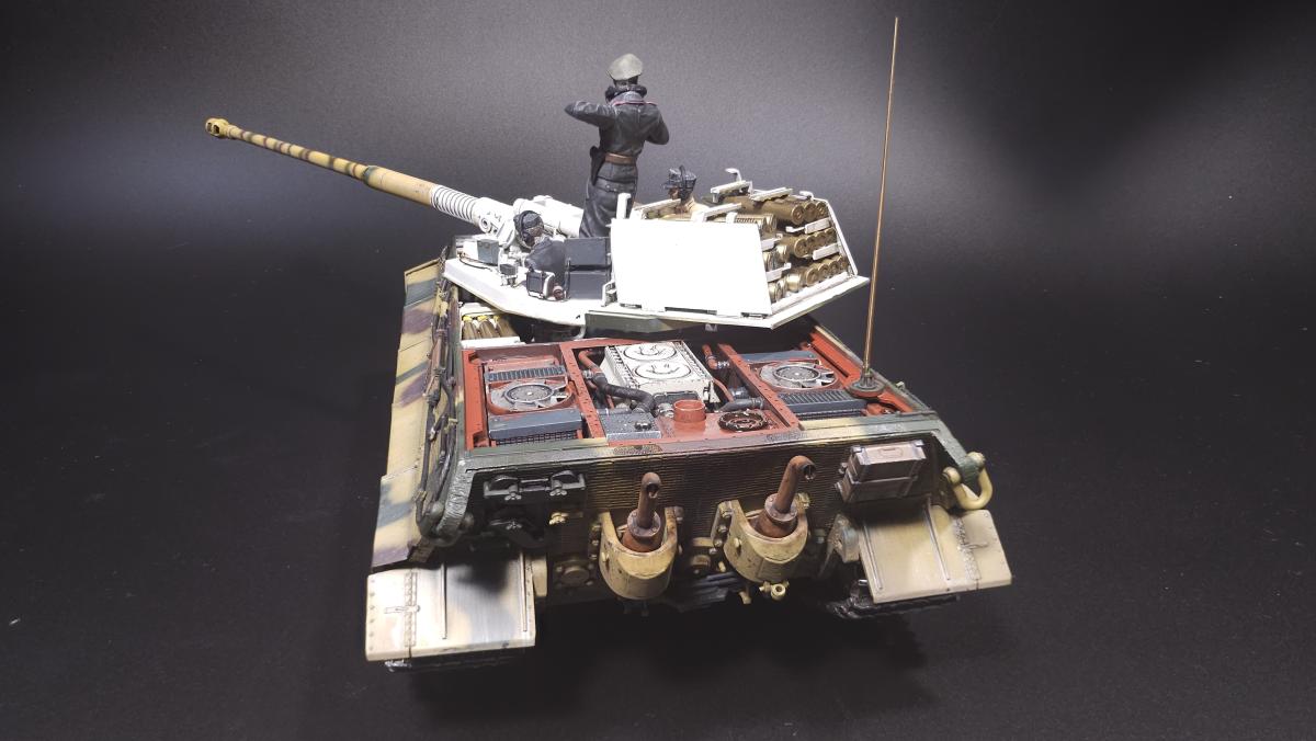 Sd.kfz. 267 Panzerkampfwagen VI Ausf. BМасштаб: 1/35Производитель: Meng (и куча допов) Модель представляет собой коммандирскую версию Королевского тигра в варианте для взаимодействия с наземными войсками(Sd.kfz. 267 по сквозной нумерации вермахта).От обычной машины отличается наличием дополнительного комплекта радиооборудования, наличием автономного генератора и уменьшенным боекомплектом.Соответственно, базовая модель дополнена необходимым антенным оборудованием, комплектом Fu.8 и генератором. Набор антенн взял от Lanmo, генератор от Riich, приемники, передатчики и умформеры взять из наборов Takom и Amusing.Также использовался набор интерьера, рабочие траки и подвеска от Meng, фототравленные юбки от Микродизайн.Члены экипажа взяты из набора Masterbox, туловище командира взято из набора Tamiya, ноги от изкоробочного танкиста Meng.В целом набор оказался приятным, трудности в основном были вызваны перепилом внутреннего оборудования. Очень разочаровали рабочие торсионы, большая часть из них у меня просто обломалась по непонятным причинам, ещё на этапе покраски, когда машина на подвеску даже не опиралась. При этом торсионы именно обломало, а не скрутило, слом выглядит как на аналогично обломанном куске метала. Возможно, торсионы из набора рабочей подвески были бы лучше, но на этапе сборки визуально и тактично между ними отличий не нашел, а потом менять уже было поздно по причине собранного интерьера.Также стоит отметить, что экипаж от Мастербокс не сильно подходит к этой модели, и если наводчика и мехвода удалось впихнуть, то радист полноценно не влез и люк за ним полностью не закрывается.При постройке использовались краски и химия от Ганзы, Тамии и Джима, Микроскейл, АК, Аммо.