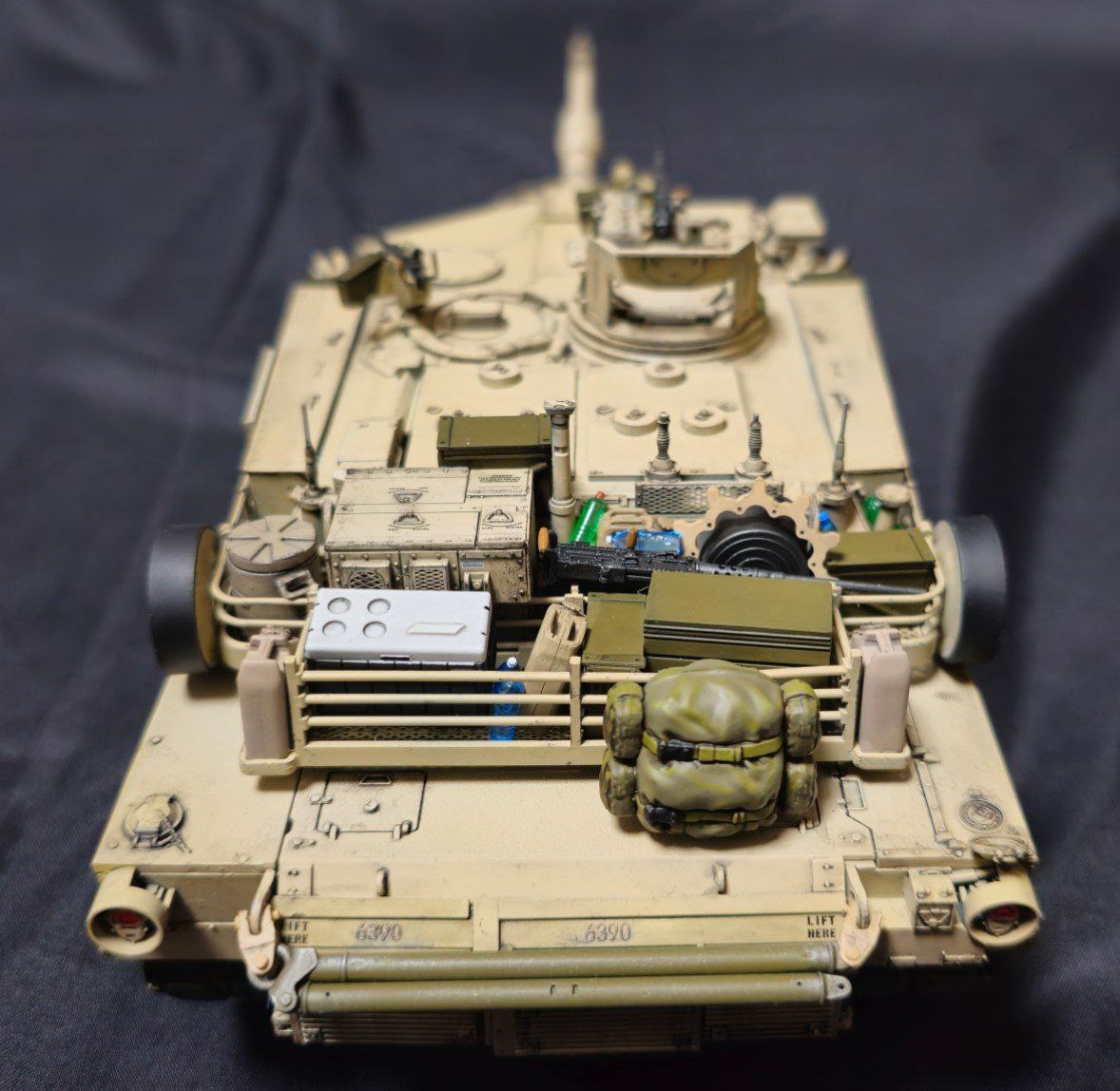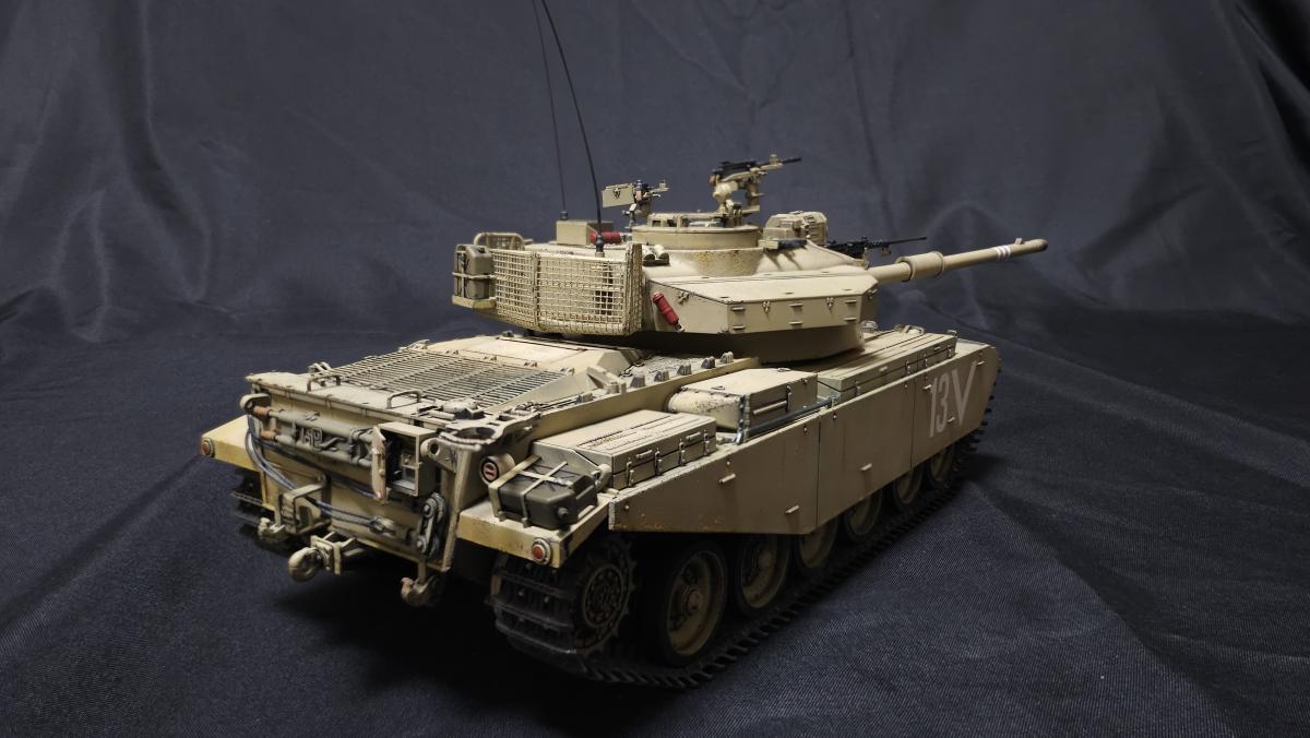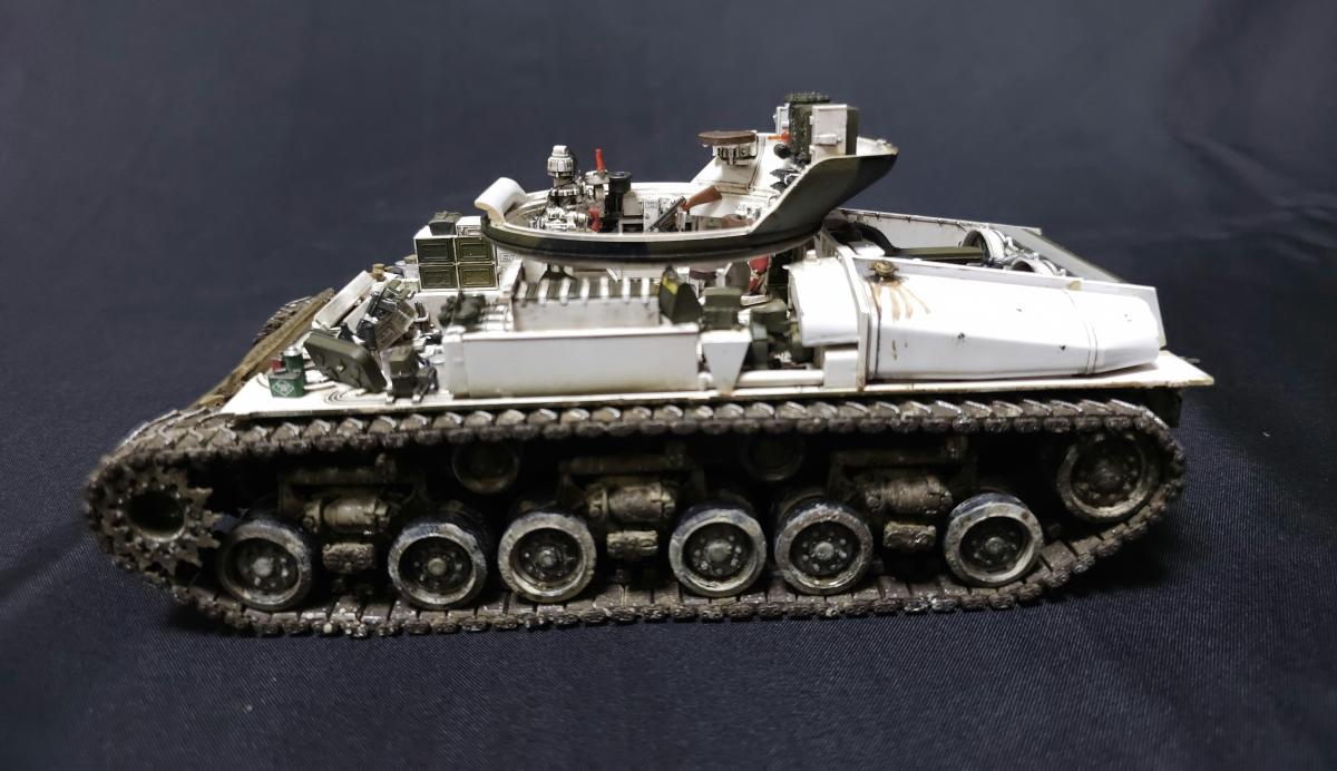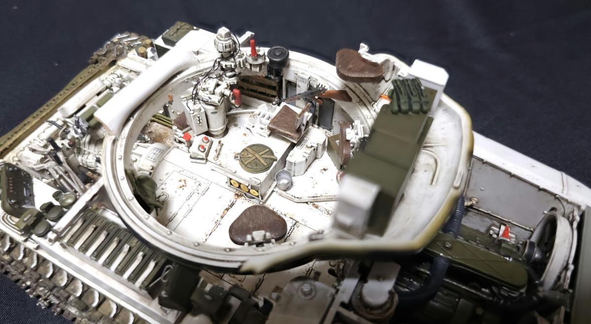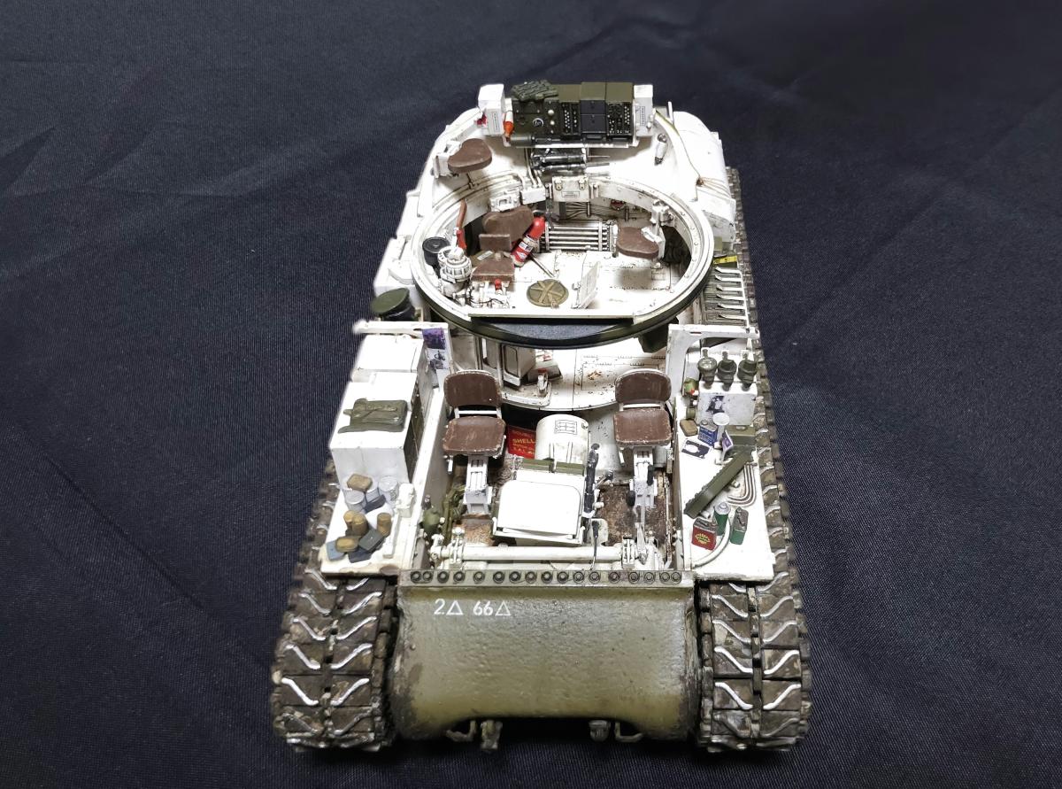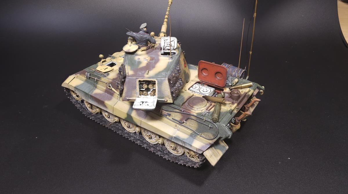 Sd.kfz. 267 Panzerkampfwagen VI Ausf. BМасштаб: 1/35Производитель: Meng (и куча допов) Модель представляет собой коммандирскую версию Королевского тигра в варианте для взаимодействия с наземными войсками(Sd.kfz. 267 по сквозной нумерации вермахта).От обычной машины отличается наличием дополнительного комплекта радиооборудования, наличием автономного генератора и уменьшенным боекомплектом.Соответственно, базовая модель дополнена необходимым антенным оборудованием, комплектом Fu.8 и генератором. Набор антенн взял от Lanmo, генератор от Riich, приемники, передатчики и умформеры взять из наборов Takom и Amusing.Также использовался набор интерьера, рабочие траки и подвеска от Meng, фототравленные юбки от Микродизайн.Члены экипажа взяты из набора Masterbox, туловище командира взято из набора Tamiya, ноги от изкоробочного танкиста Meng.В целом набор оказался приятным, трудности в основном были вызваны перепилом внутреннего оборудования. Очень разочаровали рабочие торсионы, большая часть из них у меня просто обломалась по непонятным причинам, ещё на этапе покраски, когда машина на подвеску даже не опиралась. При этом торсионы именно обломало, а не скрутило, слом выглядит как на аналогично обломанном куске метала. Возможно, торсионы из набора рабочей подвески были бы лучше, но на этапе сборки визуально и тактично между ними отличий не нашел, а потом менять уже было поздно по причине собранного интерьера.Также стоит отметить, что экипаж от Мастербокс не сильно подходит к этой модели, и если наводчика и мехвода удалось впихнуть, то радист полноценно не влез и люк за ним полностью не закрывается.При постройке использовались краски и химия от Ганзы, Тамии и Джима, Микроскейл, АК, Аммо.