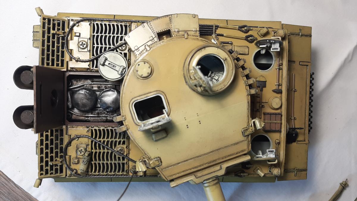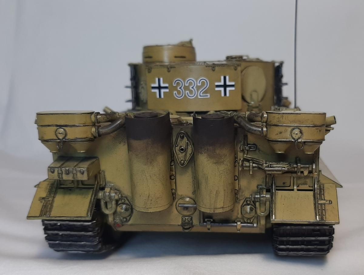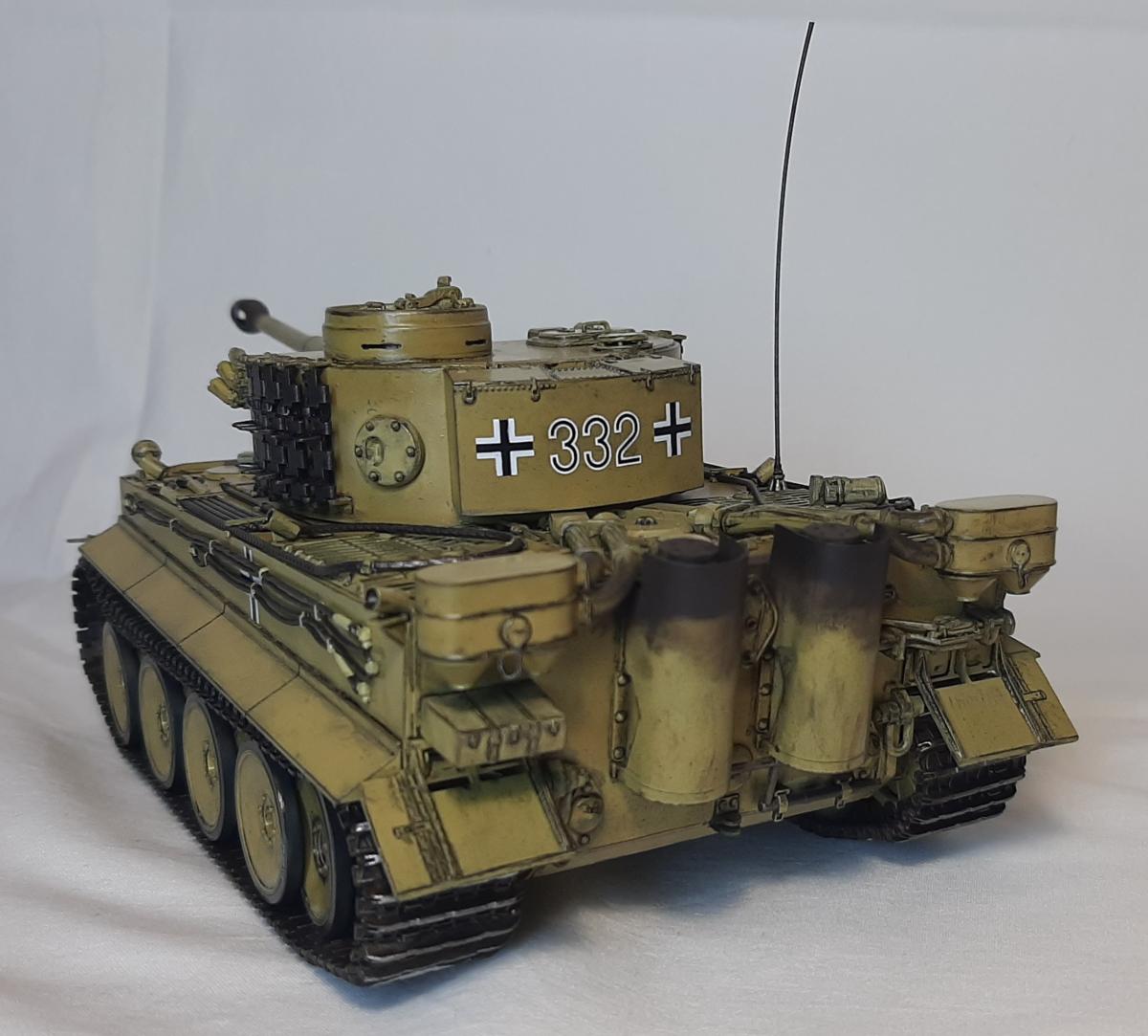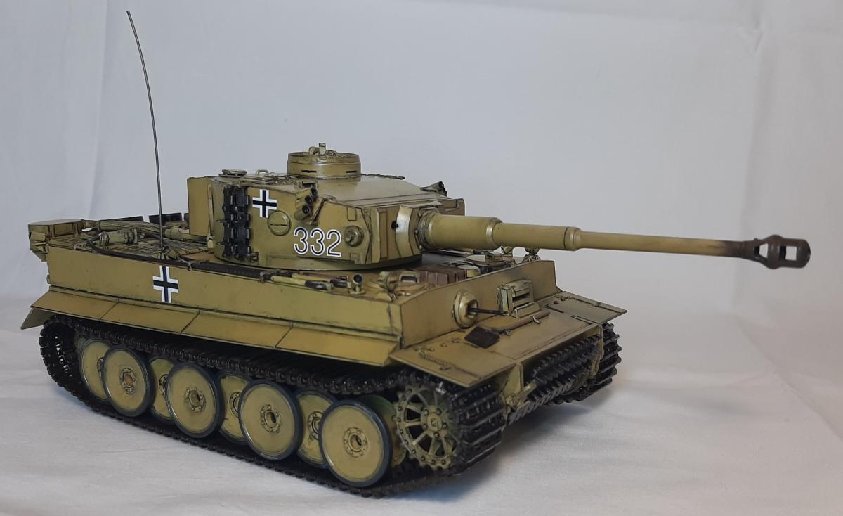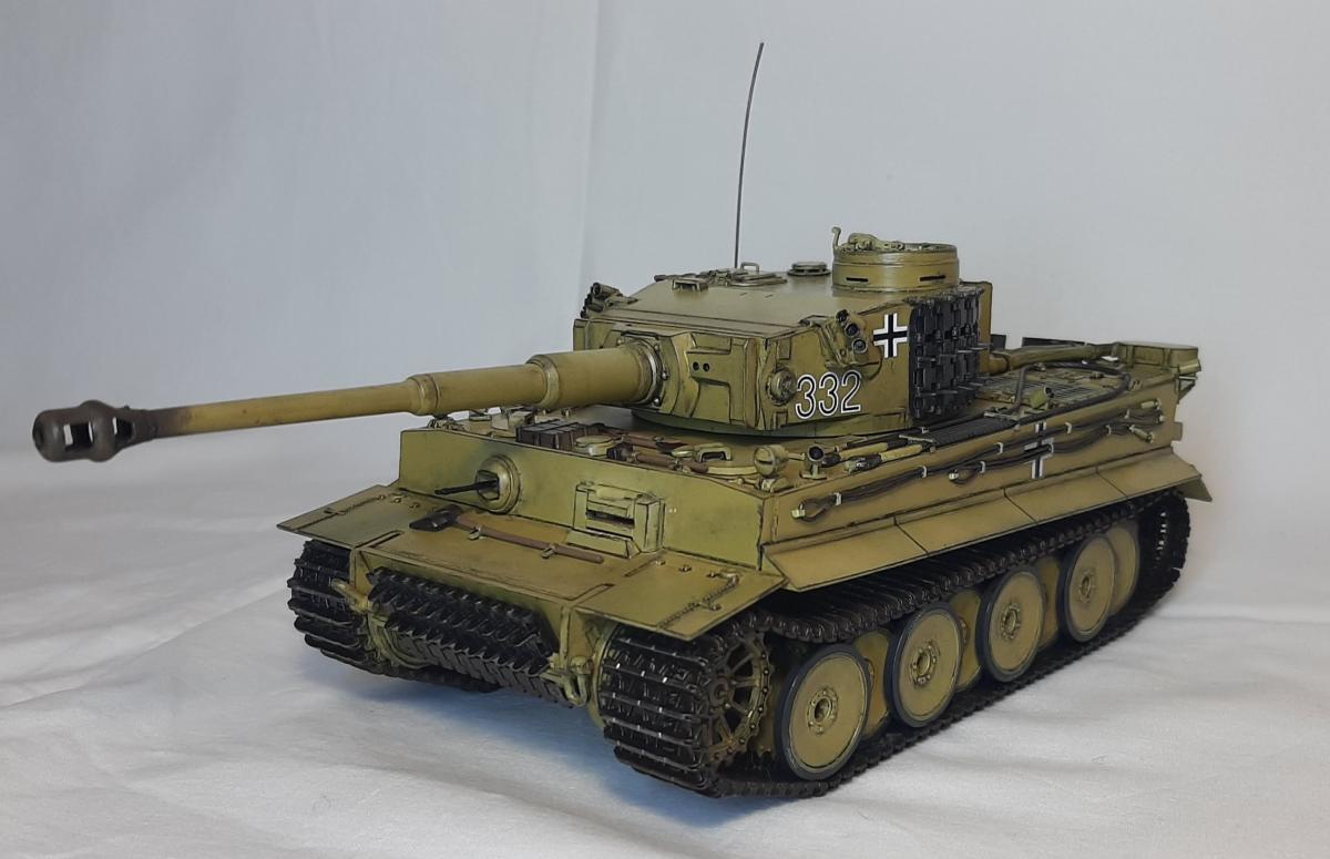 Pz.Kpfw VI (Sd.Kfz181) Ausf.H1 "Tiger" Производитель: Звезда Масштаб: 1/35 За примерный прототип Звездой взят Тигр выпуска примерно с марта 43 (начиная с заводского номера 250184) до мая 43 (номер 250250 включительно) Кому интересны подробности заводских модификаций - могу дать ссылку на подробную статью Модель создана по мотивам Тигра с бортовым номером 332 из состава 503-го тяжелого танкового батальона вермахта (S.Pz.Abt. 503) с дополнительно установленными запасными траками на бортах башни и перенесенными номерами На модели сделаны открывающимися все люки, до которых можно было дотянуться Модель двигателя Maybach HL210P45 - кривенький самопал из пеноплекса и литников Фильтры Feifel сделаны съемными для открытия люка МТО Высверлены дымовые гранатометы на корпусе и патрубки воздухозаборника Антенна сделана из тянутого литника Использовались краски ганзы и джим скейл, масло сонет, смывка, лак и химия для декалей той же ганзы, пигменты хамброл, вайлдер и хома