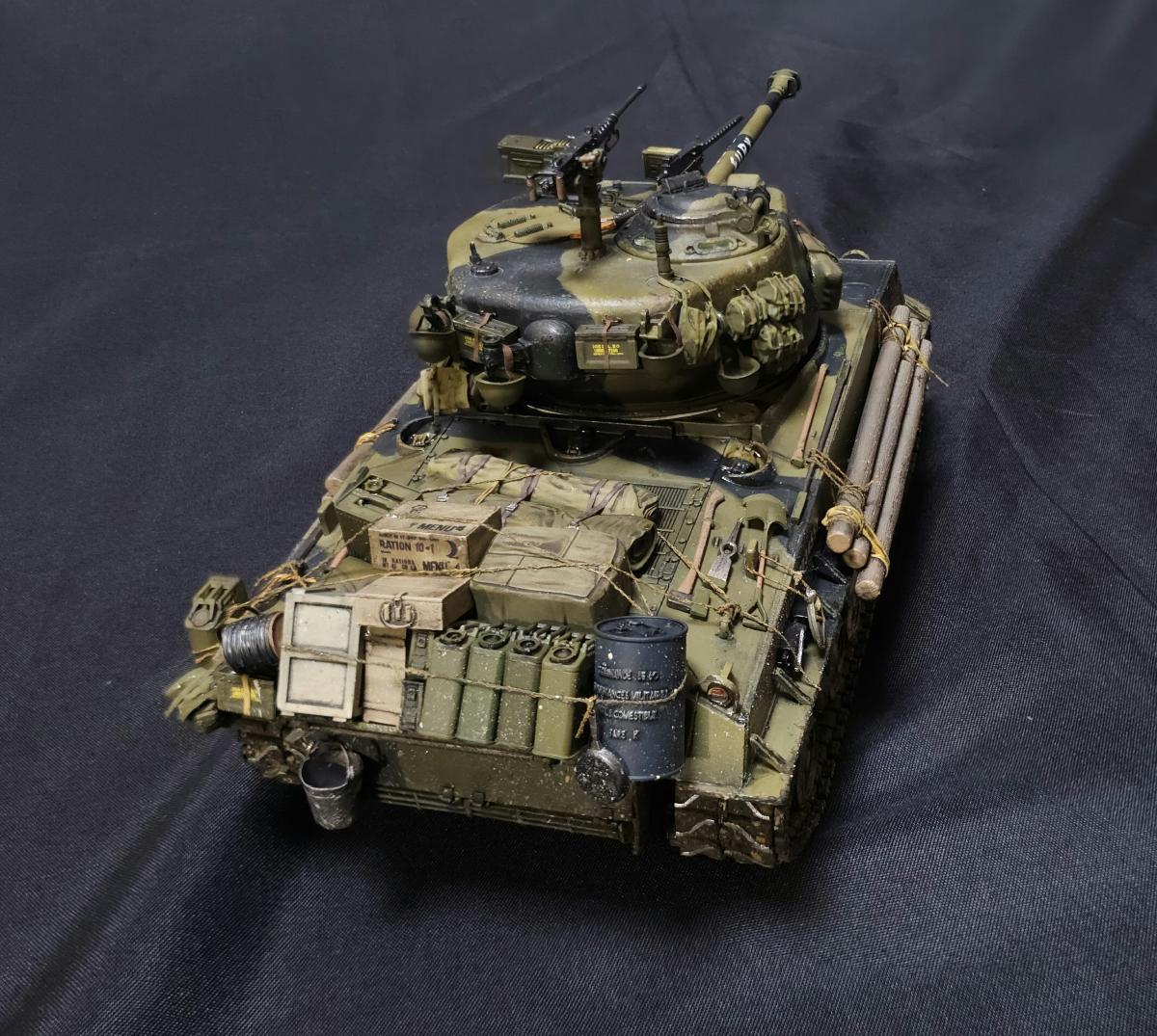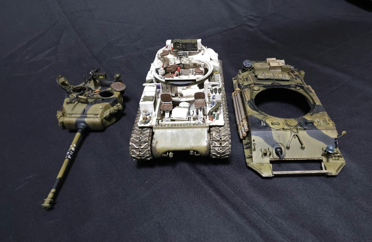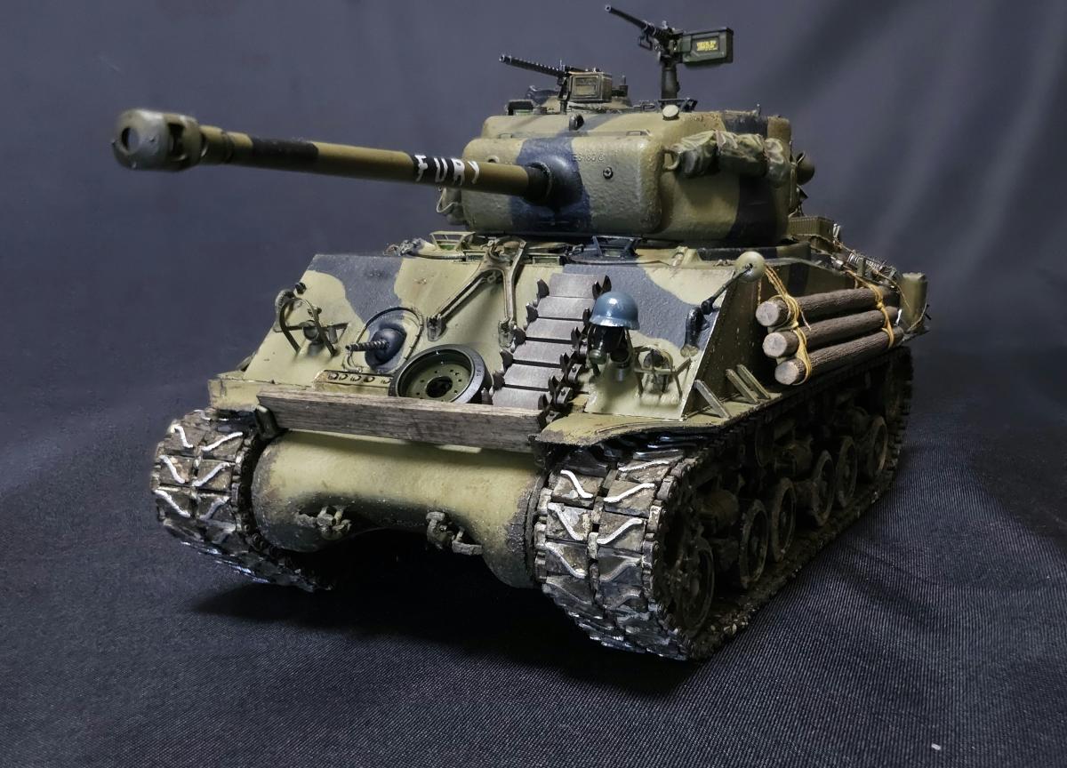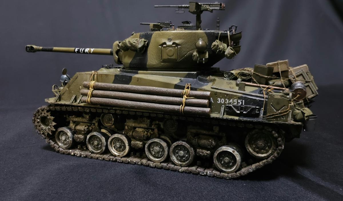 История, а точнее финал фильма создан по мотивам истории из мемуаров Белтона Купера "Смертельные ловушки", разве что в книге подобные события произошли в середине ноября 44, а в фильме в апреле 45. По соответствию прототипу из фильма: Обвес полноценно воспроизвести не удалось, но в целом довольно похоже, предположим что у меня Фьюри взят за пару недель до событий фильма Частично детали обвеса взяты из модельки Фьюри из картофельных танчиков, частично из нового Шермана от Border, из барахла, что шло в комплекте с Шерманом РФМ и ещё из всяких наборов с мелочевкой В фильме на танке установлены траки Т84, но фактически это траки от М46 Patton, и на машине в апреле 1945 устанавливаться никак не могли, поэтому на модели стоят T80, устанавливавшиеся с января 45 (ну а ещё они в коробке сразу идут) Внутри попытался отобразить все мелочи, которые бросились в глаза при просмотре фильма: - немецкую фуражку - немецкие медали - гранаты на верёвочке у командирского люка - бутылку ***, спрятанную рядом с радиостанцией, которую Дон достаёт перед боем на перекрёстке - М1А1 "Томпсон" Святоши - Штурмгевер Дона - фотографии Толстяка Декали бортовые номера и обозначения 66 танкового батальона 2 бронетанковой дивизии идут в наборе РФМ, и полностью соответствуют маркировке Фьюри в фильме, но при этом нет самой надписи на ствол. Почему - может быть какая-то фигня с авторскими правами (ага, китайцы и авторские права, конечно) Изначально были мысли докупить Фьюри от итальери, но откровенно говоря, там и обвес и декали ну очень кривые и с фильмом имеют ещё меньше общего, поэтому идея была отброшена и недостающие декали пришлось заказывать отдельно (спасибо Юрию Колокольникову, он мне из перерисовал с двух скриншотов из фильма, да и все остальные декали - его заслуга), вместе со всякими фоточками, которые засветились в фильме внутри танка Единственное - что во время фотографирования напрочь забыл про антенну, которая благополучно всю фотосессию пролежала на столе Но т.к. я очень ленивый, переснимать не хочу и просто поставил антенну на место после съёмки фото) По набору: в целом приятный, особых нареканий не припомню, разве что не совсем идеальная стыковка частей корпуса и башни между собой на сухую, для модели без интерьера не критично - все можно спокойно склеить, но вот для разборной интерьерки неприятно Ну и всё же хотелось бы видеть полноценные пружины в подвеске, как на Шермане с VVSS подвеской от тех же РФМ или Менга Касаемо снарядов возникли вопросы: 1. Почему даны 4 подкалиберных снаряда и только 2 фугасных? Почему бы не заменить пару довольно редких в реальности подкалиберных на фугасные, одни из основных снарядов? 2. Вопросы к набору декалей для боекомплекта. Во первых в набор входит 4 снаряда M62, но на них всего 3 декали на сам снаряд, на подкалиберный M93 аналогично. Почему так? При постройке использовались краски и химия от Ганзы, Тамии и Джима, Микроскейл, АК, Аммо, оилбрашеры 128