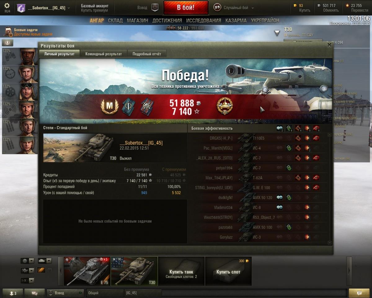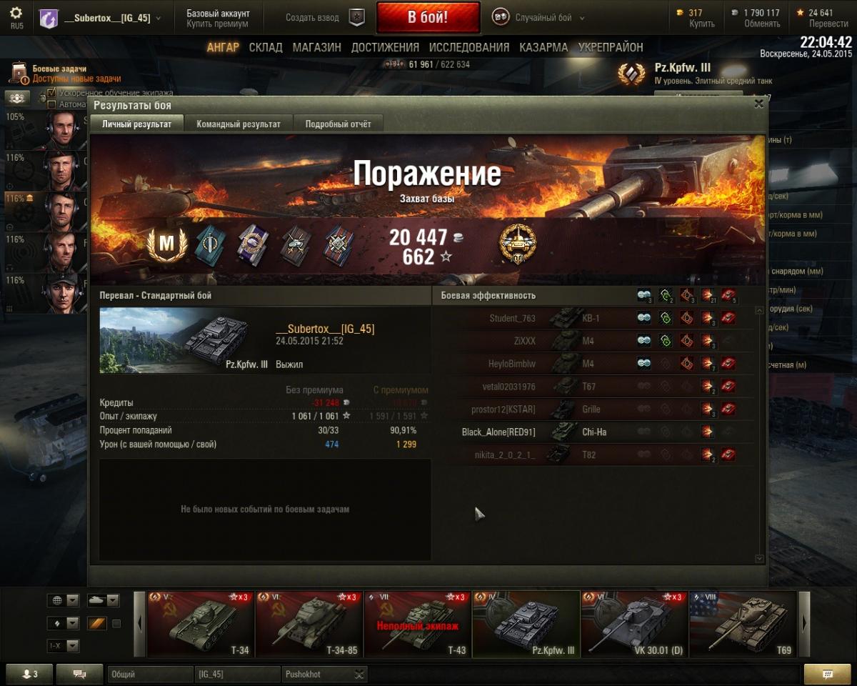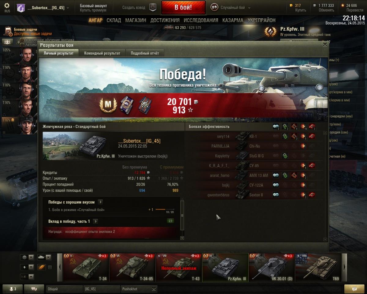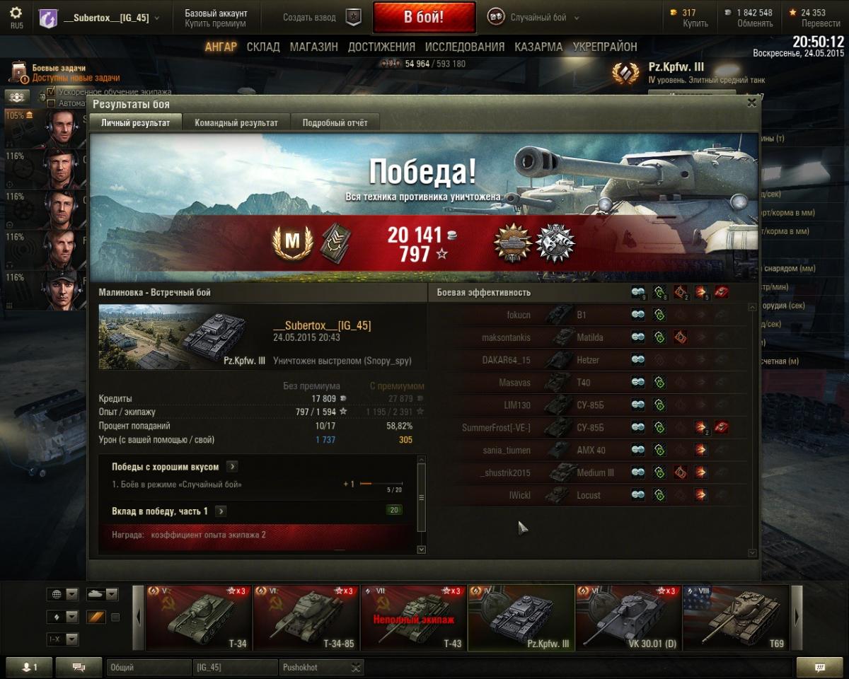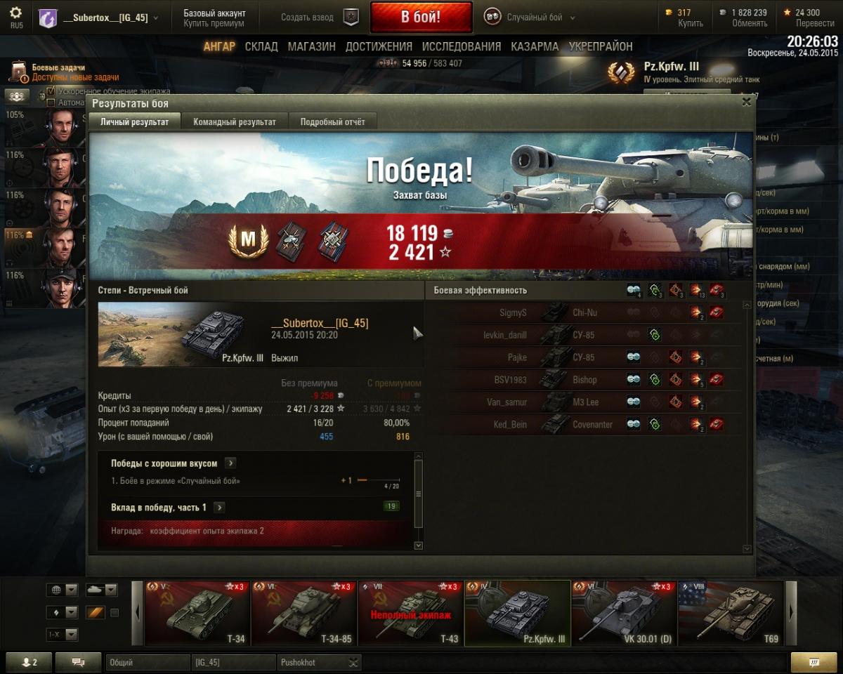 Мне танк то нравится, то не нравится. но в основном нравится. просто китайский ниндзя с бльшой базуккой, танк прекрасно светит в сочетании с маскировкой, оптикой и камуфляжем. из модулй на сей агрегат (миникопия Т54 =)) установил: - оптика; - приводы наводки; - вентиляция; досылатель конечно хочется поставить, но практическая скорострельность важнее теоретической, э то не первый танк на котором у меня нет досылателя а стоят модули увеличивающие точность и скорость сведения ведь одно попадание с пробитием лучше двух рикошетов, этому меня научил черчиль 2, в памяти 2 боя (у меня нет на черчиле досылателя и стоит вентиляция в дополнение приводам наводки) когда за бой удавалось поочереди перестрелять на средней дистанции 2х таких же вражеских черчилей. в то время как они рикошетили и не попадали 3 разая, я делал 2 уверенных пробития. так и на т34-1 вентиль и сведение дополняется боевым братством. лиш пару раз мне не хватило в бою скорострельности. А хороший обзор спасает каждый бой.