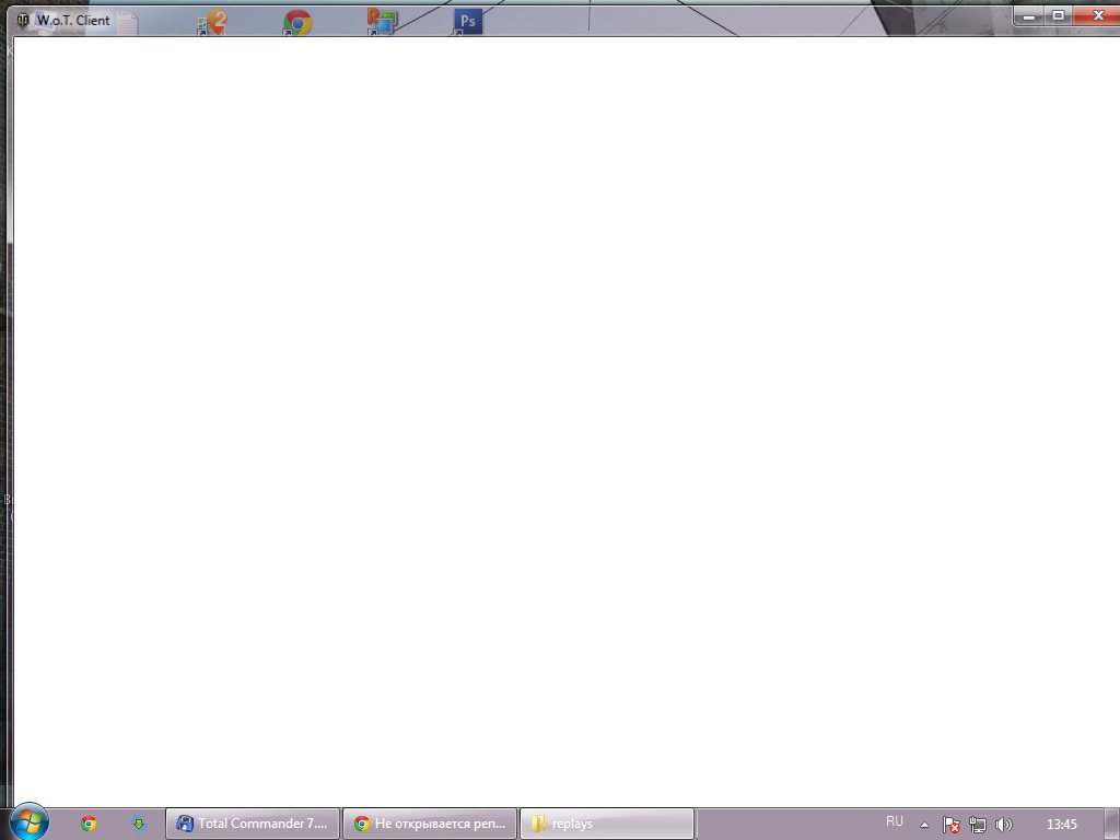 Не могу воспроизвести свежие реплеи, на долисекунды появляется окно танков и исчезает (Скрин окна сделать удалось, он прикреплен.) . Реплеи воспроизвожу при следующих условиях: 1. Игра и все прочие приложения закрыты 2. Игра без модов (играю без модификаций) Запускать пробовал двумя способами: {а) Двойным кликом на реплее.б) Нажмите правой кнопкой на реплей - выберите пункт "Открыть с помощью...". В открывшемся меню нажмите "Обзор..." и выберите исполнимый файл игры WorldOfTanks.exe. Так же сразу поставьте галочку "Всегда использовать данную программу для этого типа файлов" - после этого реплей можно будет запускать двойным щелчком мыши.в) Откройте рядом две папки - с файлом WorldOfTanks.exe и с реплеями. Схватите реплей мышкой и перетащите его на WorldOfTanks.exe. Отпустите. } P.S. Игра запускается и "играется" без нареканий.