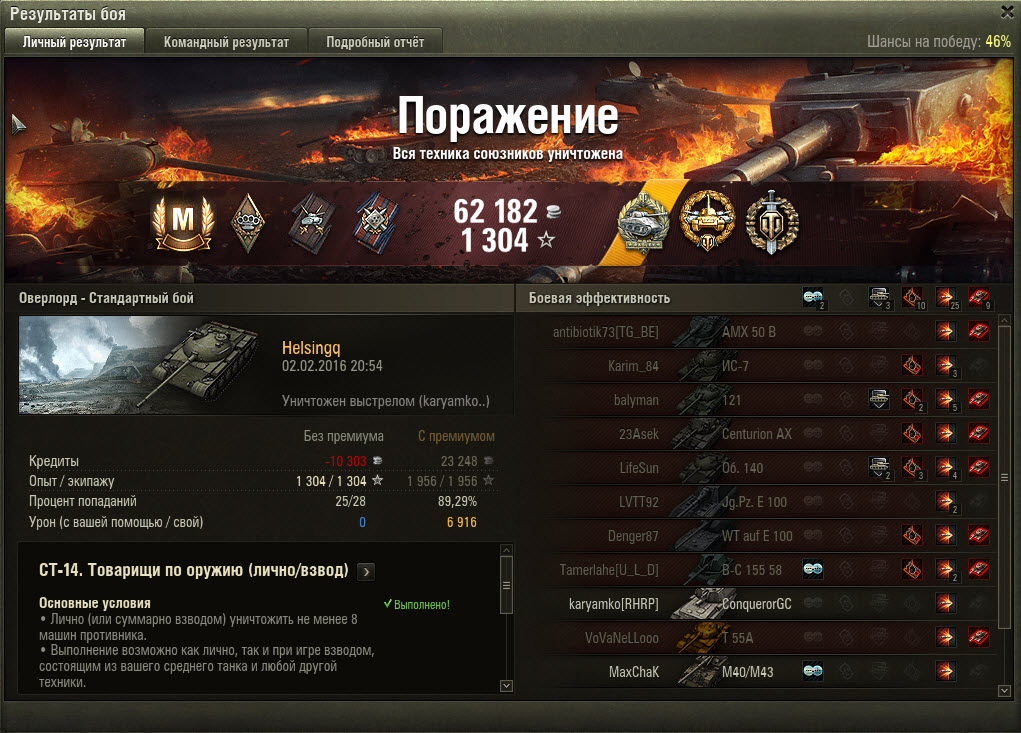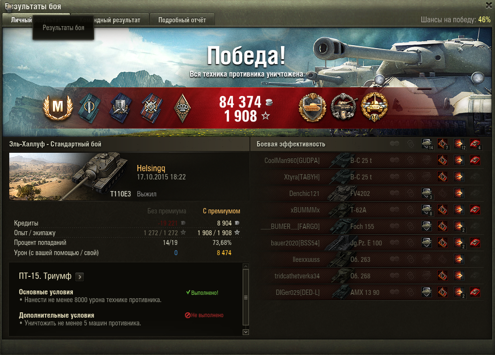 Собственно единственная ПТ10 - Т110Е3, которая все еще может показывать результат. задачу без отличия сделал давно, сейчас решил х2 снять, внезапно зашло с отличием. Теперь ЛТ, ПТ и СТ на все танки сделаны с отличием, получена 1 степень. http://wotreplays.ru/site/10114431#parizh-helsingq-t110e3 - реплей, 9600 дамага, 7 фрагов, 7000 заблокировано
